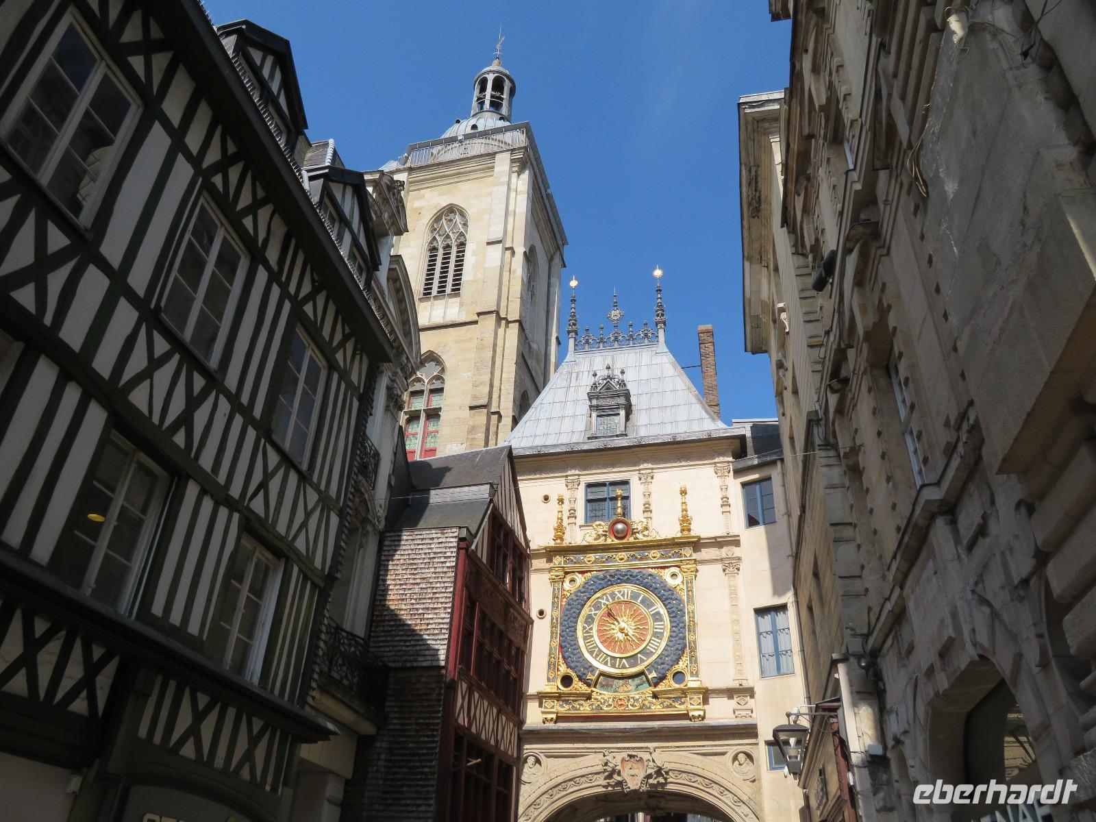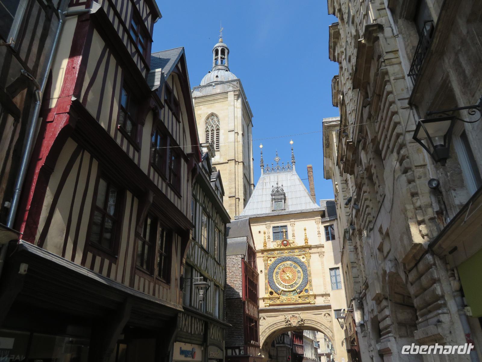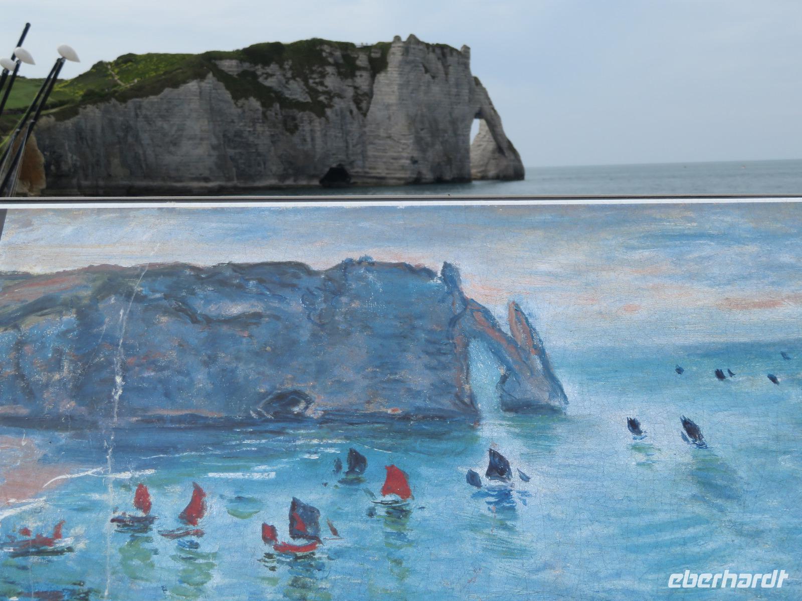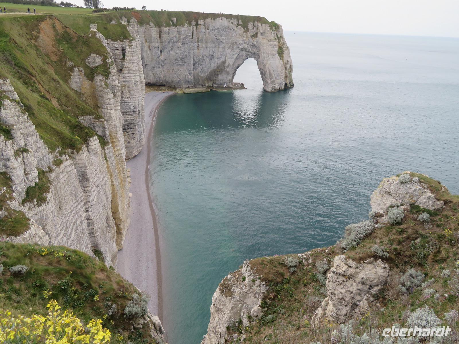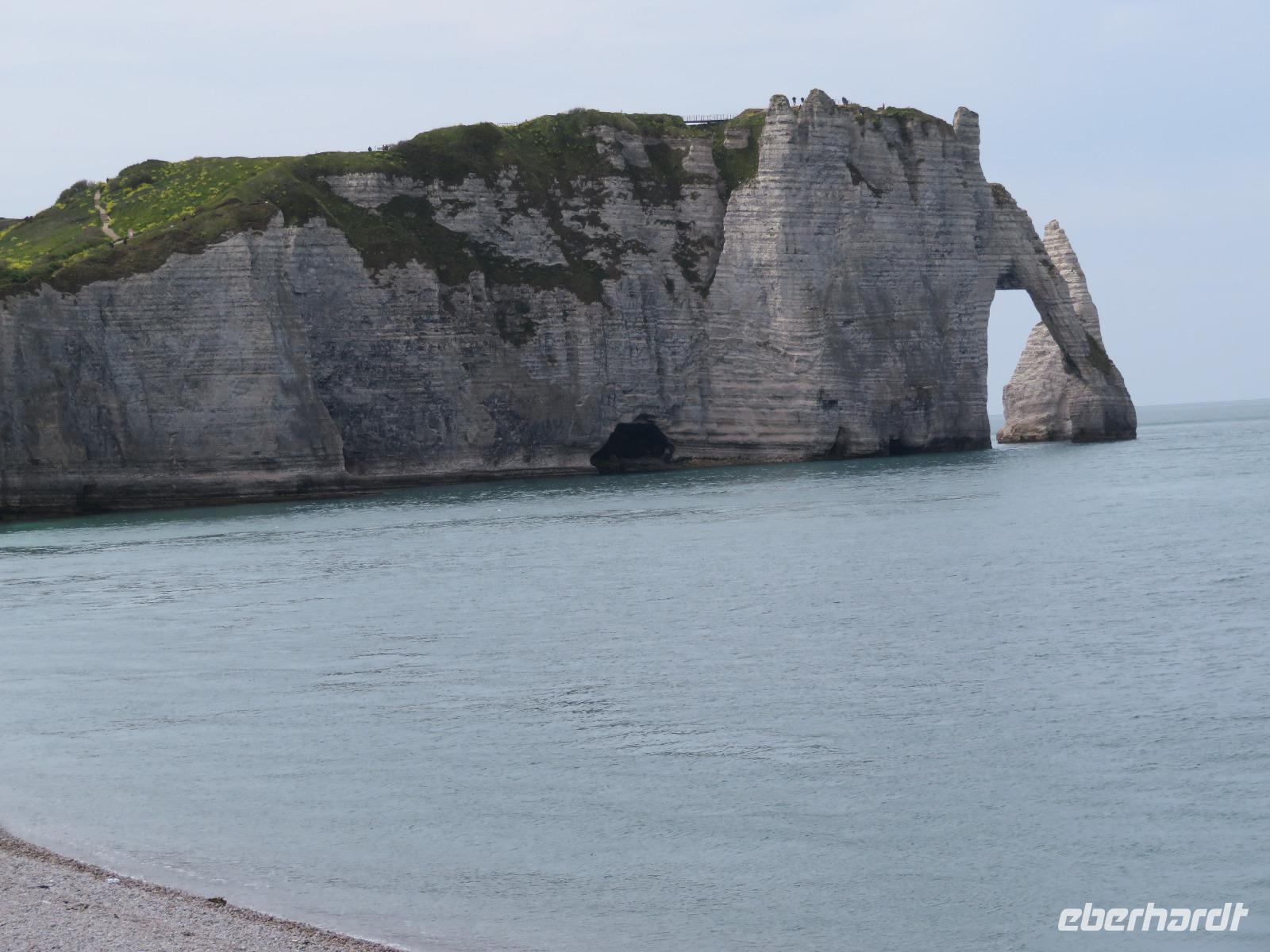 Wir nutzten den aus Erfahrung sinnvollsten Platz zum Ausstieg aus dem Bus in der Nähe der Kathedrale. Unsere örtliche Reiseleiterin erwartete uns bereits in der Toursitinformation zu einem Bummel auf den Spuren der Johanna von Orleans. Wir starteten an der Westseite der Kathedrale zum Stadtbummel in Rouen, der zweitgrößten Stadt der Normandie. So begannen wir den Bummel vor und in einer der imposantesten gotischen Kathedralen Frankreichs, sahen den Butterturm, der aus Spenden - oder doch wohl eher aus dem Ablasshandel finanziert wurde - und den hohen, eingerüsteten, Helmturm, die übliche gotische Rosette an der Westfront, und in der Kirche die „Parade der Apostel". Unser Bummel führte uns vorbei an schiefwinkligen Fachwerkhäusern der Altstadt zum Justizpalast und weiter zur Rue d' Horologue mit dem bekannten Uhrturm und der wohl ältesten Turmuhr. Weiter ging es zum Alten Markt, jenem Platz, wo 1431 Jeanne d´Arc den Feuertod starb. Eine moderne, flache Kirche steht nun in diesem Areal. Die Park-und Zustiegsmöglichkeiten in Rouen verändern sich jährlichem aber dennoch starteten wir zur Mittagszeit zur Weiterfahrt an die Atlantikküste in das im Sommer recht trublige Etretat - zur Maienzeit ist der Touristenstrom fast noch überschaubar. Am Strand erstreckt sich linker Hand aufsteigend die Steilküste am Falaise d' Aval und rechtsseitig die Falaise d' Amont. Riesige Felsentore öffnen sich im Kalkstein und die von Westen scheinende Sonne produziert leuchtend hellen Fels und (eigentlich) smaragdgrünes Wasser des Ärmelkanals. Wer auf einen der Hügel anstieg, wurde für sein Mühen belohnt und konnte manch schönes Urlaubsbild machen.