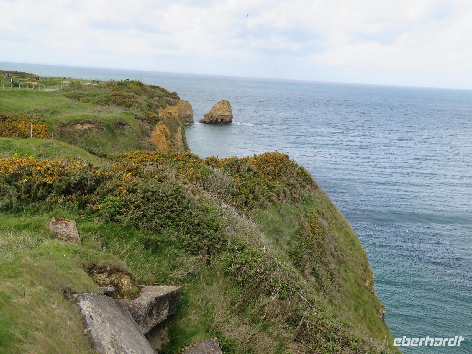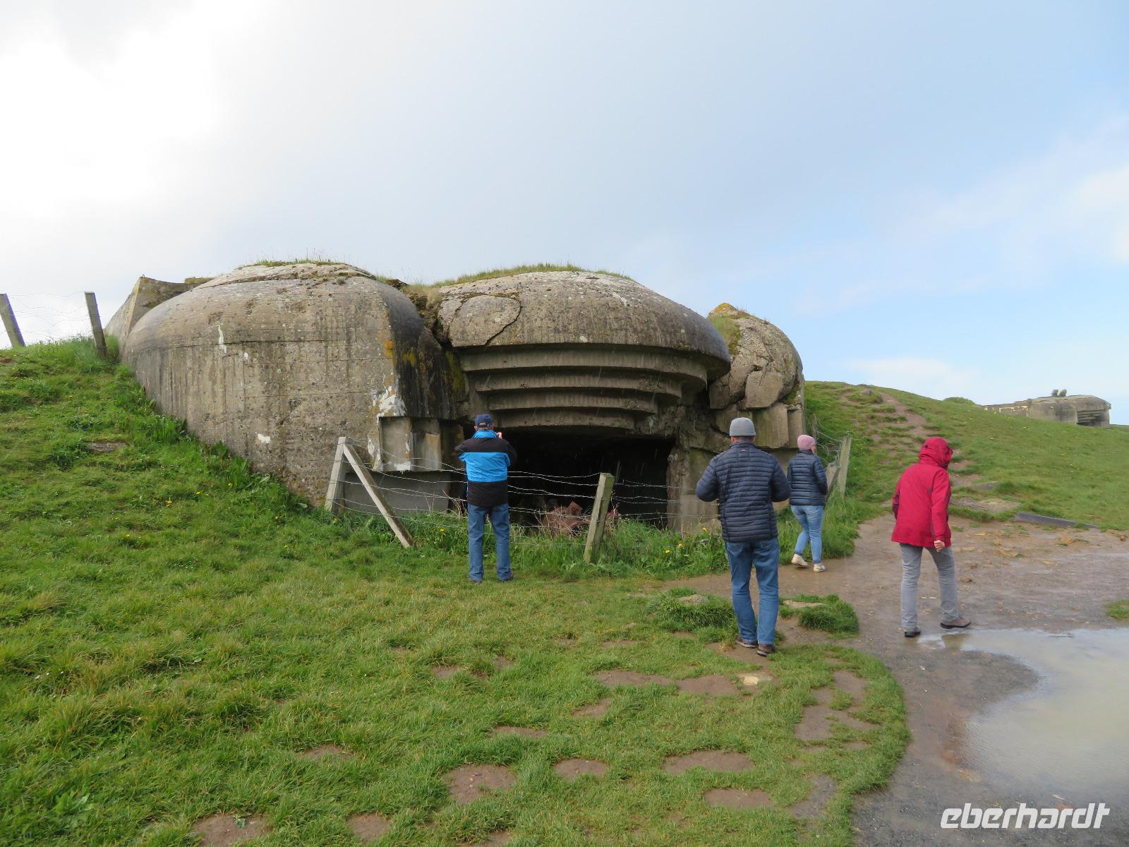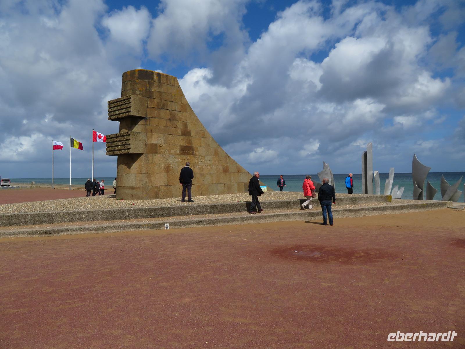 74. Jahrestag des Endes des 2. Weltkrieges.Mit dem Bus ging es von Caen in nur wenigen Kilometern an die Atlantikküste. Um den D-Day, die Aktion „Overlord" , also die Landung der Alliierten am 6. Juni 1944 historisch korrekt zu erklären, fuhren wir zunächst zur Pegasusbrücke, wo einst durch britische Soldaten die Ostflanke der Landungsstrände gesichert wurde. In Ouistreham umfuhren wir den sechsetagigen Hochbunker, eine Kommandoleitzentrale der deutschen Besatzer. Dann ging es zu den Stränden der Anlandung mit den militärischen Bezeichnungen wie Sword, Juno, Gold und Omaha. Bei Arromanches blickten wir auf die Reste des künstlichen Hafens Mulberry, in dem 1944 binnen weniger Wochen mehr als 200.000 Soldaten und 40.000 Fahrzeuge anlandeten. Im 360° - Kino konnten wir uns einen filmischen Eindruck vom Geschehen machen. Im nahen Longues sur Mer stoppten wir an den Resten deutscher Bunker bis uns ein kräftiger Regenschauer vertrieb. All die bisher besichtigten Punkte waren zumeist Programm bisheriger Eberhardt-Travel-Reisen an die Landungsstrände. Nunmehr waren wir gefordert, im erweiterten Programm gemeinsam Weiteres zu erkunden.