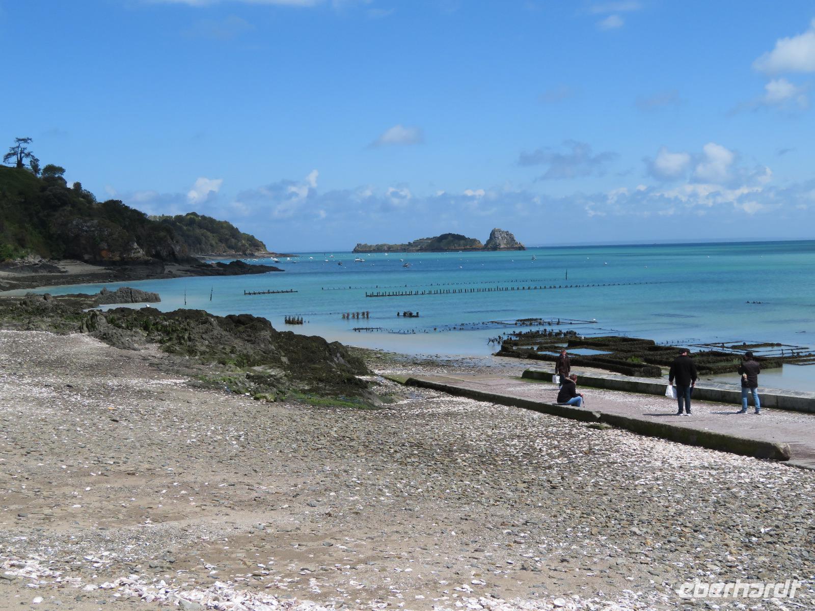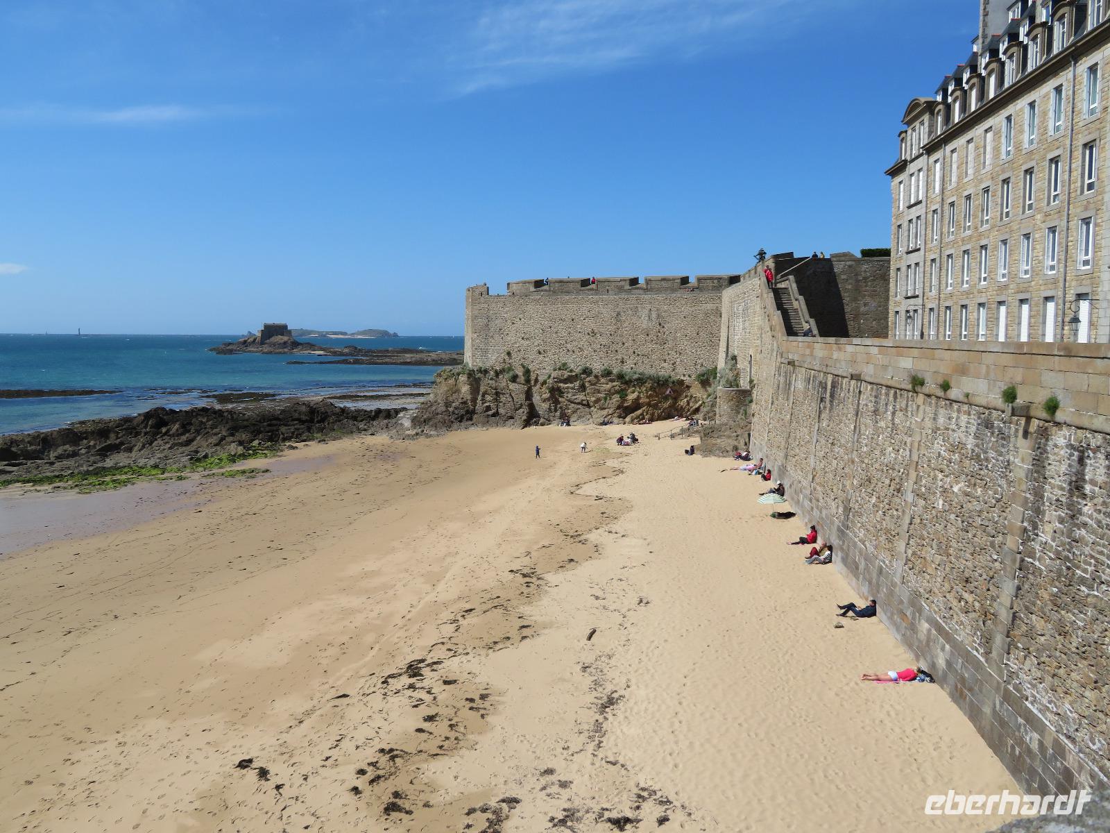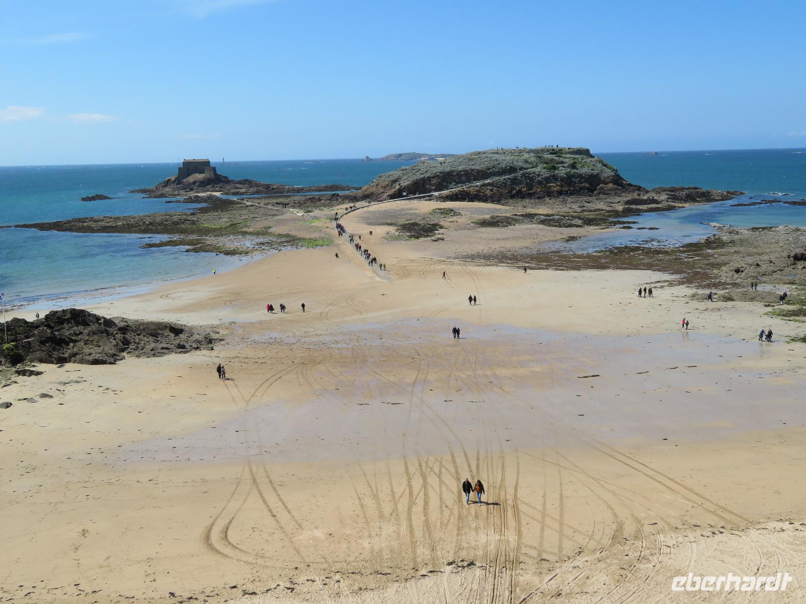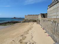 Da die versandende Fläche rund um den Granitfelsen wasserführender gestaltet wird, fährt der Transferbus - die Navette - bereits seit einigen Jahren über einen Damm und auf einer gewundenen Fahrbahn auf Stelzen, durch die nun das Wasser bei Flut fließen kann. Nach einigen Fußwegminuten, Toilettenpause und Shuttlebusfahrt standen wir am Tor der Bürgerwehr. Durch das Tor des Königs ging es wie bei einst Millionen Pilgern und heut Touristen durch die Große Straße, dann Treppen hinauf, vorbei an Fast-Food und Souvenirs zur Abtei. Vorher erheischten wir noch einen Blick in die Räume von Mutter Poulard, die einst für Pilger hier Omelett bereitete; heute gibt's auch noch dies nach alten Rezepten aber zu neuen Preisen. Mit einem Audioguide in bester deutscher Sprache ausgerüstet, konnte sich dann jeder individuell die Säle, das Refraktorium und den bestens rekonstruierten Kreuzgang erschließen, bevor er nach gut einer Stunde den Almosensaal erreichte. Nach der Besichtigung einer der ersten UNESCO-Weltkulturerbestätten und doch reichlich Freizeit bei zunächst kühlen Wetter und mancher Regenböe, ging es mit dem Bus durch Polder nach Cancale - erste Adresse der Gourmets für frische Austern. Auch wir probierten und spülten mit einem Schluck Cidre nach. Zurück nach St. Malo, bummelten wir in alten Gassen und auf den Remparts, der Stadtbefestigung mit tollen Aussichten in die Gassen der Stadt, in Wohnzimmer und auf das Meer. Einige schlenderten bei Ebbe über die weiten Sandflächen direkt neben der Uferstraße von St. Malo zum Hotel. Die Sonne hatte uns in St. Malo erreicht ...