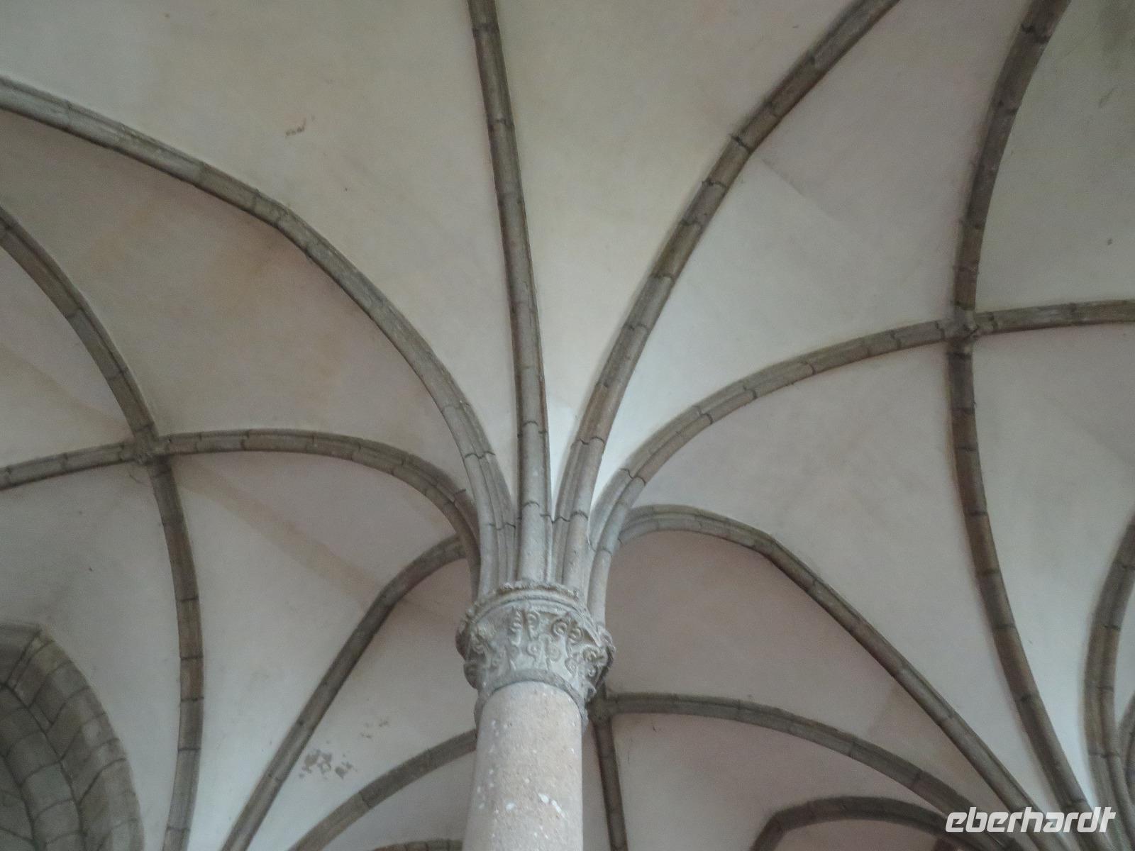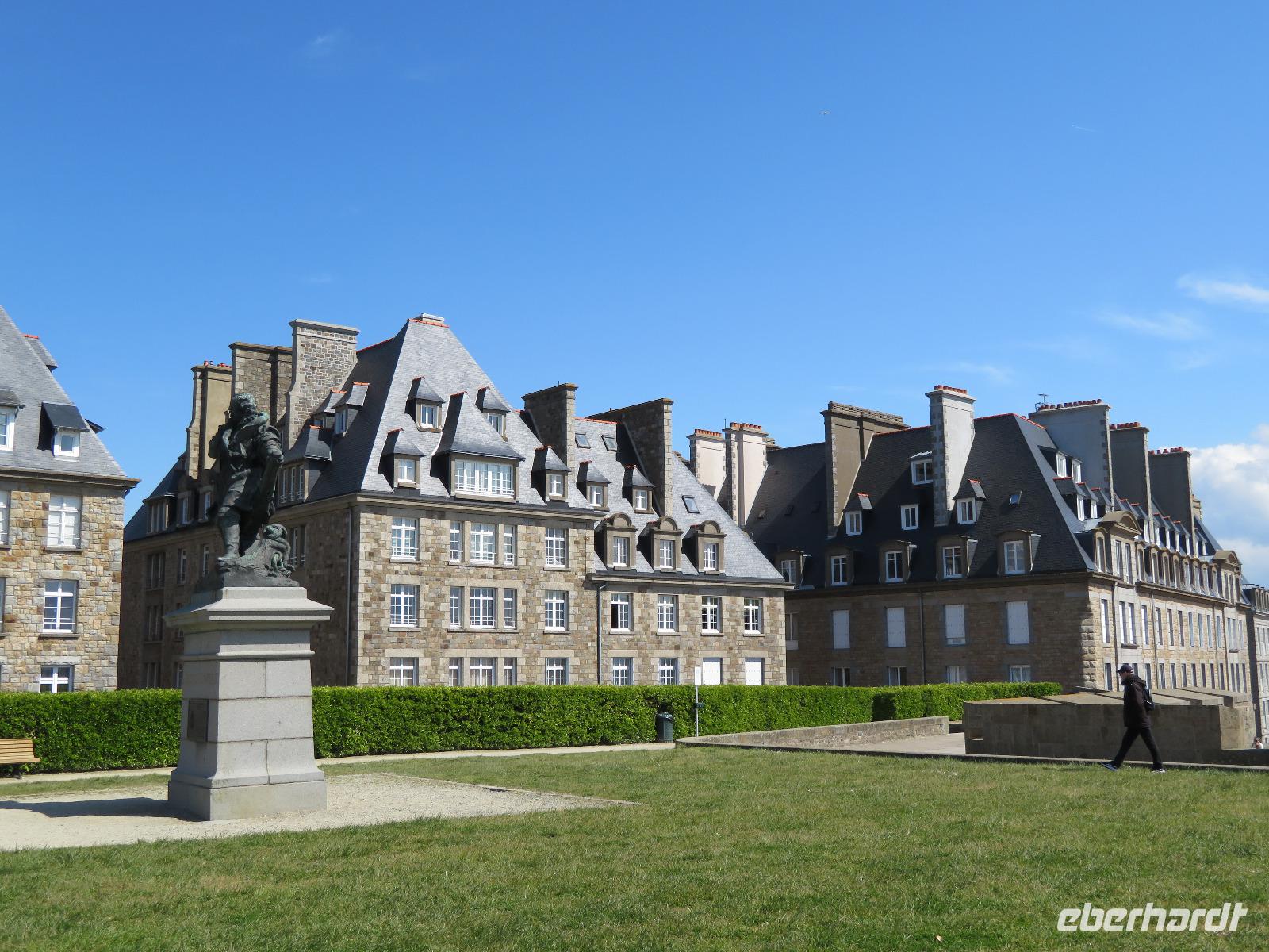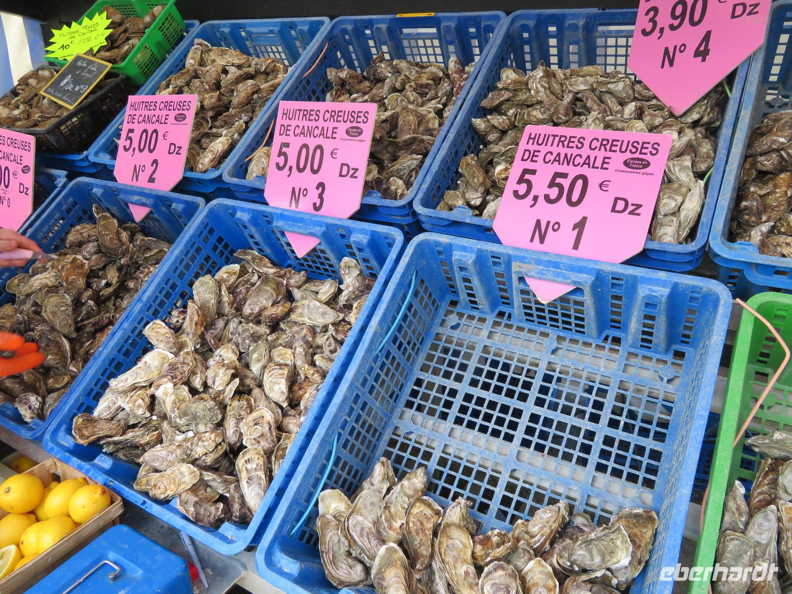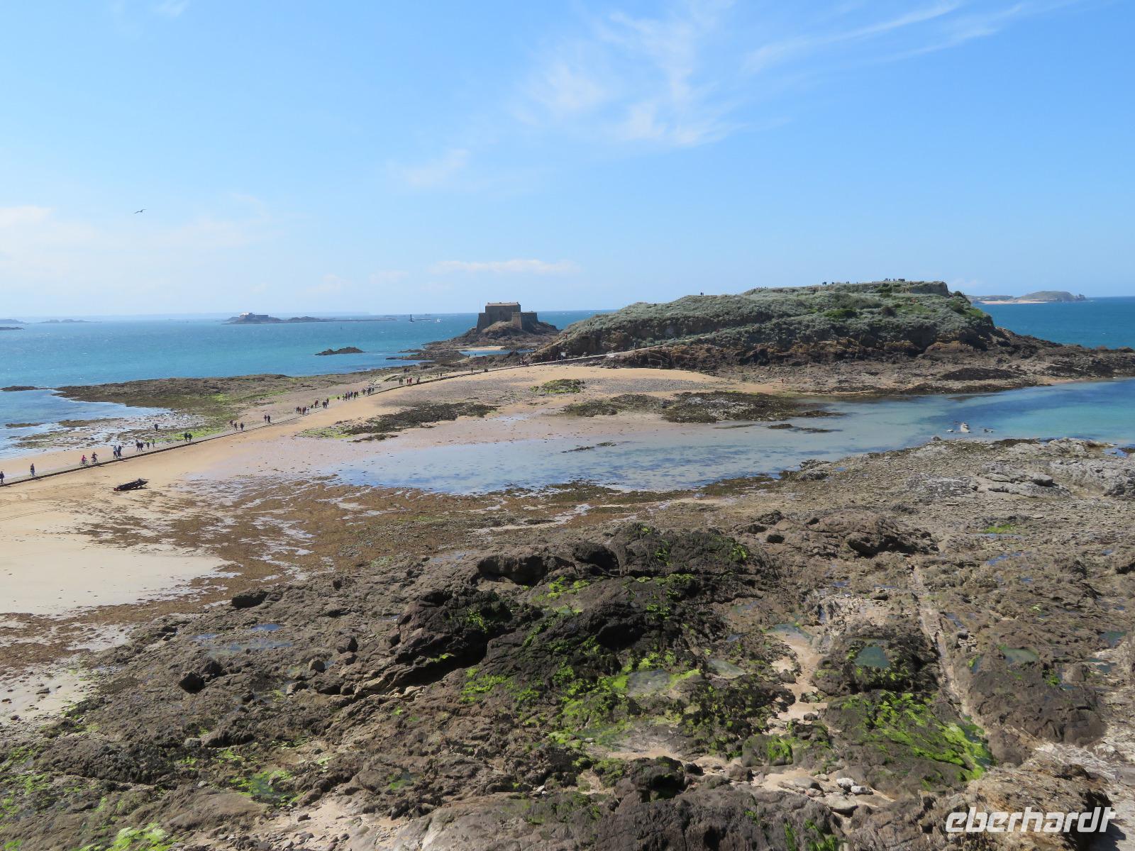 Da die versandende Fläche rund um den Granitfelsen wasserführender gestaltet wird, fährt der Transferbus - die Navette - bereits seit einigen Jahren über einen Damm und auf einer gewundenen Fahrbahn auf Stelzen, durch die nun das Wasser bei Flut fließen kann. Nach einigen Fußwegminuten, Toilettenpause und Shuttlebusfahrt standen wir am Tor der Bürgerwehr. Durch das Tor des Königs ging es wie bei einst Millionen Pilgern und heut Touristen durch die Große Straße, dann Treppen hinauf, vorbei an Fast-Food und Souvenirs zur Abtei. Vorher erheischten wir noch einen Blick in die Räume von Mutter Poulard, die einst für Pilger hier Omelett bereitete; heute gibt's auch noch dies nach alten Rezepten aber zu neuen Preisen. Mit einem Audioguide in bester deutscher Sprache ausgerüstet, konnte sich dann jeder individuell die Säle, das Refraktorium und den bestens rekonstruierten Kreuzgang erschließen, bevor er nach gut einer Stunde den Almosensaal erreichte. Nach der Besichtigung einer der ersten UNESCO-Weltkulturerbestätten und doch reichlich Freizeit bei zunächst kühlen Wetter und mancher Regenböe, ging es mit dem Bus durch Polder nach Cancale - erste Adresse der Gourmets für frische Austern. Auch wir probierten und spülten mit einem Schluck Cidre nach. Zurück nach St. Malo, bummelten wir in alten Gassen und auf den Remparts, der Stadtbefestigung mit tollen Aussichten in die Gassen der Stadt, in Wohnzimmer und auf das Meer. Einige schlenderten bei Ebbe über die weiten Sandflächen direkt neben der Uferstraße von St. Malo zum Hotel. Die Sonne hatte uns in St. Malo erreicht ...