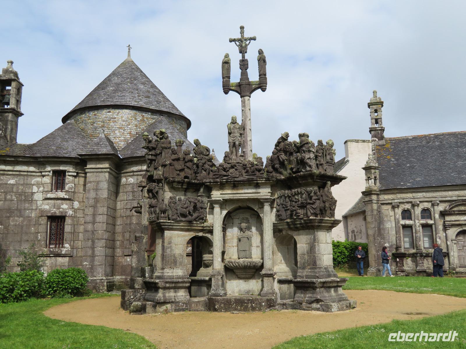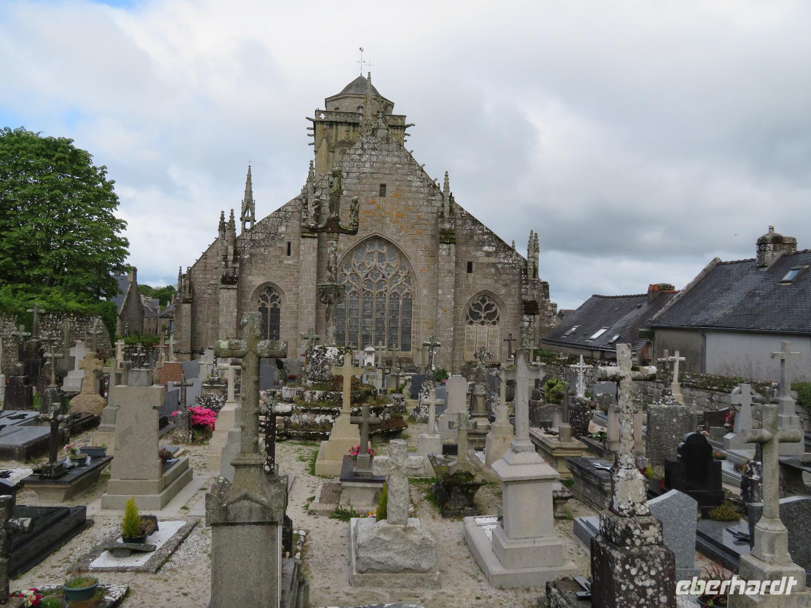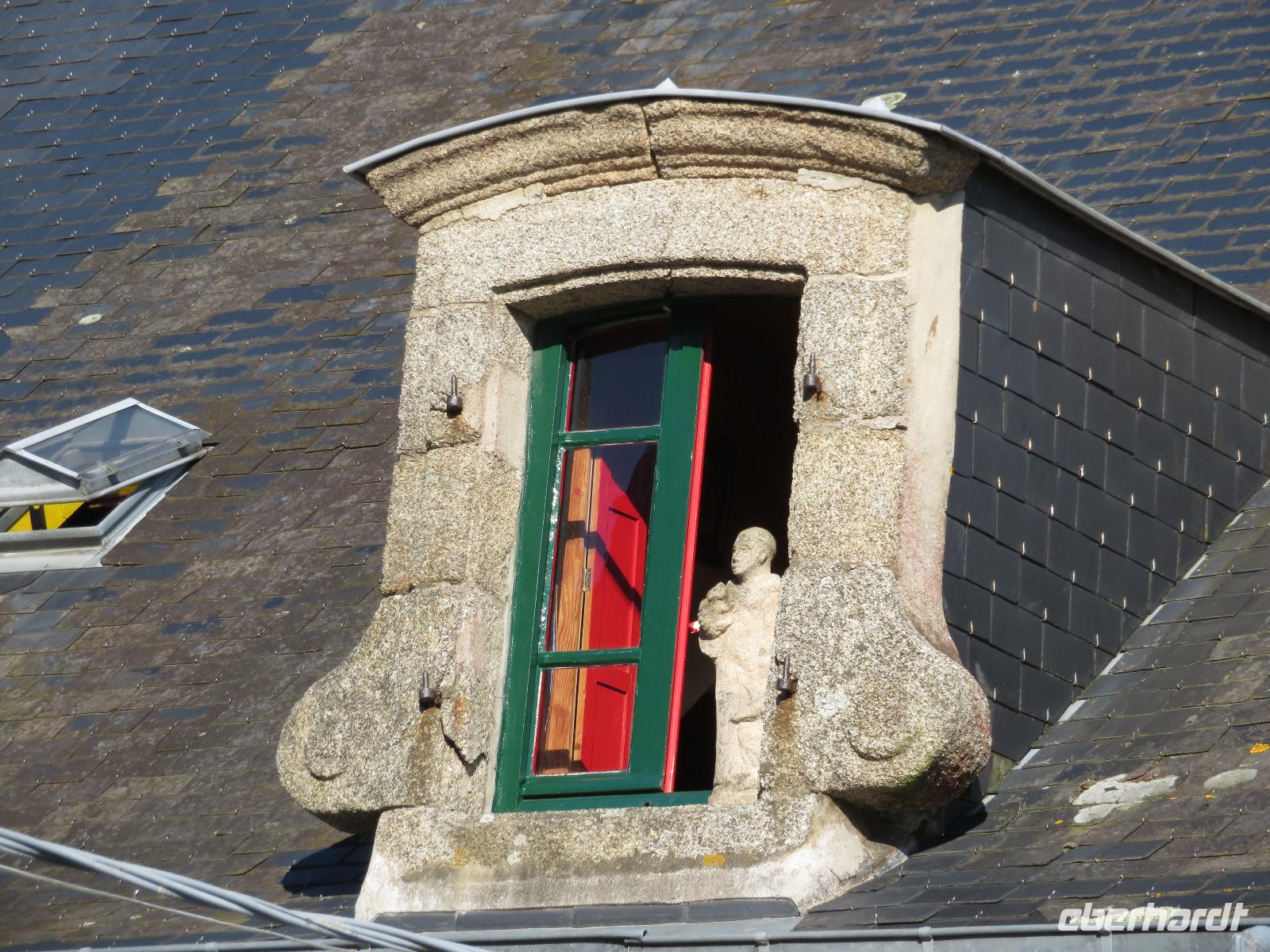 Heute ging es richtig durch die Bretagne von St. Malo zunächst an der Nordküste entlang und später querend im Finistere nach Quimper an der Südküste. Der sonst übliche Stopp am Gezeitenkraftwerk von Rance - gleich hinter St. Malo - war an diesem Tage leider nicht möglich, da der zweckmäßige Parkplatz gesperrt war. So blieb nur ein Hauch Theorie bei der Überfahrt zu Möglichkeiten und Grenzen alternativer Energiegewinnung. An Küstenorten wie Dinard vorbei fuhren wir Richtung Cap Frehel, wo wir entlang der Steilküste durch noch nicht blühende Erika und Ginster zur Capspitze bummelten. Nach der ersten Begegnung mit der Steilküste und dem Meer der Smaragdküste, die bei grauem Wetter eher nicht smaragd strahlte, zog es uns nach Ploumanac'h, dem touristischen Hauptort an der Rosa-Granit-Küste. Durch ein leicht bewältigbares Wegesystem bummelten viele Gäste vorbei an den riesigen, von Eiszeit, Wind und Wellen geformten Gesteinsbrocken. Andere Gäste nutzten die gastronomischen Einrichtungen, um mit Muscheln oder Carpaccio eine Alternative zur Bordküche zu schaffen. Unsere Weiterfahrt durch die ländliche Bretagne führte uns nach Guimillau. Im abgeschlossenen Pfarrbezirk des kleinen Ortes befindet sich einer der bedeutendsten Kalvarienberge Frankreichs. Mehr als zweihundert Figuren stellen das Leben Jesu und seinen letzten Gang auf Golgata dar. Während sich Reisebücher vorrangig auf den Kalvarienberg beschreibend stürzen, wird oft die Kirche kaum erwähnt. Sie stammt auch aus der Zeit der französischen Renaissance und bereits die feinen Figuren am Portal faszinieren. Vierhundert Jahre alte Taufbecken, Altarbilder, die Kanzel voller Holzschnitzereien und eine immerhin dreihundertfünfzig Jahre alte Orgel voller Schnitzereien am Prospekt sind ein unerwartetes Kunstwerk in einem Dorf mit kaum eintausend Einwohnern. Die Einfahrt nach Quimper verlief zügig und so rollten wir bereits vor 18:30 Uhr unsere Koffer ins Hotel Escale Oceania, nicht weit vom Zusammenfluss („Kemper") von Odet und Steir. Mancher bummelte nach dem Abendessen noch in das nahe gelegene Stadtzentrum.