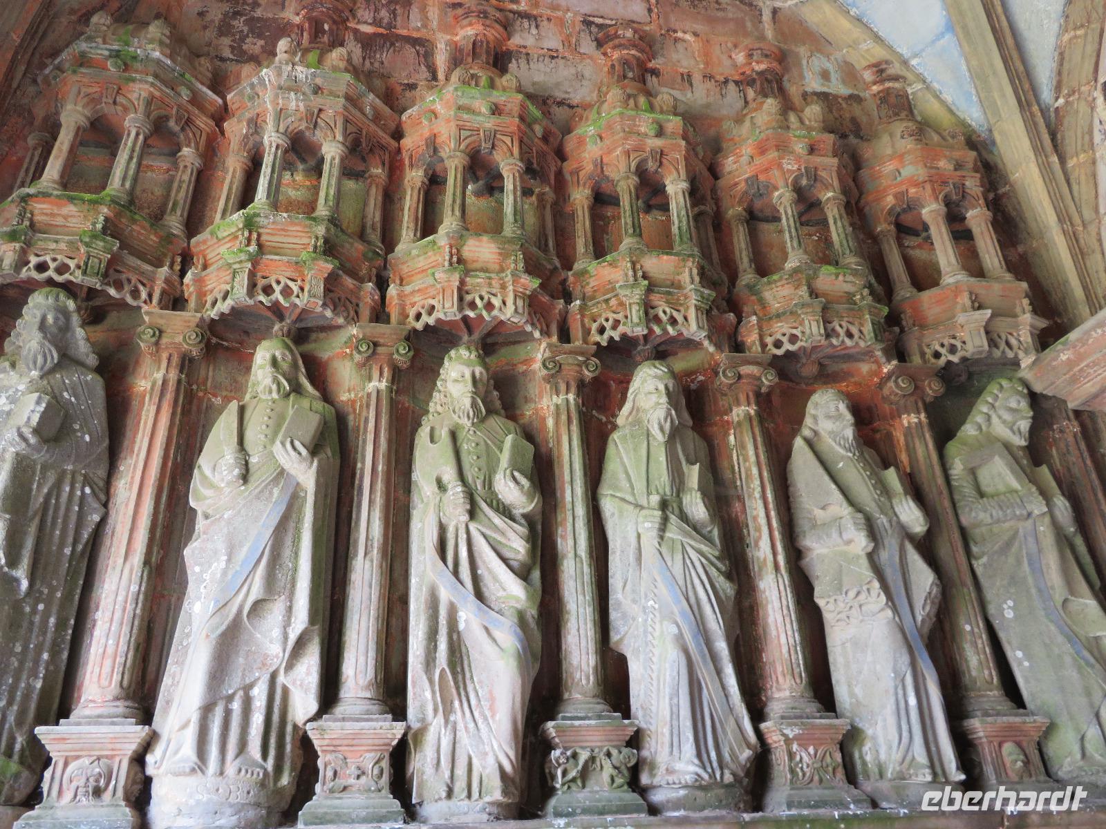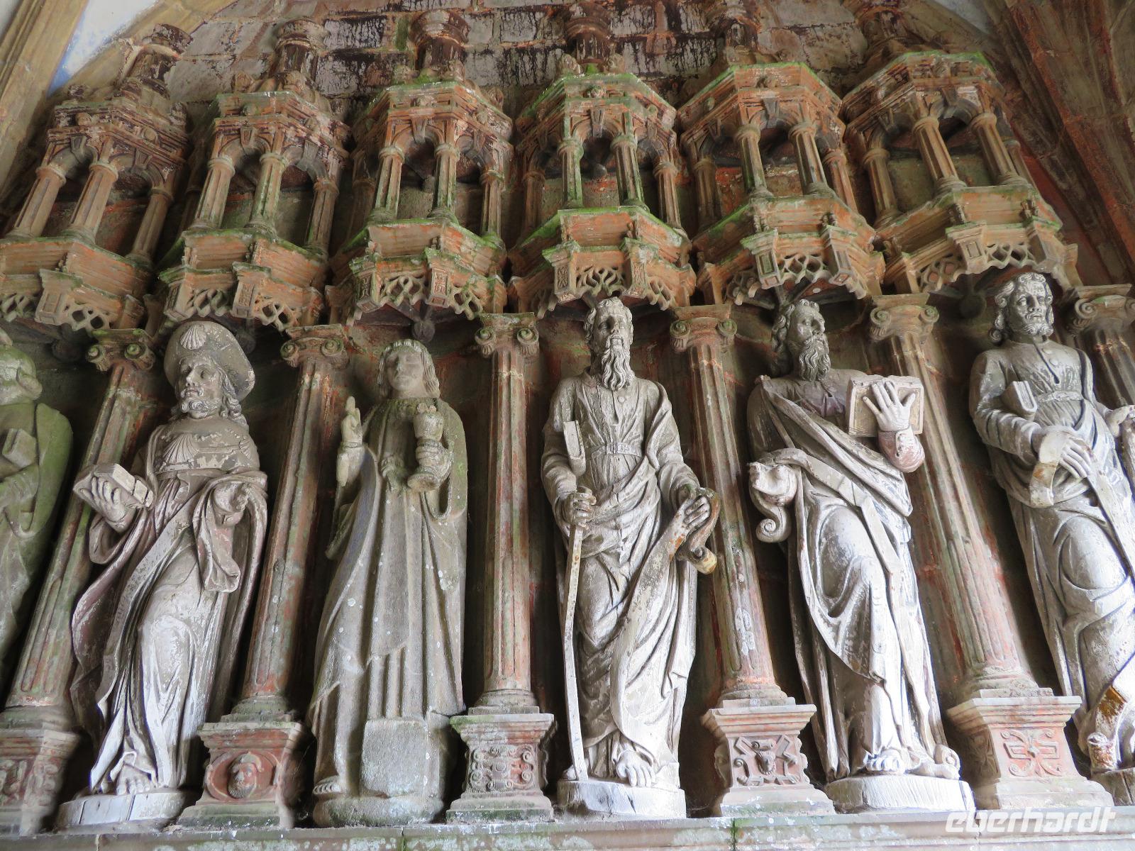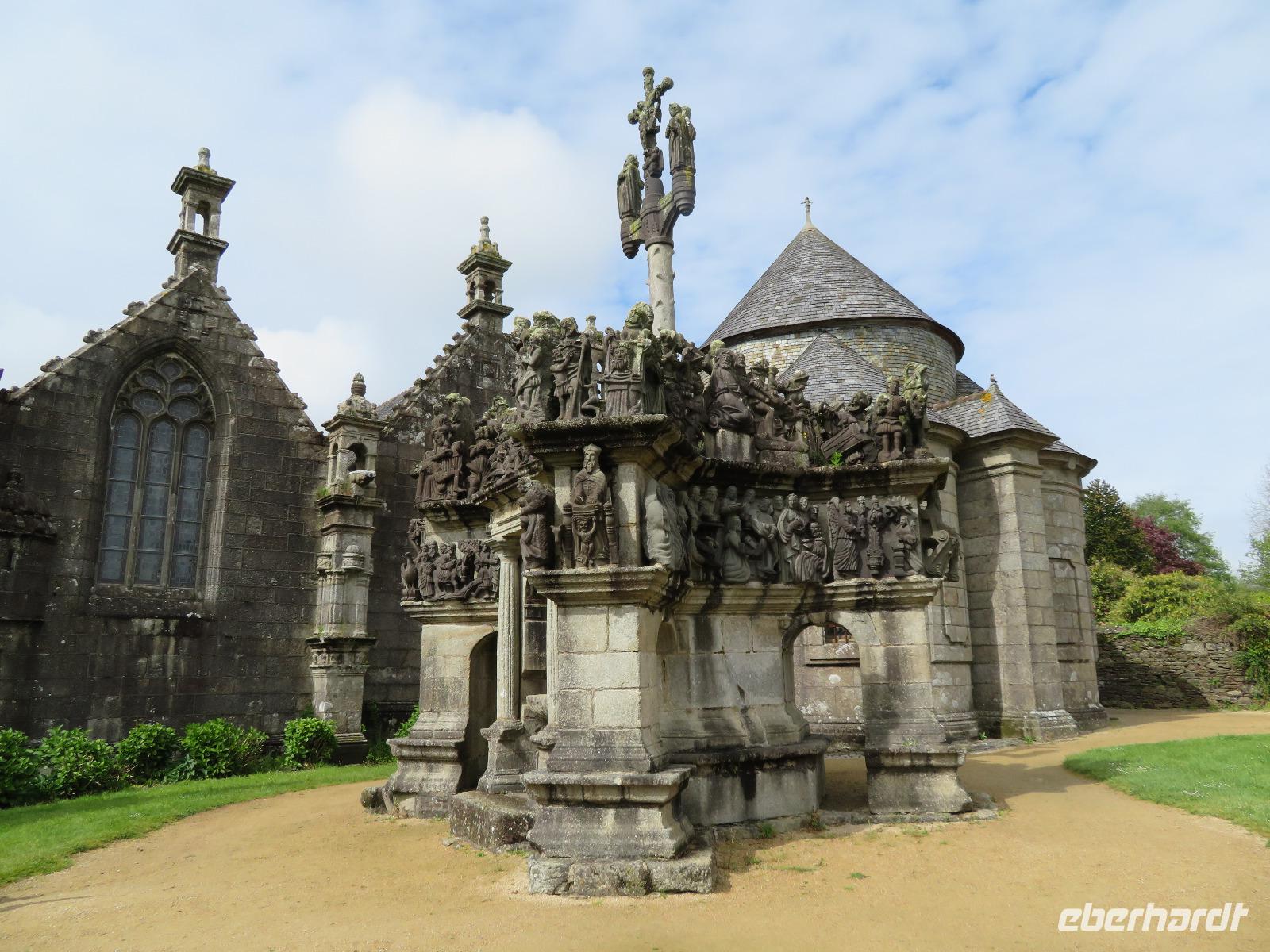 Heute ging es richtig durch die Bretagne von St. Malo zunächst an der Nordküste entlang und später querend im Finistere nach Quimper an der Südküste. Der sonst übliche Stopp am Gezeitenkraftwerk von Rance - gleich hinter St. Malo - war an diesem Tage leider nicht möglich, da der zweckmäßige Parkplatz gesperrt war. So blieb nur ein Hauch Theorie bei der Überfahrt zu Möglichkeiten und Grenzen alternativer Energiegewinnung. An Küstenorten wie Dinard vorbei fuhren wir Richtung Cap Frehel, wo wir entlang der Steilküste durch noch nicht blühende Erika und Ginster zur Capspitze bummelten. Nach der ersten Begegnung mit der Steilküste und dem Meer der Smaragdküste, die bei grauem Wetter eher nicht smaragd strahlte, zog es uns nach Ploumanac'h, dem touristischen Hauptort an der Rosa-Granit-Küste. Durch ein leicht bewältigbares Wegesystem bummelten viele Gäste vorbei an den riesigen, von Eiszeit, Wind und Wellen geformten Gesteinsbrocken. Andere Gäste nutzten die gastronomischen Einrichtungen, um mit Muscheln oder Carpaccio eine Alternative zur Bordküche zu schaffen. Unsere Weiterfahrt durch die ländliche Bretagne führte uns nach Guimillau. Im abgeschlossenen Pfarrbezirk des kleinen Ortes befindet sich einer der bedeutendsten Kalvarienberge Frankreichs. Mehr als zweihundert Figuren stellen das Leben Jesu und seinen letzten Gang auf Golgata dar. Während sich Reisebücher vorrangig auf den Kalvarienberg beschreibend stürzen, wird oft die Kirche kaum erwähnt. Sie stammt auch aus der Zeit der französischen Renaissance und bereits die feinen Figuren am Portal faszinieren. Vierhundert Jahre alte Taufbecken, Altarbilder, die Kanzel voller Holzschnitzereien und eine immerhin dreihundertfünfzig Jahre alte Orgel voller Schnitzereien am Prospekt sind ein unerwartetes Kunstwerk in einem Dorf mit kaum eintausend Einwohnern. Die Einfahrt nach Quimper verlief zügig und so rollten wir bereits vor 18:30 Uhr unsere Koffer ins Hotel Escale Oceania, nicht weit vom Zusammenfluss („Kemper") von Odet und Steir. Mancher bummelte nach dem Abendessen noch in das nahe gelegene Stadtzentrum.