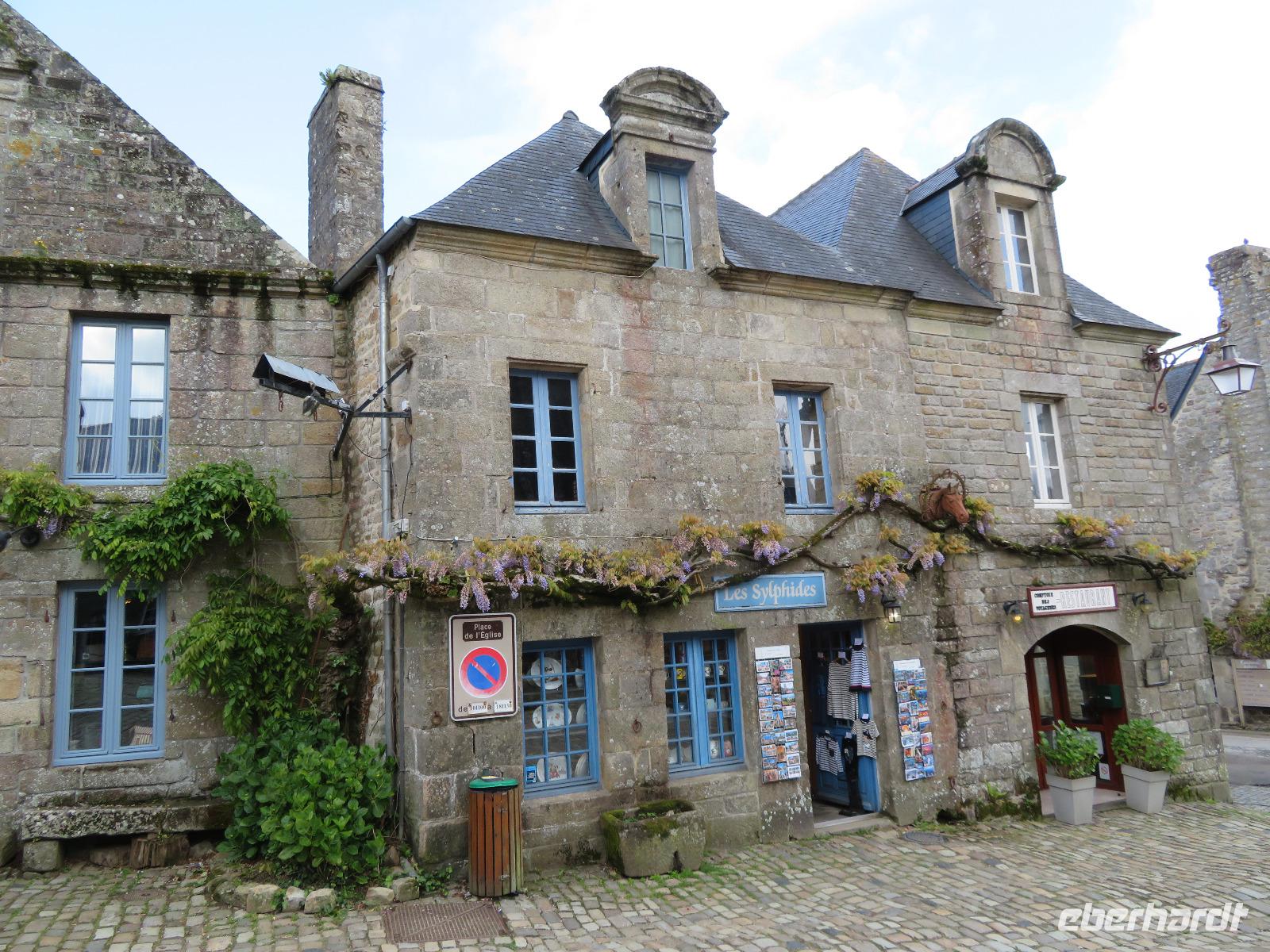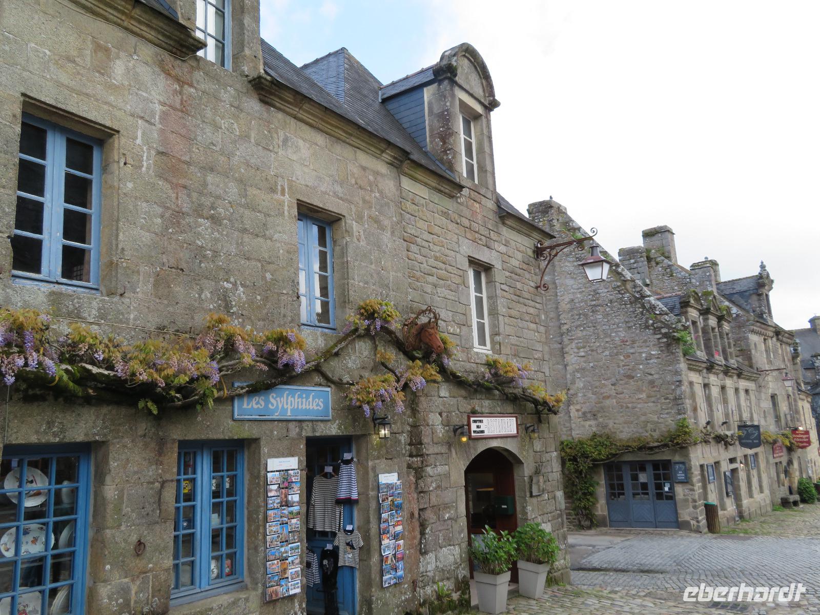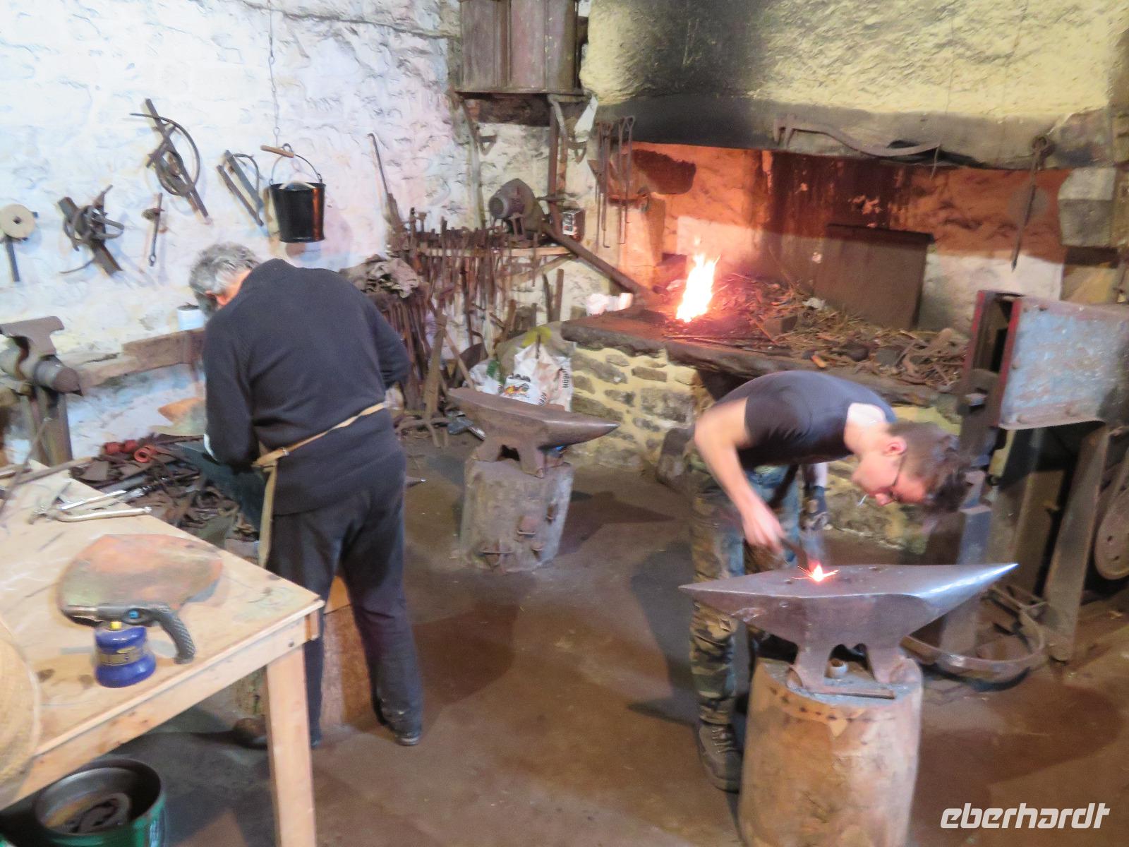 Da wir ein Picnic vereinbart hatten, stoppten wir zunächst am Super U in Plogonnec. Für alle Gäste ein tolle Erfahrung über Angebotsbreite und Frische im Lebensmittelsortiment. Anschließend ging es zum kleinen Dörfchen Locronon, dem einst die Segeltuchweberei Reichtum gebracht hatte und dies wohl dem Heiligen Ronan, einem irischen Mönch verdankt. Heute gehört der Ort zu den schönsten Dörfern Frankreichs. Leider fehlte noch der begehrte Sonnenstrahl, um die grauen bretonischen Gebäude mit blauen Fensterrahmen und hellem Grün von Pflanzen freundlich im Lichte schimmern zu lassen. Auf unserer Weiterfahrt zum Pointe du Raz durchquerten wir Dounanez und stoppten im kleinen Ort Confort mit einer Kirche aus dem 16. Jahrhundert, einem großrädrigen Glockenspiel im Kirchenschiff und einem Kalvarienberg mit 13 Figuren, darunter einigen ausgetauschten Aposteln. Der Vereinsvorsitzender des kleinen Schmiedemuseums gegenüber erklärte uns einiges zur Kir he und zeigte uns die alte Schmiede, wo zwei Gesellen eine Schauvorführung gaben.