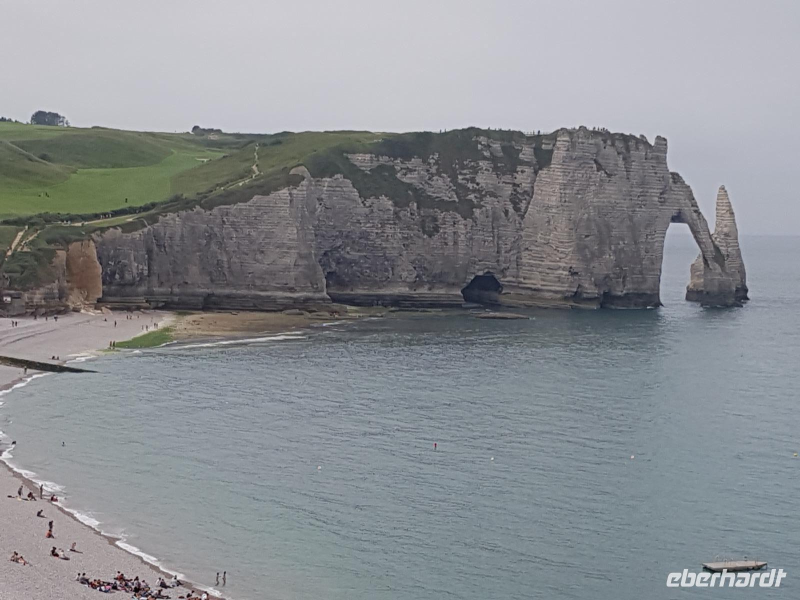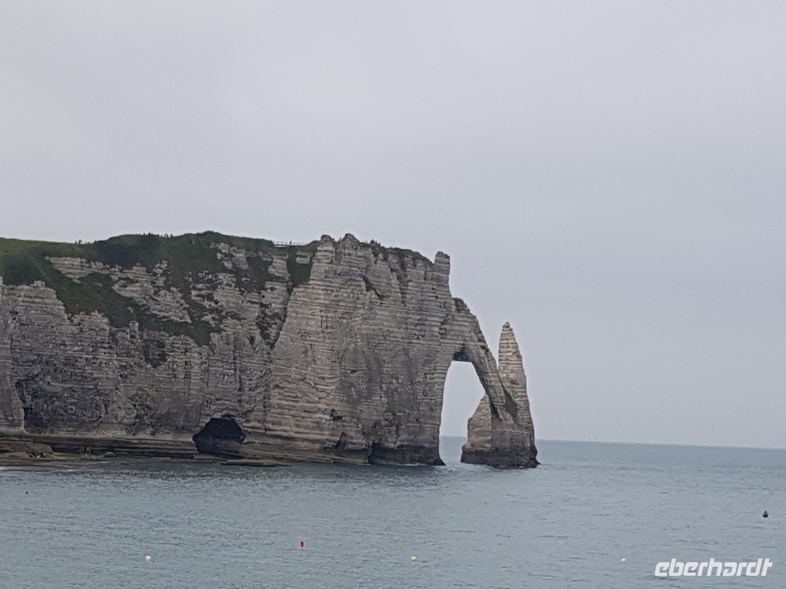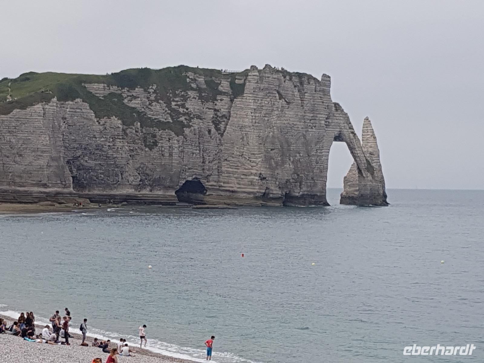 Unmittelbar danach ging es an die Côte d'Abatre, der nach seine weißen Kreidefelsen benannten Küstenabschnitt der Oberen Normandie, nach Ètretat. Trotz des bedeckten Himmels beeindruckte uns diese spektakuläre Küste mit ihren Kreidefelsen und ihrem steinigen Strand. Auf der Strandpromenade angekommen erhob sich links von uns die helle Felswand der "Falaise d'Aval" und rechts die der "Falaise d'Amont". Wenn auch die Sonne hinter einer dicken Wolkenschicht versteckt blieb war das Erlebnis dieser Küste großartig.