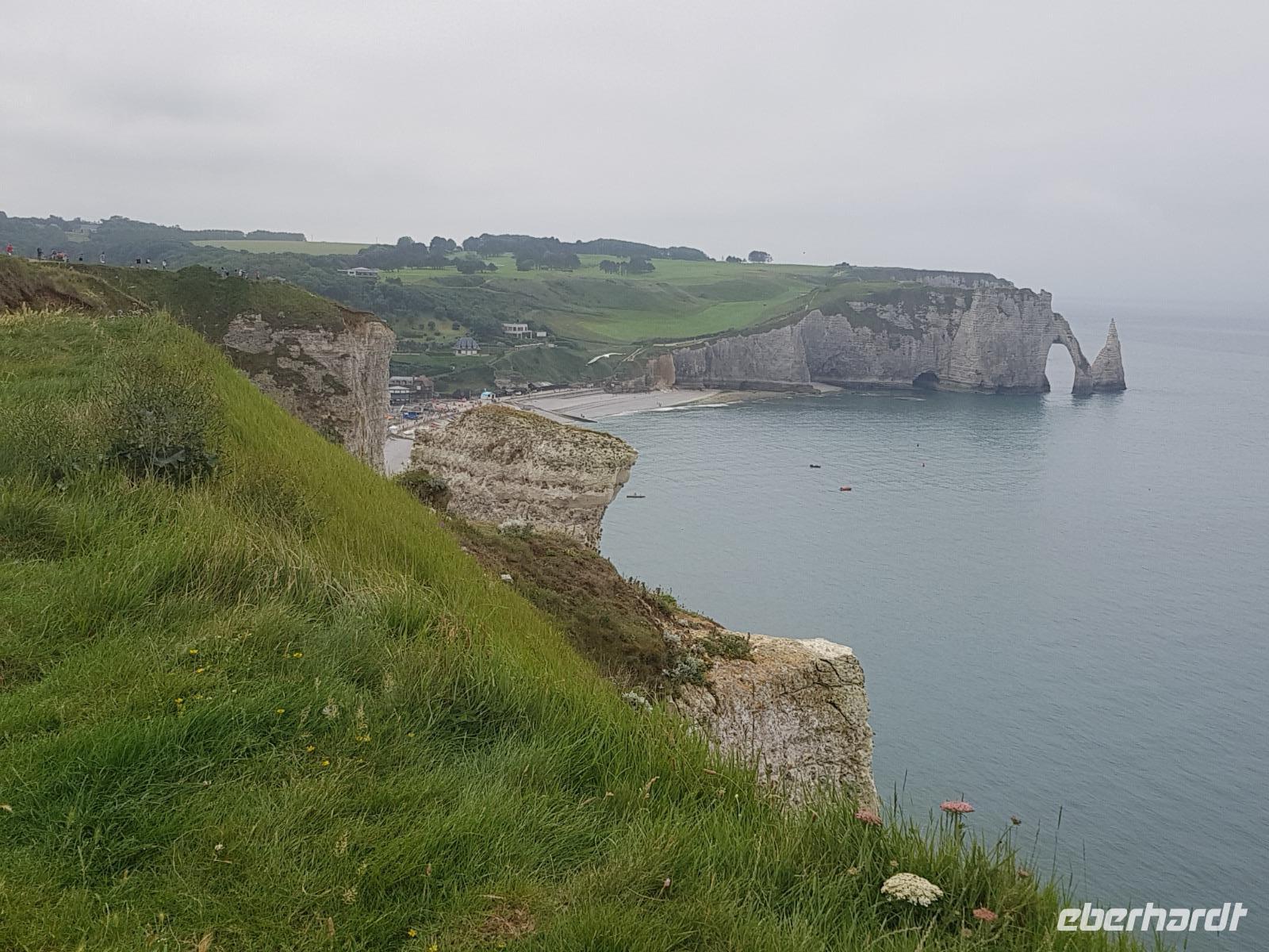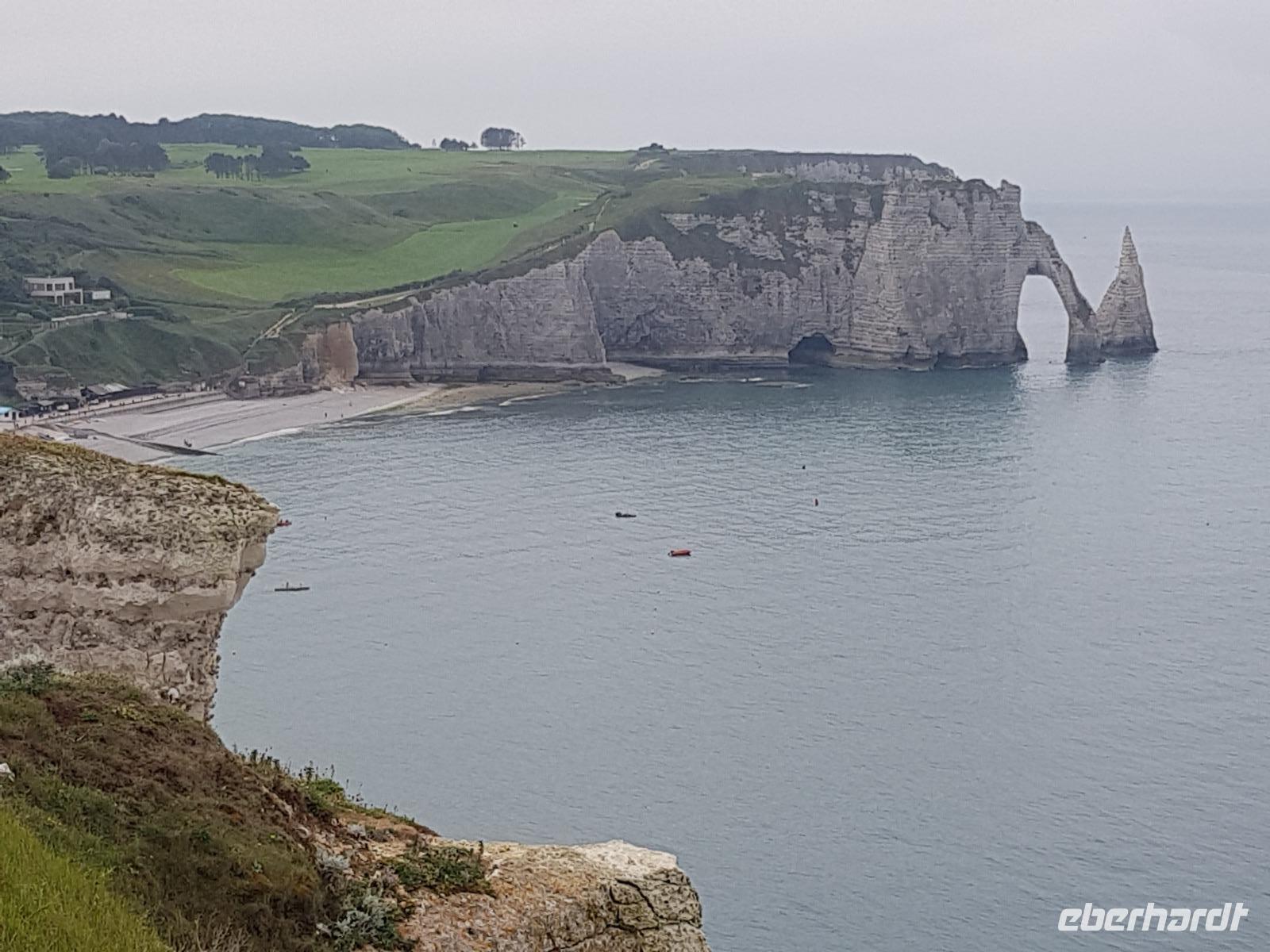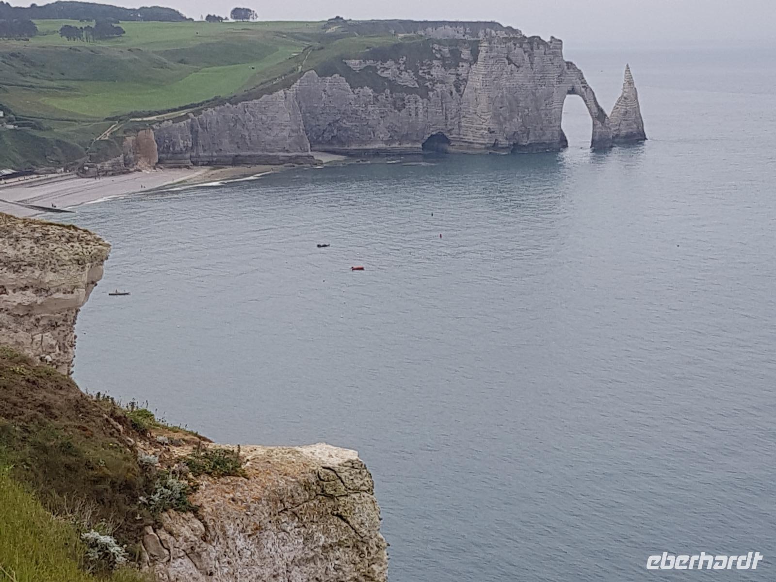Unmittelbar danach ging es an die Côte d'Abatre, der nach seine weißen Kreidefelsen benannten Küstenabschnitt der Oberen Normandie, nach Ètretat. Trotz des bedeckten Himmels beeindruckte uns diese spektakuläre Küste mit ihren Kreidefelsen und ihrem steinigen Strand. Auf der Strandpromenade angekommen erhob sich links von uns die helle Felswand der "Falaise d'Aval" und rechts die der "Falaise d'Amont". Wenn auch die Sonne hinter einer dicken Wolkenschicht versteckt blieb war das Erlebnis dieser Küste großartig.