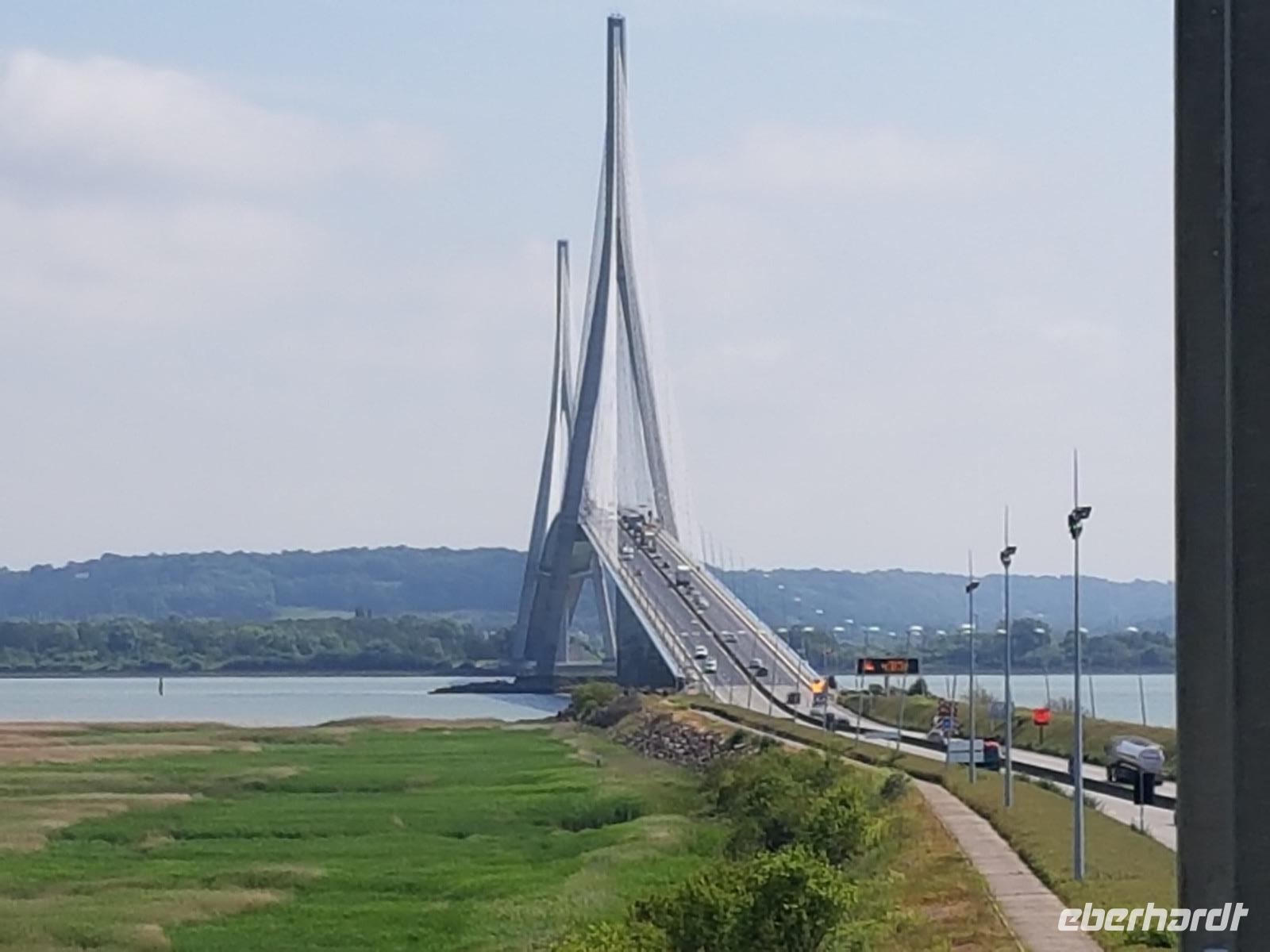 Am Nachmittag warteten zwei weitere normannische Highlights auf uns. Zunächst fuhren wir zur „Pont de Normandie". Mit einer Länge von 2.241 Metern und einer Hauptspannweite von 854 Metern war sie 1994, im Jahr ihrer Einweihung die größte Schrägseilbrücke der Welt. Nach einem Fotostopp fuhren wir über die "Pont de Normandie" und waren fasziniert von der Leichtigkeit und Eleganz dieses genialen Brückenbauwerks.
