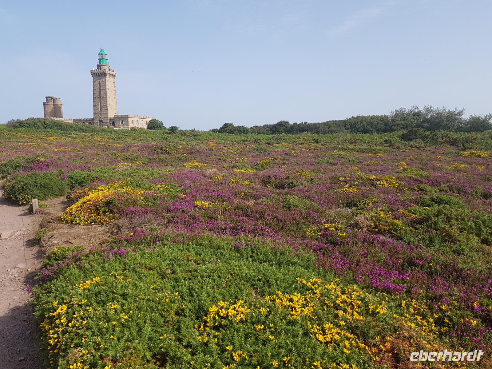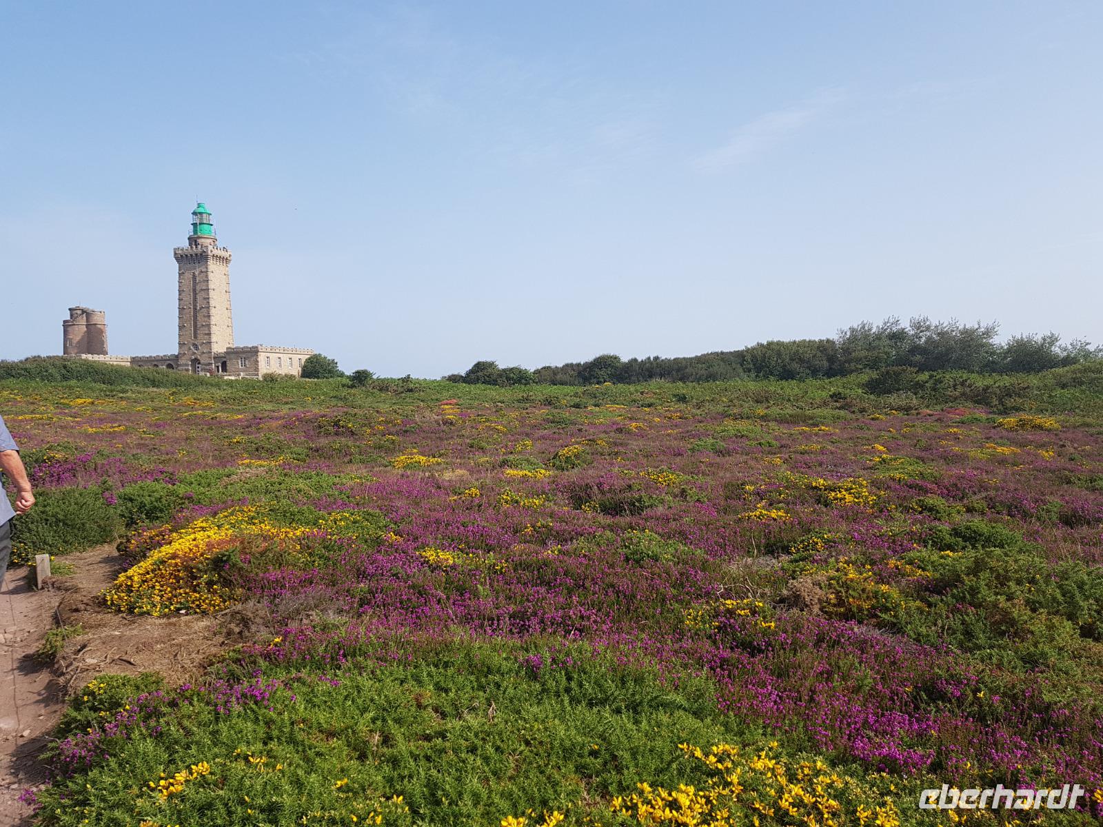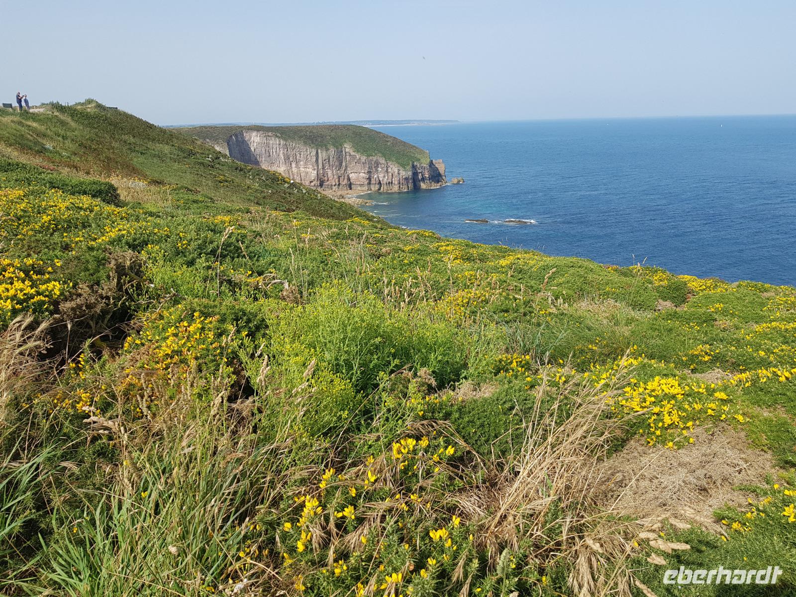 An der bis zu 70 m hohen Steilküste des Cap Fréhel erlebten wir eine großartige Naturszenerie. Rings um den alten Leuchtturm breitete sich ein Teppich aus gelbem Ginster und violetter Erika aus. Über den benachbarten schroffen Felsklippen umkreisten große Möwen kreischend ihre Kolonien. Auch Lummen wurden von einigen Gästen entdeckt.