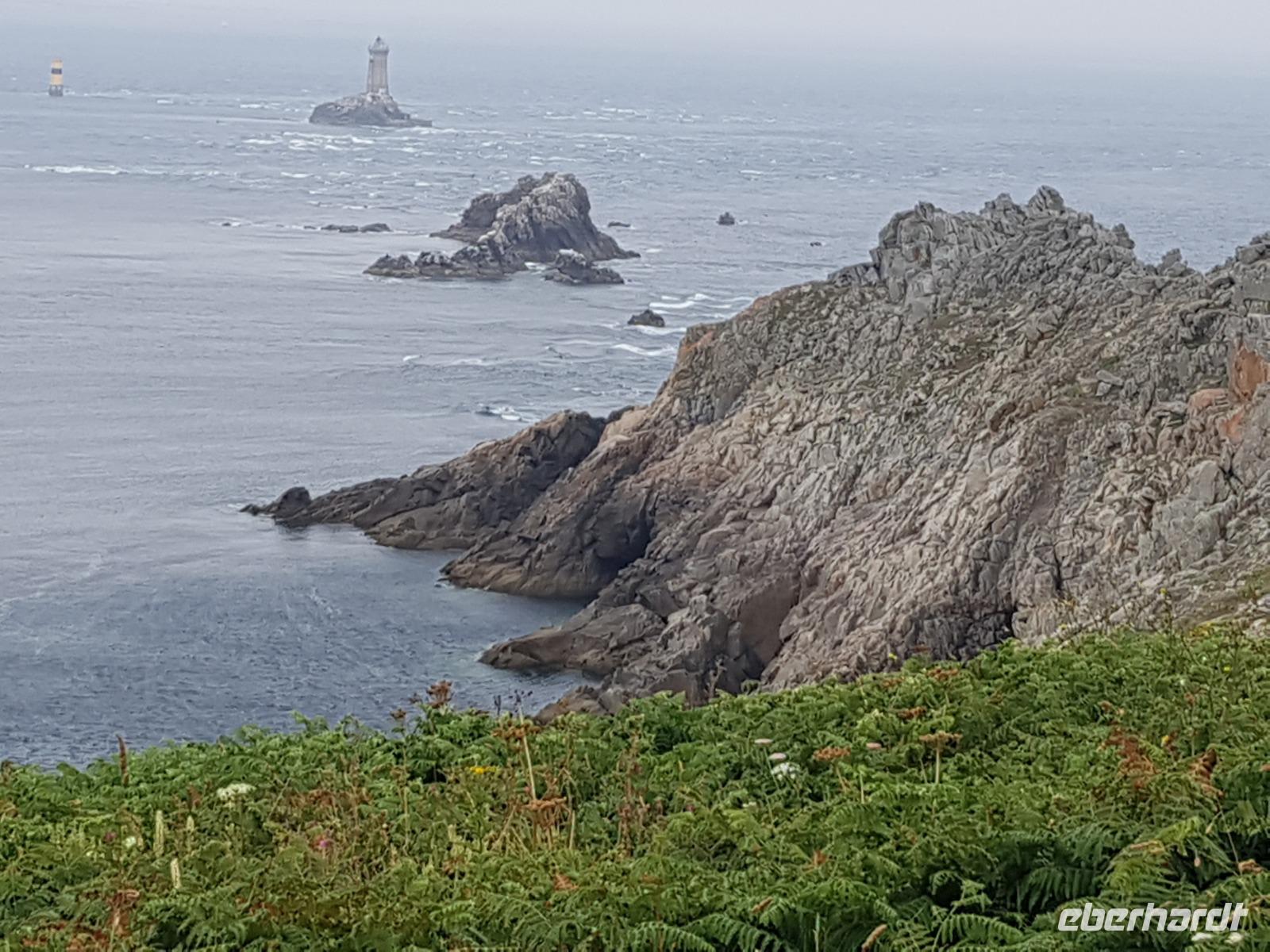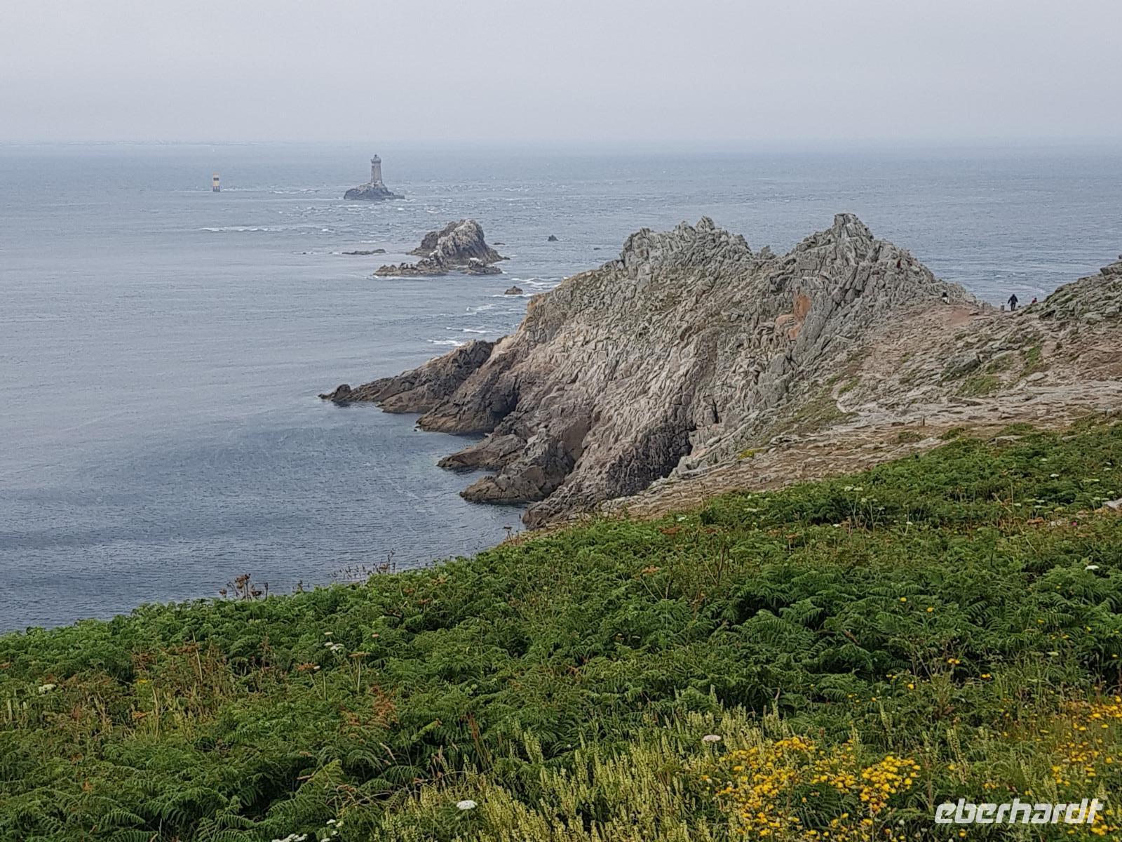 Dann fuhren wir an Douarnenez vorbei zum Cap Sizun. Die extrem zugespitzte Landzunge reicht ca. 30 km in den Atlantischen Ozean hinein und trennt die Iroise See im Norden vom Golf von Biskaya im Süden. Nach einem Fotostopp an der Baie des Trépassés, der Bucht der Verschiedenen, erreichten wir den Parkplatz der Pointe du Raz, der spektakuläre westliche Ausläufer des Caps, zu dem vom Parkplatz ein ca. 15 minütiger Fußweg führte. Vor diesem Cap liegen zahlreiche Klippen, die verbunden mit den starken Gezeitenströme einst lebensgefährlich für die Schifffahrt waren. In den vergangenen Jahrhunderten kam es hier zu unzähligen Schiffsbrüchen. Heute erreichen die Schiffe in einem großen Bogen die ca. 8. km westlich liegende Ile de Sein. Die Sicht war zwar etwas neblig. Dennoch konnte man sämtliche Leuchttürme und die gegenüber liegende Insel Île de Sein sehen. Dafür gab es einen beachtlichen Wellengang mit Schaumkronen auf dem Wasser. Nach diesem dramatischen Küstenerlebnis an der Pointe du Raz fuhren wir entlang der südlichen Küste des Cap Sizun durch das Bigoudenland zurück nach Quimper. Am späteren Nachmittag erkundeten wir mit Muße die Hauptstadt der Cornouaille mit ihrer Kathedrale Saint Corentin und ihren stimmungsvollen Gassen und Plätzen.