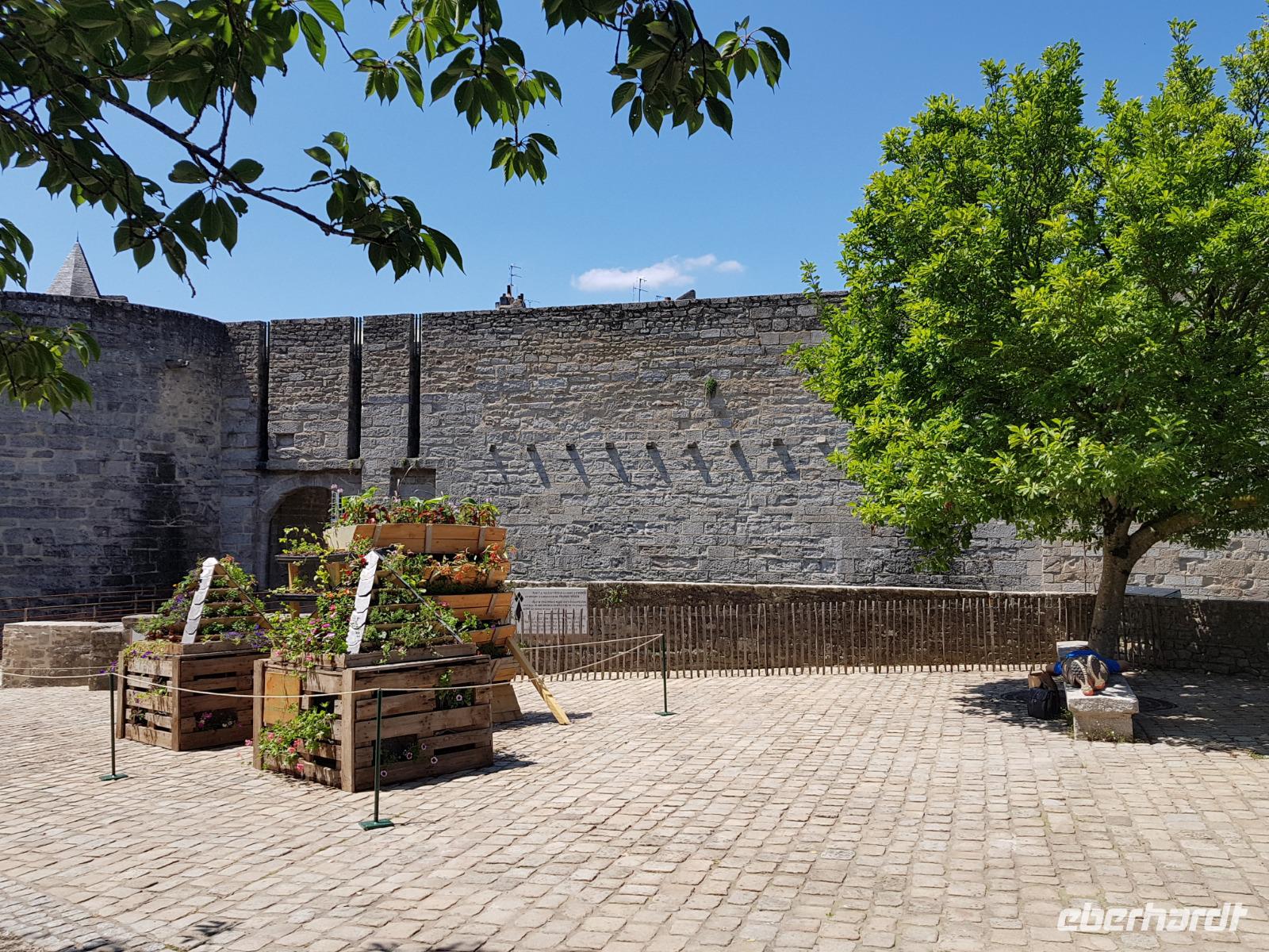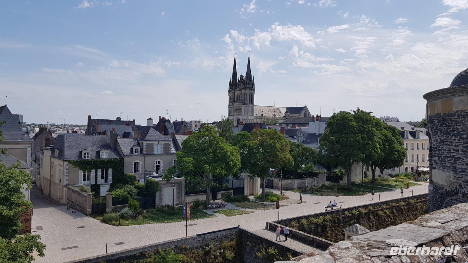 Gegen Mittag erreichten wir Angers. Die Stadt am Fluss Maine war einst Hauptstadt des Anjou und gehörte zur Zeit der Plantagenet, die zugleich Könige von England waren, zu dem gigantischen Reich, das von Schottland bis zu den Pyrenäen reichte. In dieser Zeit begann die Blütezeit von Angers. Sie endete 1480 mit dem Tod von Herzog Réne, des letzten Herzogs des Anjou. Aus dem 13. Jahrhundert, der Zeit der Regentschaft der Blanka von Kastilien und ihres Sohnes Karl von Anjou, blieb eine beeindruckende Festung erhalten, die das Herzogtum von Angriffen der Bretonen schützen sollte. Auf Festungshof befindet sich neben den mittelalterlichen Schlossbauten heute ein moderner Museumsbau. Er wurde ausschließlich für die Ausstellung des Teppichzyklus zur Apokalypse des Johannes, dem letzten Buch des Neuen Testaments, gebaut. Dieser Zyklus, wurde im Auftrag von Herzog Ludwig I. von Anjou, Bruder des Königs Karl V., nach Entwürfen des königlichen Hofmalers Jean de Bruges 1373-1380 in der Pariser Werkstatt von Nicolas Bataille gewebt. Er ist der älteste erhaltene und bedeutendste Wandteppichzyklus in dieser Größe.