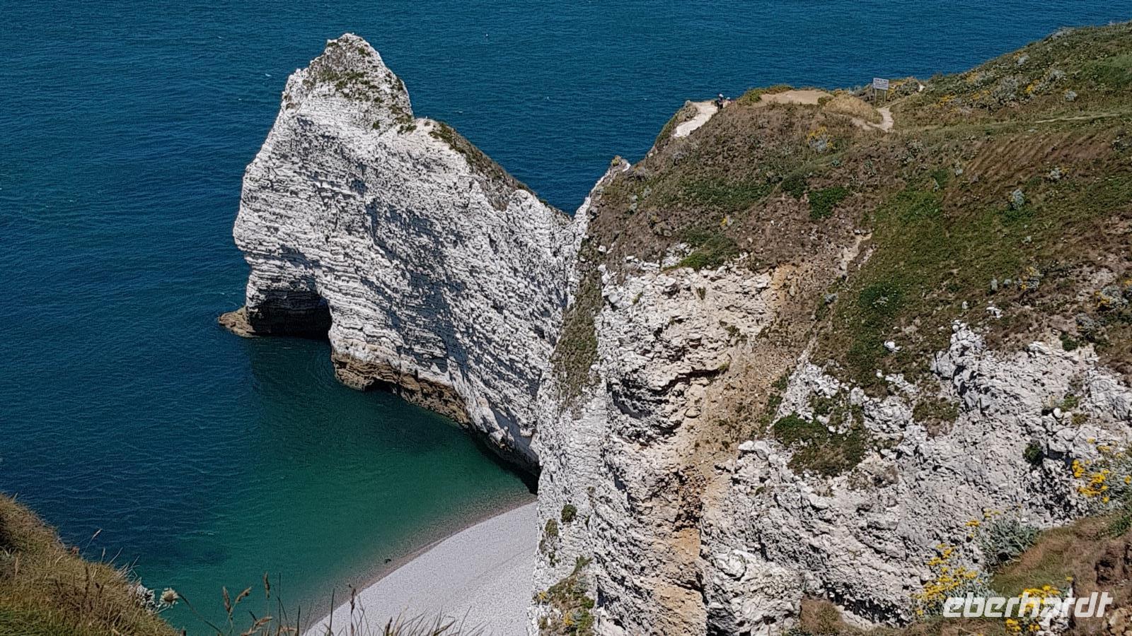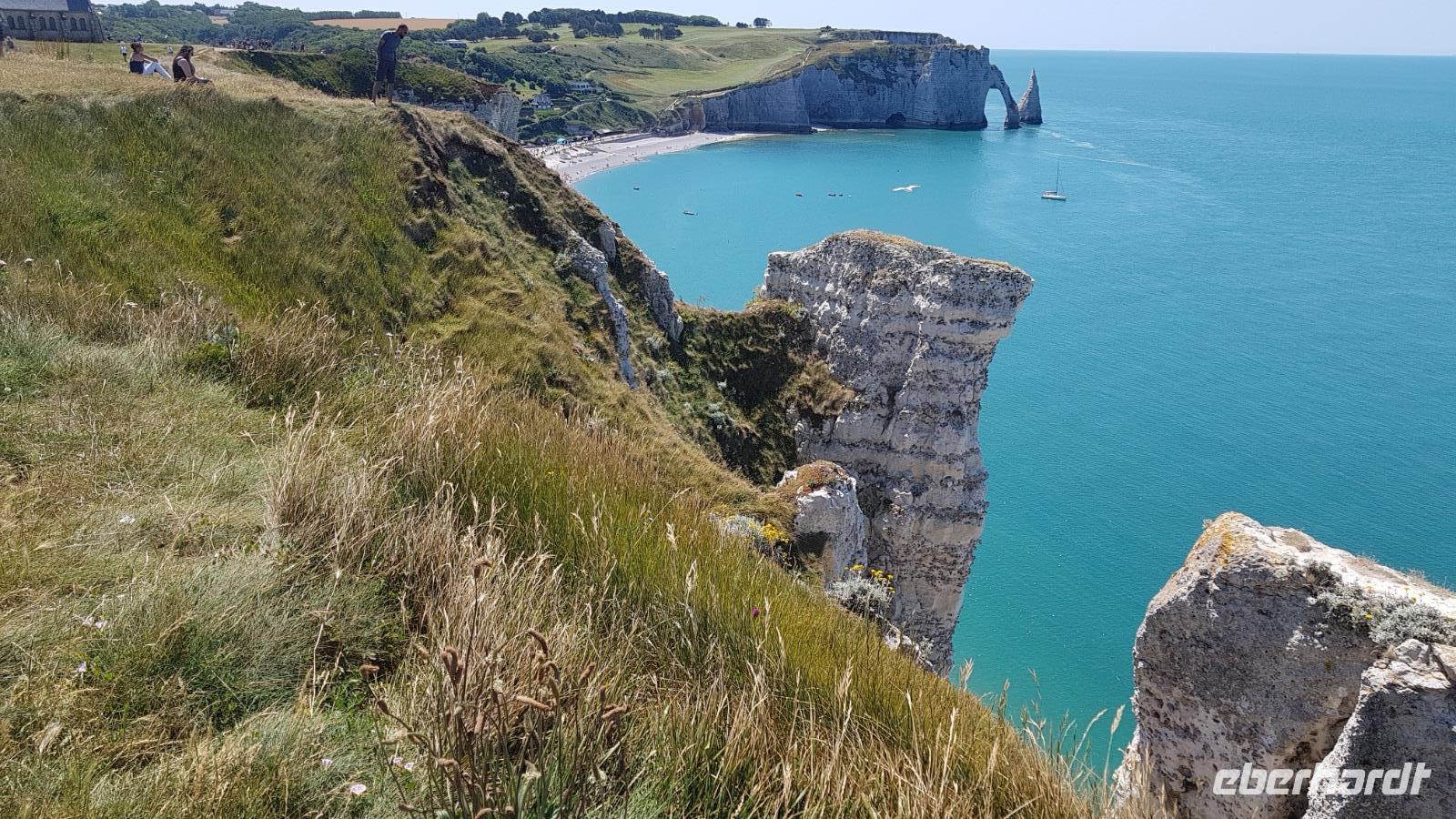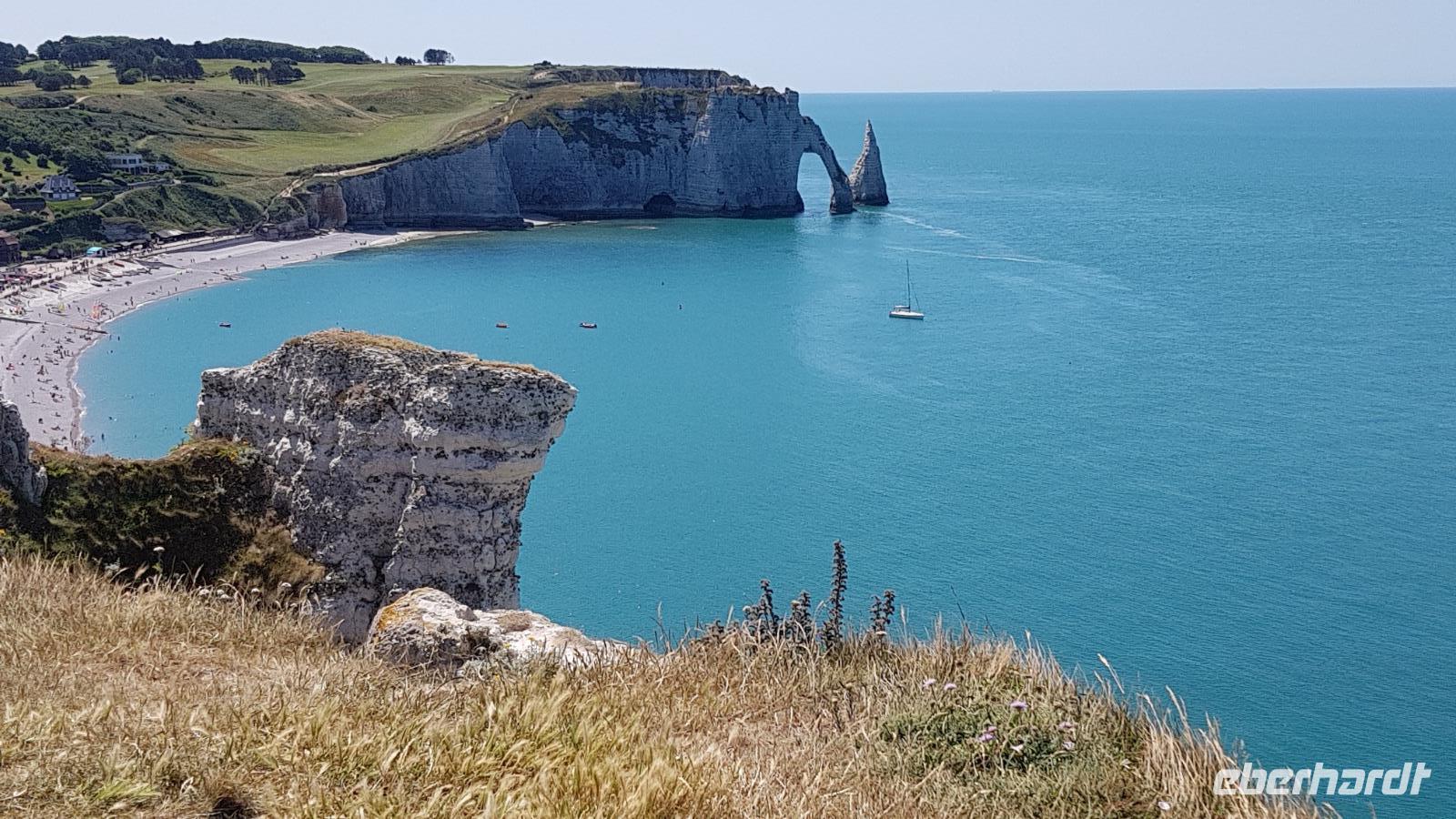 Ohne viel Zeit zu verlieren ging es gleich danach an die Côte d'Abatre, dem nach seine weißen Kreidefelsen benannten Küstenabschnitt der Oberen Normandie, nach Étretat. Hier erwartete uns unter strahlend blauem Himmel eine faszinierende Küstenlandschaft. Auf der Strandpromenade erhob sich links die helle Felswand der "Falaise d'Aval" und rechts die der "Falaise d'Amont". Bei diesem Licht war das Erlebnis dieser Küste einzigartig.