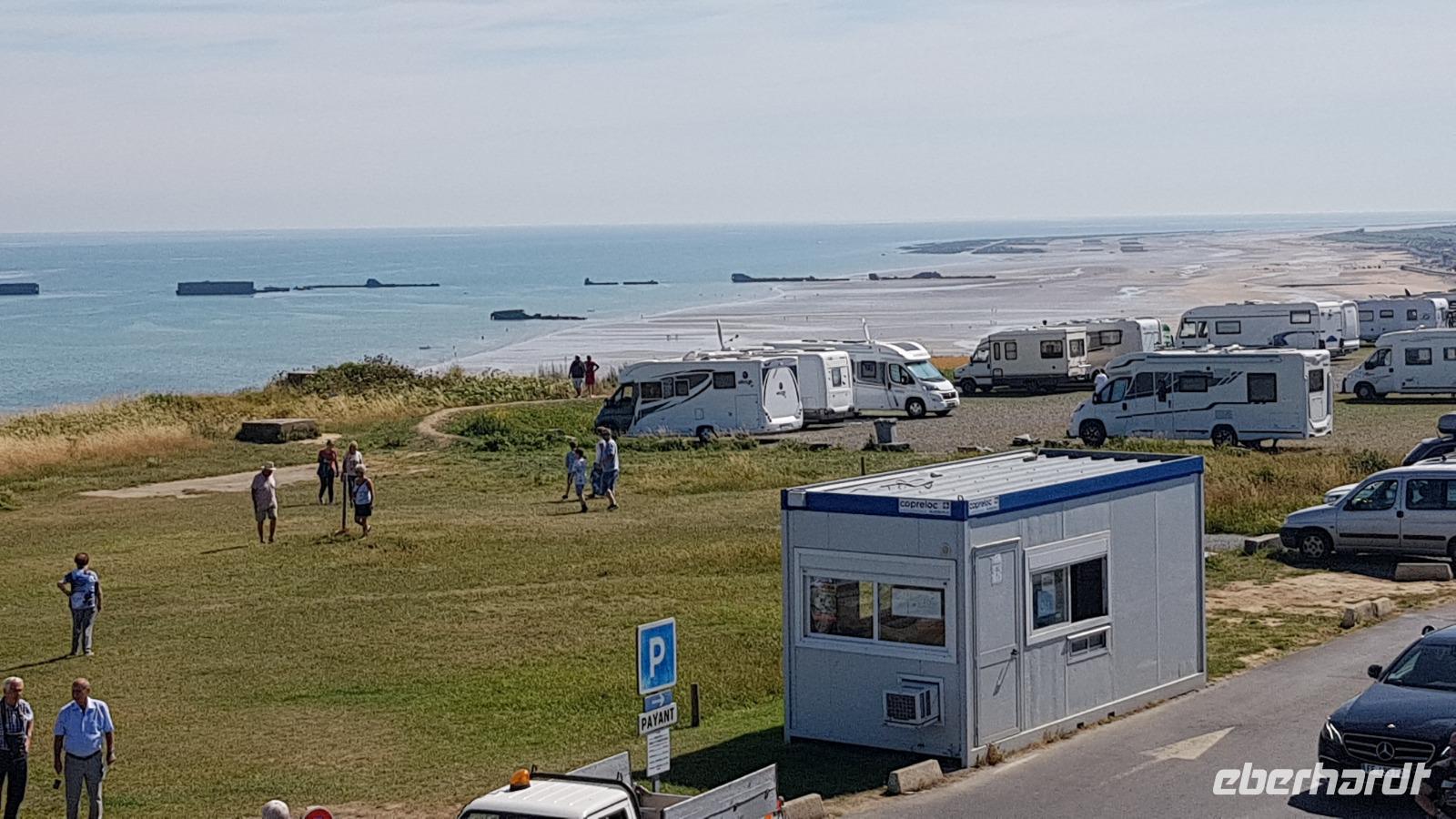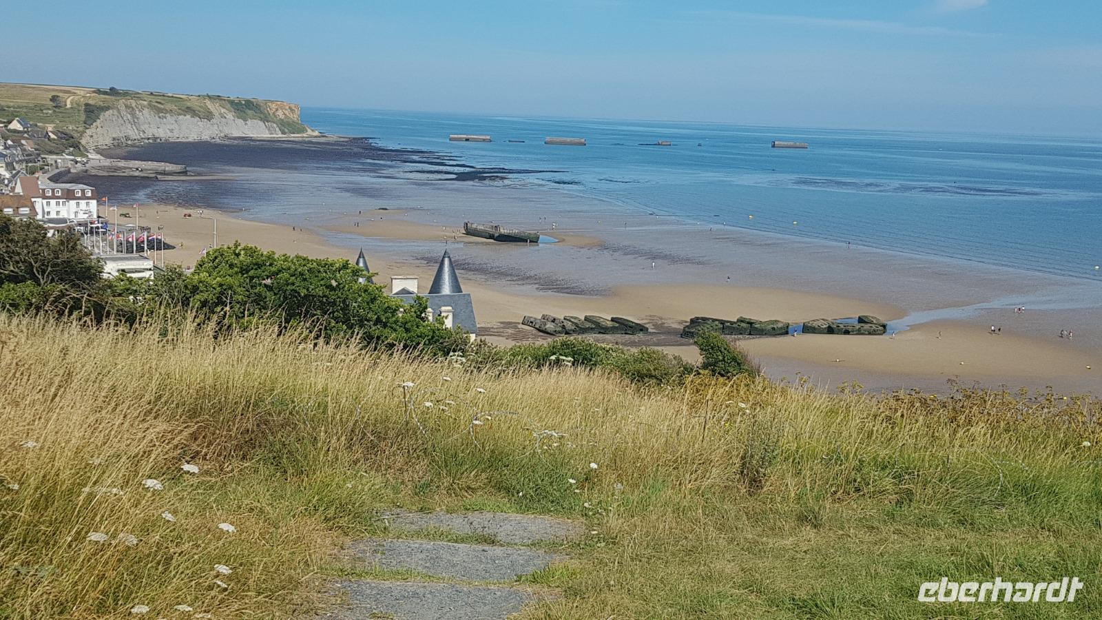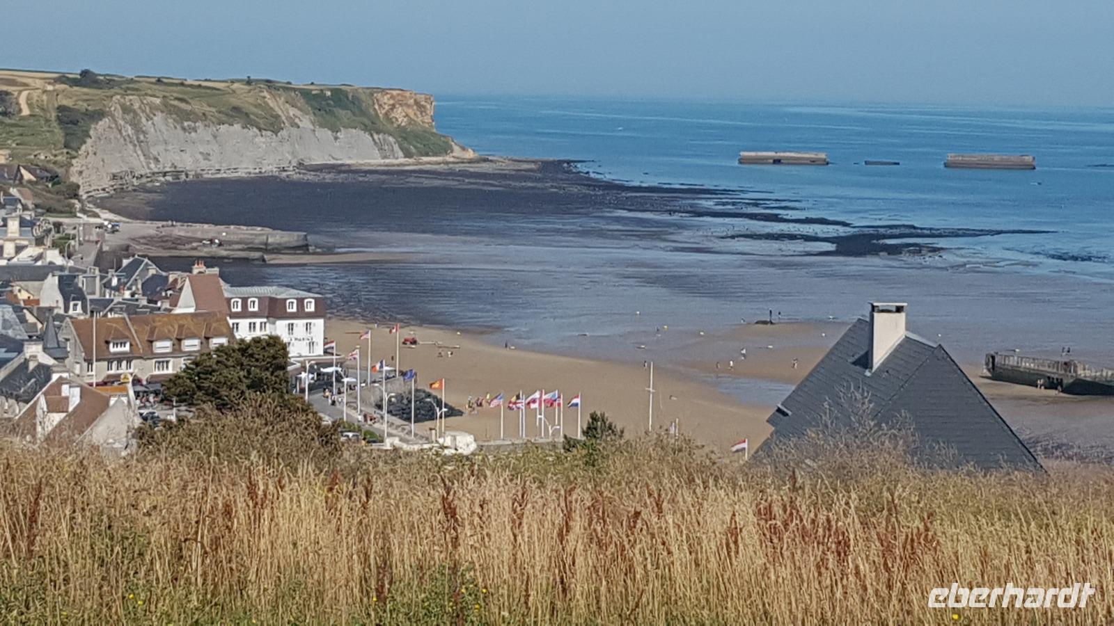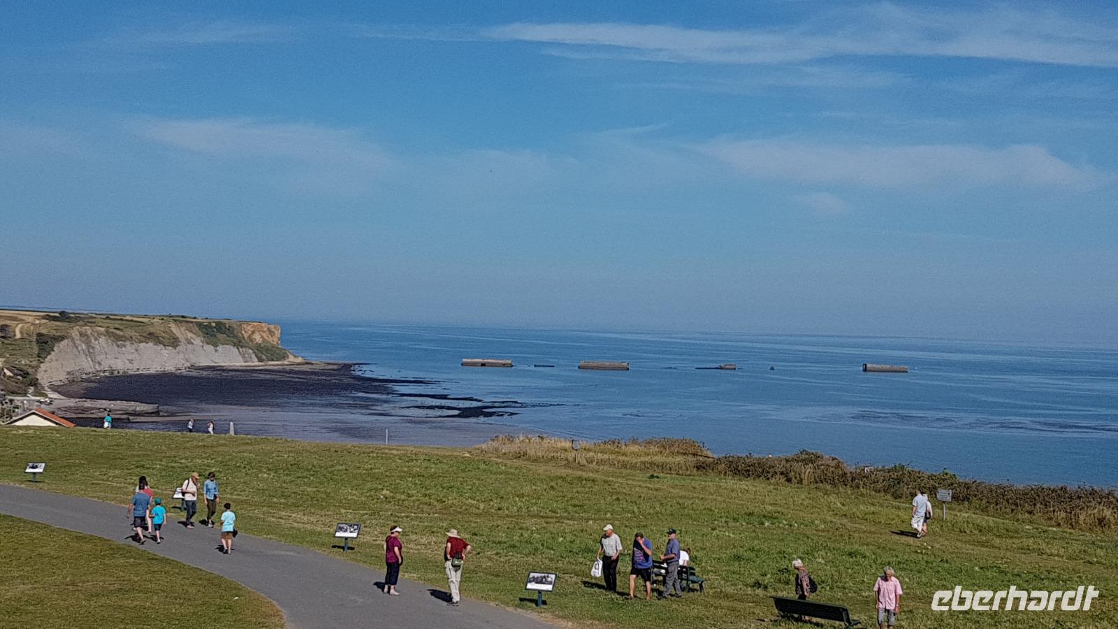 Nach diesem Stopp fuhren an dem Hochbunker von Riva Bella entlang, der einst die Verteidigung der Orne-Mündung koordinieren sollte. Schließlich erreichten wir mit dem Ort Arromanches die GOLD BEACH . Gleich nach der erfolgreichen Landung der Alliierten wurde hier der Mulberry Hafen angelegt, über den die ersten Truppentransporte gingen. Vom Aussichtspunkt hatten wir bei sonnigem Wetter eine prachtvolle Aussicht auf die Relikte der Pontonbrücken im Meer, die einst den provisorischen Hafen bildeten. Während unseres Aufenthaltes gingen einige von uns ins Kino, um den Dokumentarfilm über den D-Day zu sehen oder hinunter in den Ort. Andere zogen es vor, die Aussicht auf die Küste von Oben zu genießen.