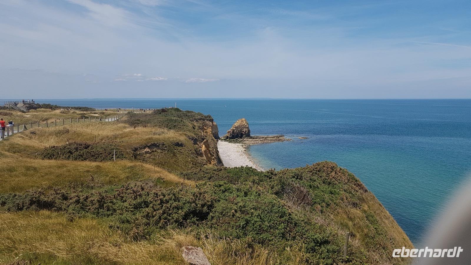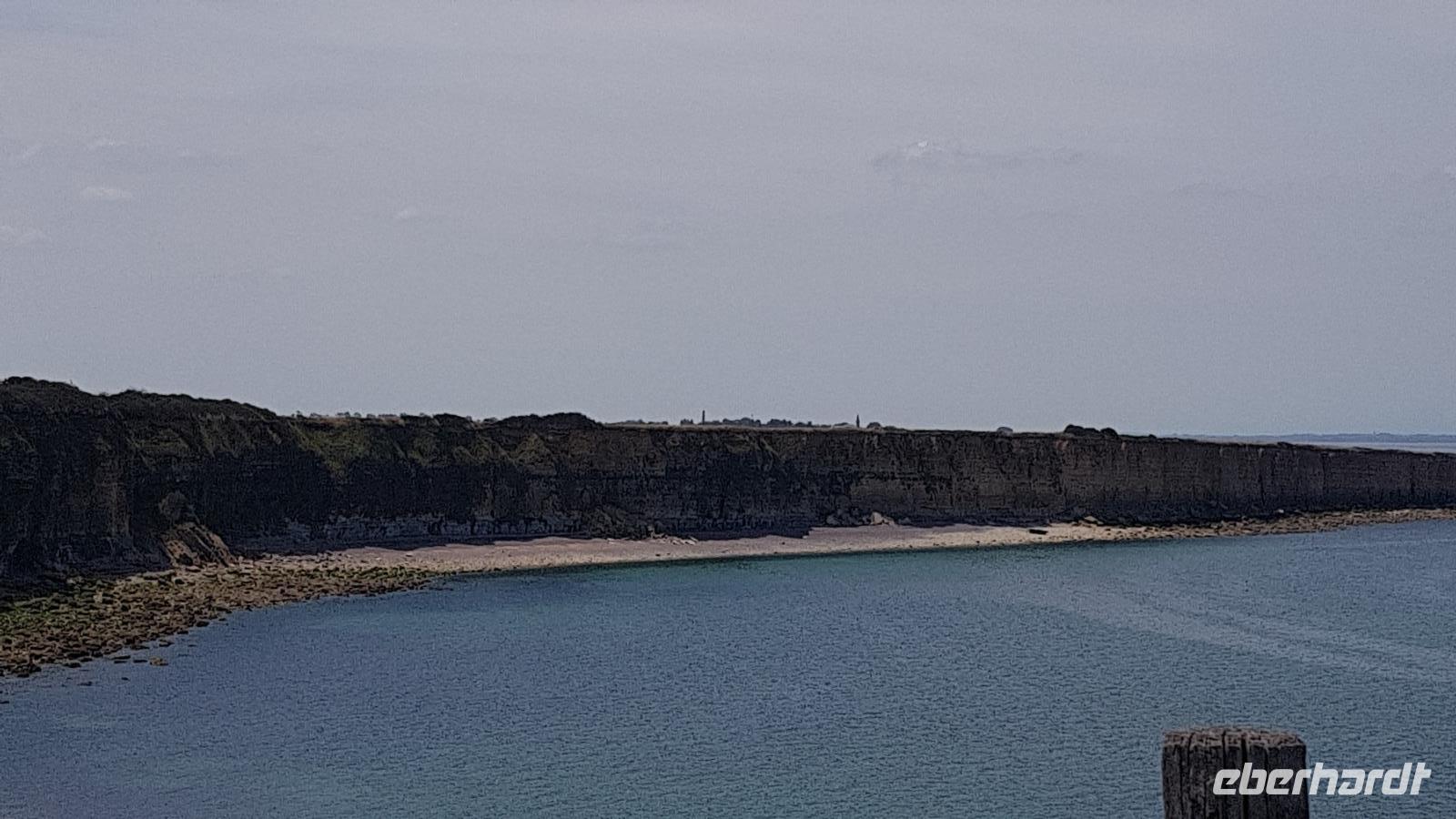 Unsere Mittagspause aus der Bordküche legten wir am Point du Hoc, einer Küste, die ebenfalls im Landungsabschnitt der OMAHA BEACH liegt, ein. Hier befanden sich sechs deutsche Stellungen, die die amerikanischen Landungsabschnitte OMAHA BEACH und UTAH BEACH kontrollierten. Um die Landung der US-Infanterie an diesen Küsten nicht zu gefährden, kletterte ein Rangerbataillon von 225 Männern mit Seilen und Leitern die Felswände hinauf und konnte nach harten Kämpfen am Morgen des D-Day die Klippen einnehmen. Dann wurden sie jedoch von deutschen Truppen beschossen und eingekesselt. Erst in der Nacht zum 8. Juni gelang dem 116. US-Infanterieregiment und einem weiteren US-Rangerbataillon der Durchbruch und damit die vollständige Einnahme diese Küstenabschnitts.