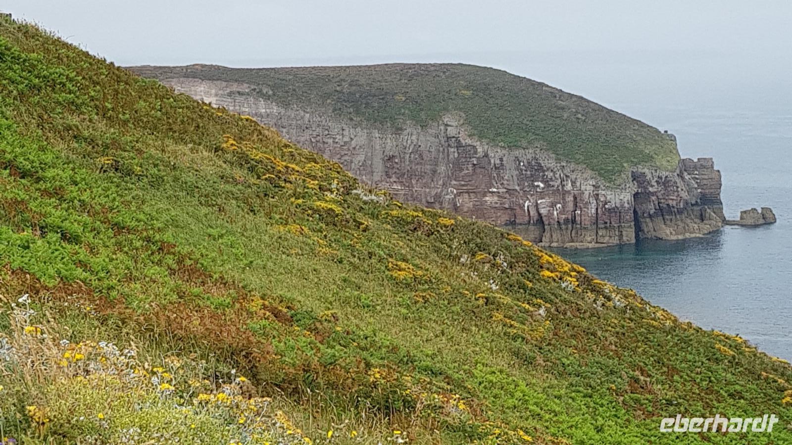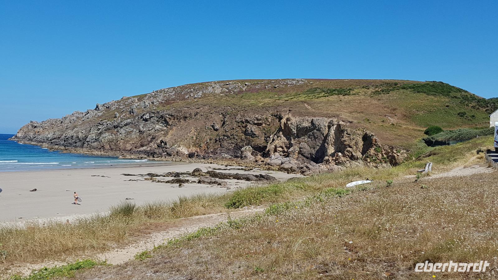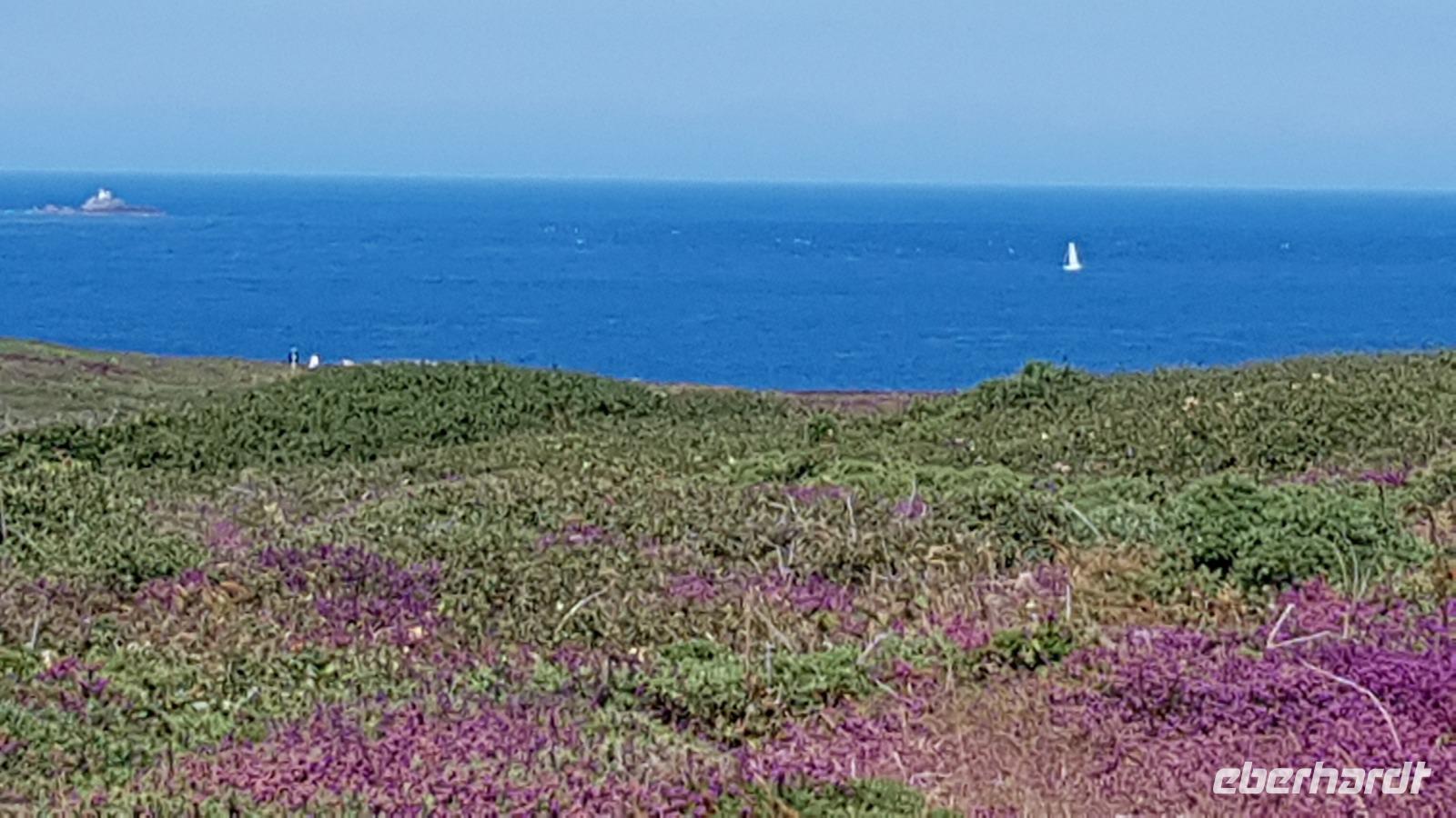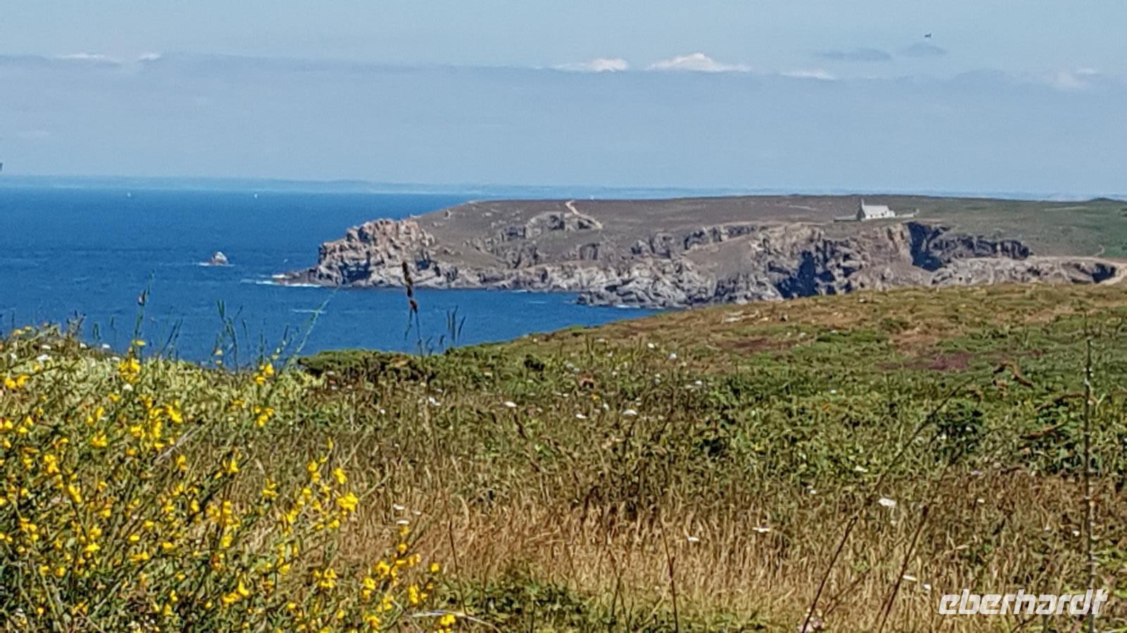 Anschließend fuhren wir zum Cap Sizun. Die Landzunge reicht ca. 30 km in den Atlantischen Ozean hinein und trennt die Iroise See im Norden vom Golf von Biskaya im Süden. Zunächst hielten wir in der Baie des Trépassés, der Bucht der Verschiedenen für einen Fotostopp, denn wir hatten heute eine ideale Sicht und konnten von hier aus sehr gut den Leuchtrum „Phare de Tévennec" sehen.