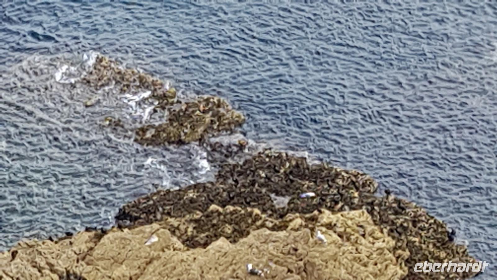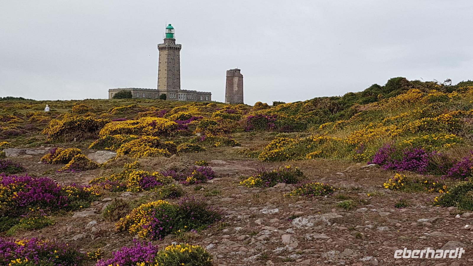 Die bis ca. 70 m hohen Klippen des Cap Fréhel an der Smaragdküste bot uns eine großartige Naturszenerie. Ein Teppich von gelbem Ginster und violetter Erika breitete sich rings um den alten Leuchtturm über den schroffen Felsen aus. Die bizarren Felsklippen wurden kreischend umkreist von großen Möwen während unterhalb von ihnen die Lumen im Wasser badeten.