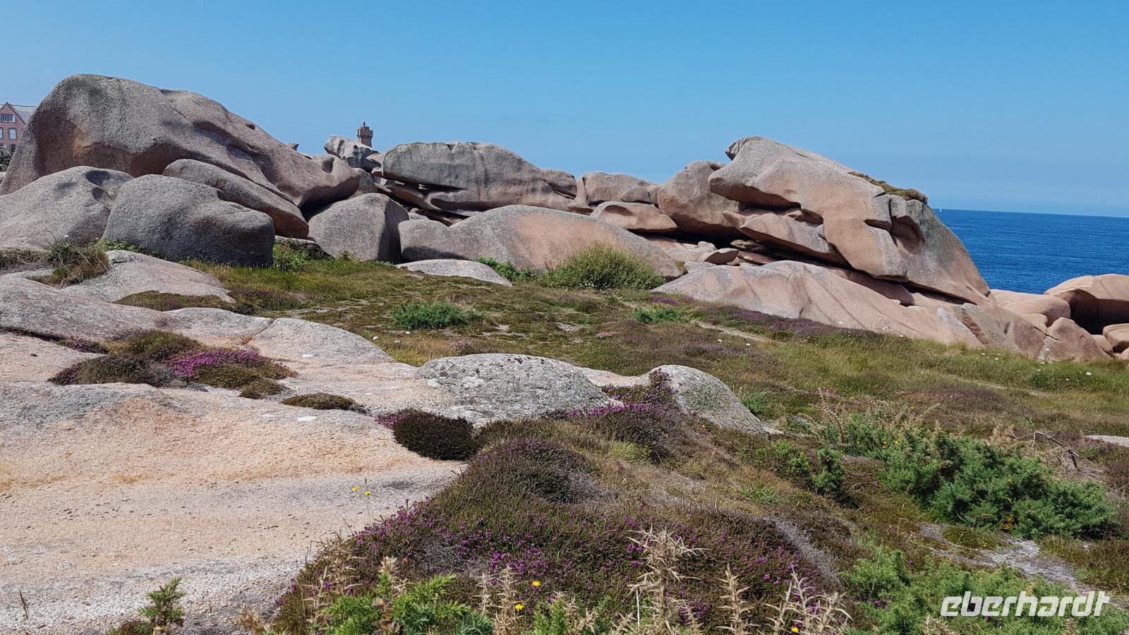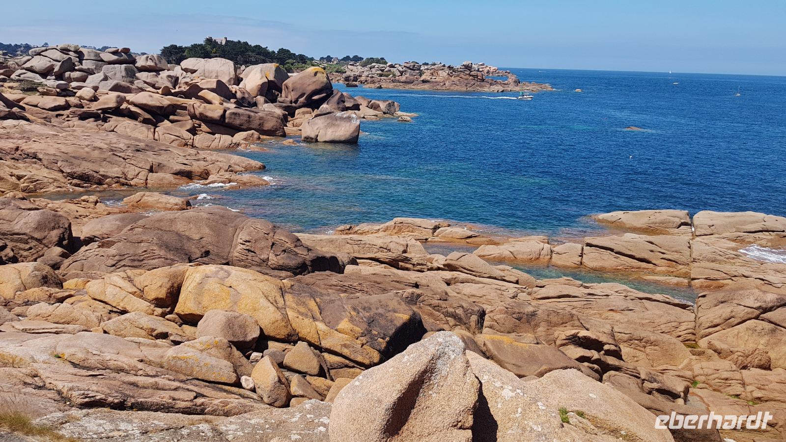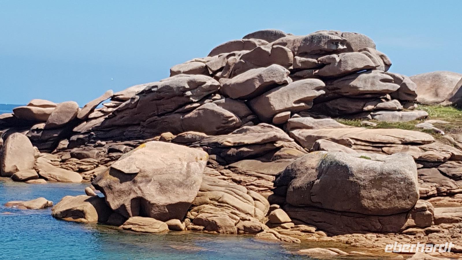 Dieser Küste folgte später eine weitere faszinierende bretonische Küste. Um die Mittagszeit erreichten wir die rosafarbene Granitküste, die Côte d'Granit Rose, sein. Zuerst hielten wir kurz oberhalb von Perros-Guirec für einen Fotostopp. Dann ging es weiter nach Ploumanac'h, wo wir unter strahlend blauem Himmel auf dem alten Zöllnerpfad entlang wanderten. Hier türmten sich gigantische Felskolosse auf, deren bizarre Formen für unsere Fantasie ein Fest war.