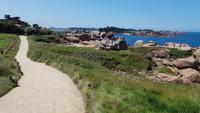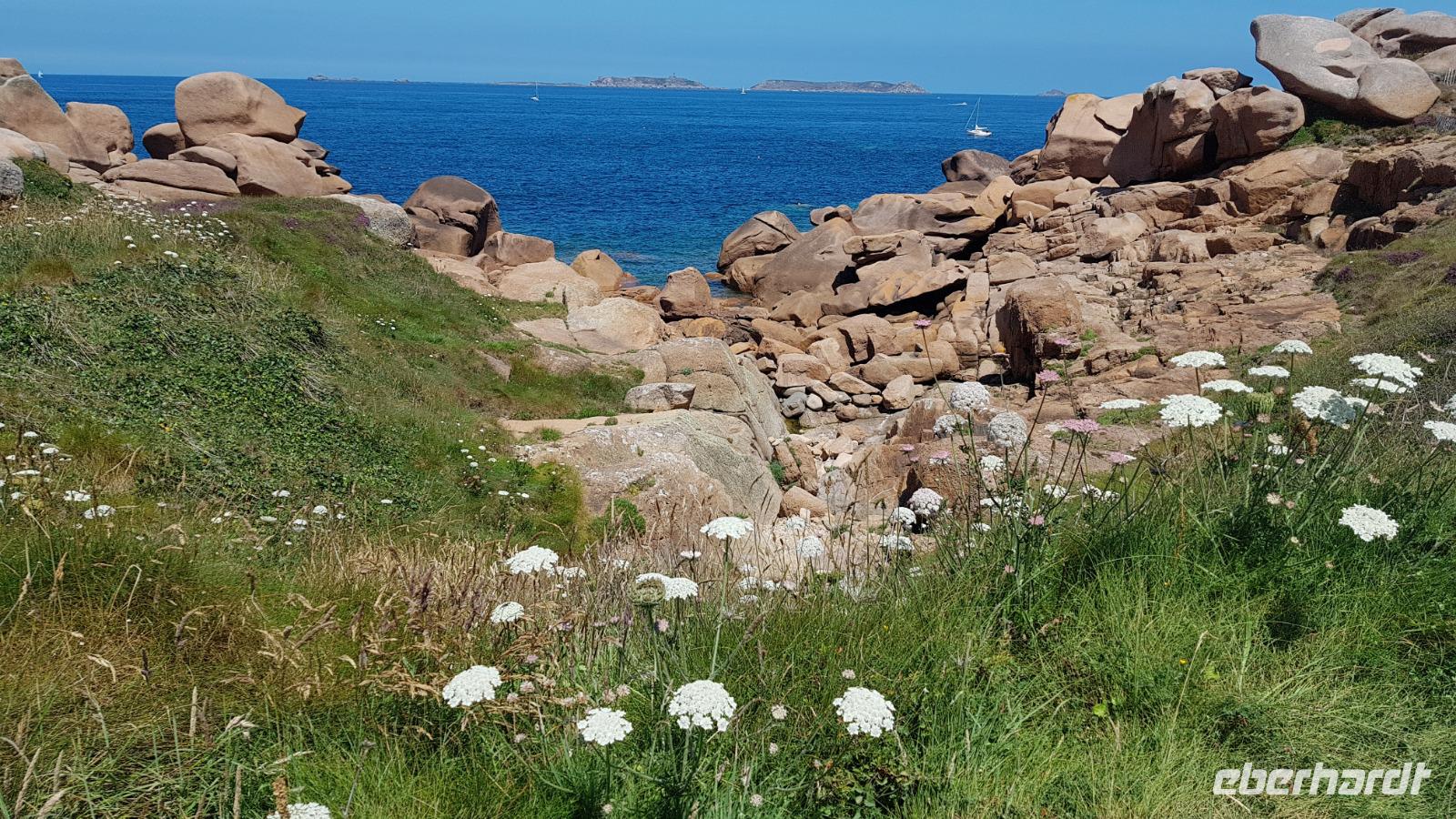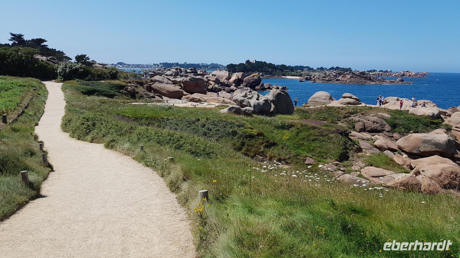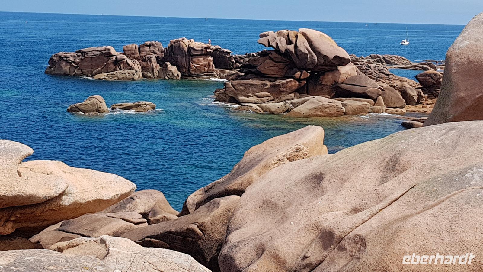Dieser Küste folgte später eine weitere faszinierende bretonische Küste. Um die Mittagszeit erreichten wir die rosafarbene Granitküste, die Côte d'Granit Rose, sein. Zuerst hielten wir kurz oberhalb von Perros-Guirec für einen Fotostopp. Dann ging es weiter nach Ploumanac'h, wo wir unter strahlend blauem Himmel auf dem alten Zöllnerpfad entlang wanderten. Hier türmten sich gigantische Felskolosse auf, deren bizarre Formen für unsere Fantasie ein Fest war.