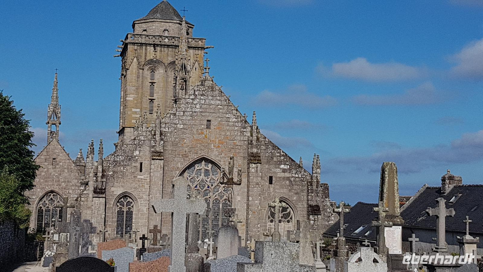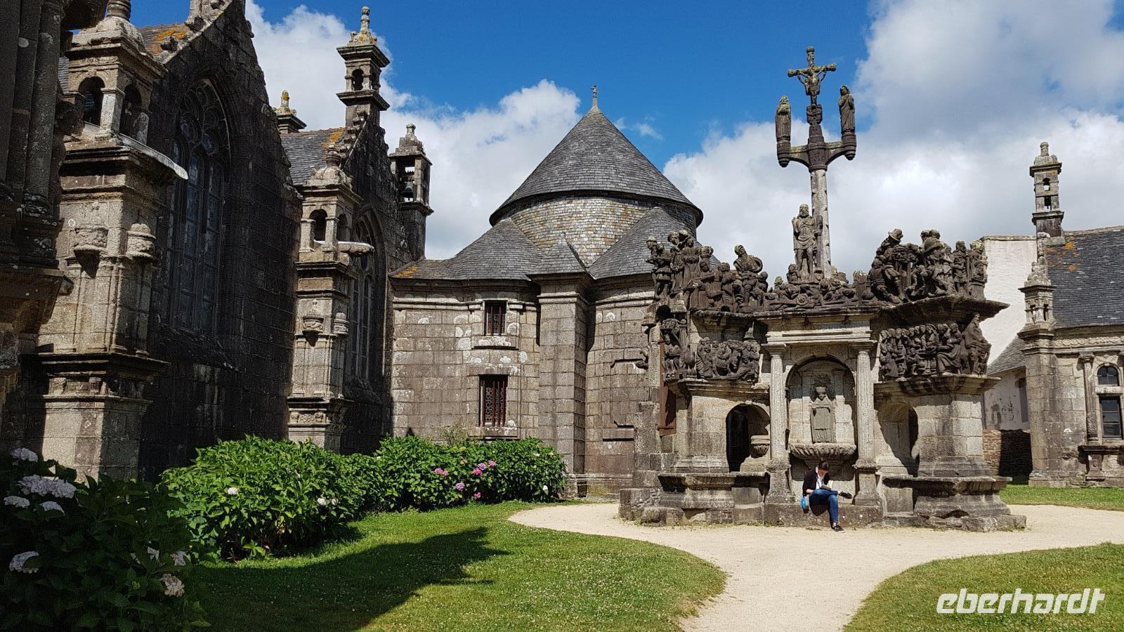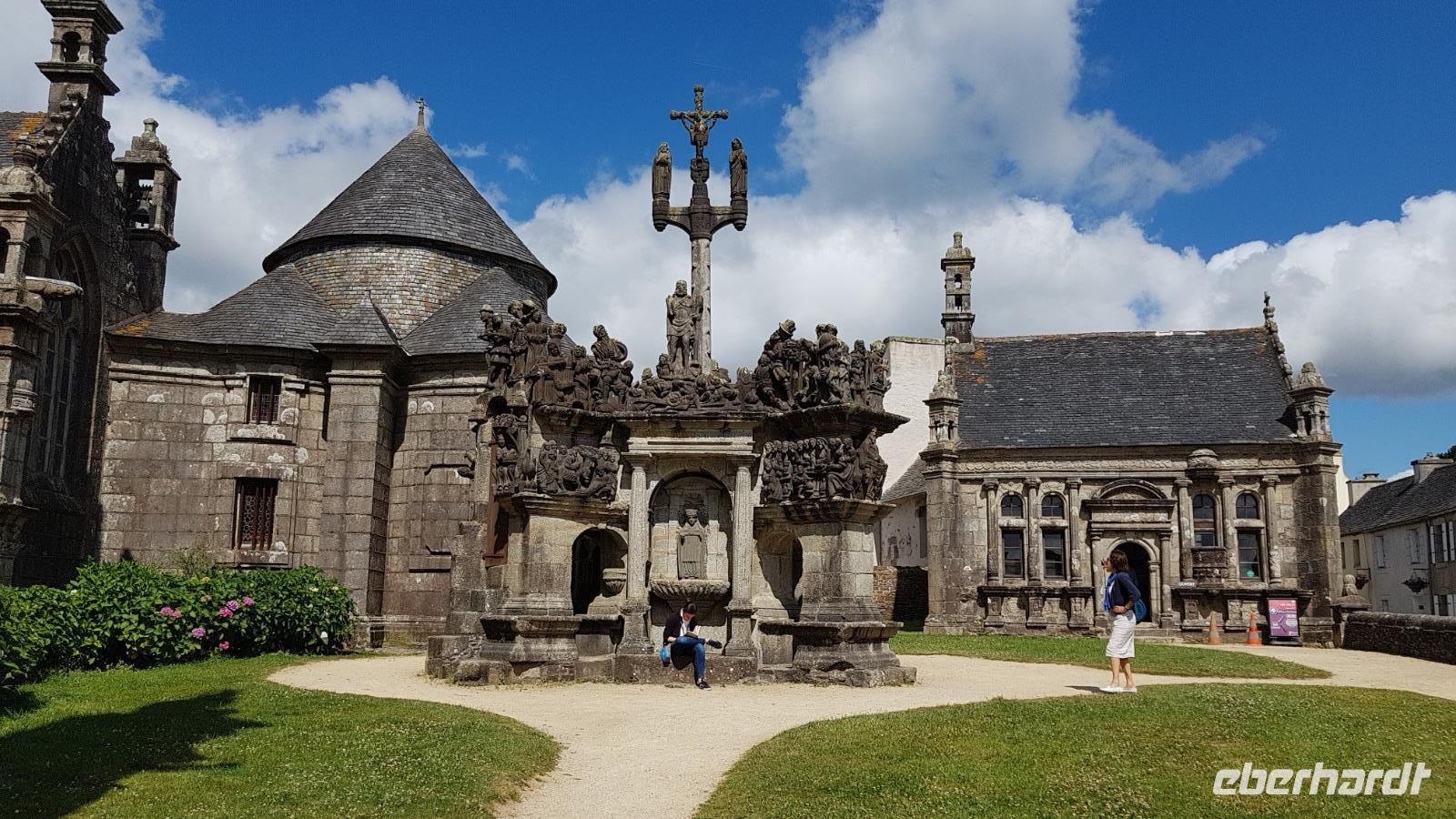 Als wir auf dem Marktplatz eintrafen wurde gerade an der Errichtung von zwei großen Tribünen vor der Kirche gearbeitet. Alle waren in fieberhafter Aktivität, den morgen sollte die „Große Troménie" stattfinden, eine große kirchliche Prozession, die nur alle sechs Jahre veranstaltet wird. So war uns der Blick über den Marktplatz und auf den schönen Brunnen zwar verstellt, die Kirche jedoch konnten wir ungehindert besichtigen.