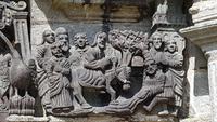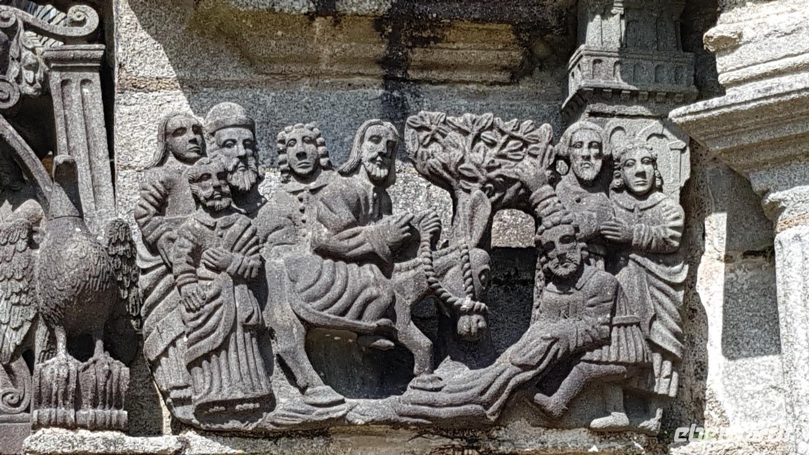 Nach dem Erlebnis dieser spektakulären Felslandschaft an der rosafarbenen Granitküste fuhren wir in den Süden der Bretagne. Im Departement Finistère ankommen, hielten wir in dem Dorf Guimiliau, das für seinen Kalvarienberg weithin berühmt ist. Ein hoch aufragendes Triumphtor bildet den Eingang zu einem umfriedeten Kirchhof, auf dem sich der Kalvarienberg befindet. Er wurde zwischen 1581 und 1588 geschaffenen und zeigt eindrucksvolle Szenen der Passion, die unter einem mächtigen Kreuz dargestellt sind. Ebenfalls aus dem 16. Jahrhundert stammt die Kirche. Sie hat eine reiche Ausstattung zu der auch eine wunderschöne Taufe gehört.
