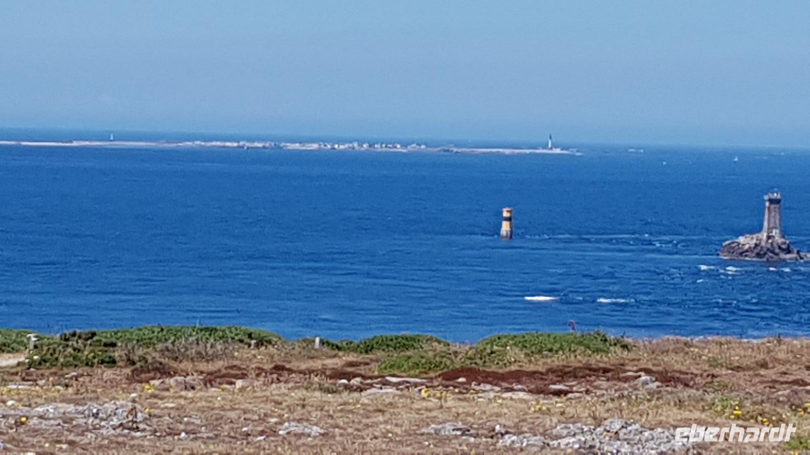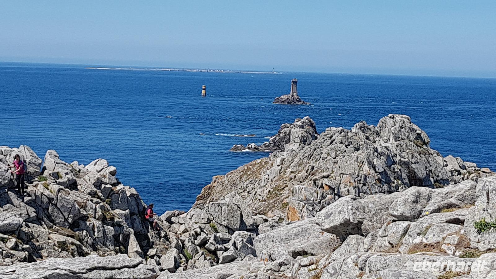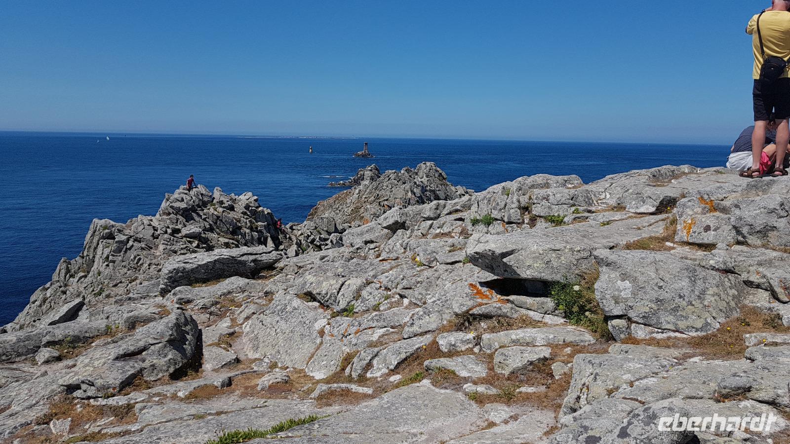 Nach diesem Traumstrand erreichten wir den Parkplatz der Pointe du Raz, der spektakulärste westliche Ausläufer des Caps. Zu ihr führte vom Parkplatz ein ca. 15 minütiger Fußweg. Vor der Pointe du Raz liegen unzählige Klippen. Sie und die starken Gezeitenströme waren einst lebensgefährlich für die Schifffahrt. In den vergangenen Jahrhunderten kam es hier immer wieder zu Schiffsbrüchen. Inzwischen erreichen die Schiffe in einem großen Bogen die ca. 8. km westlich liegende Ile de Sein. Heute, bei dieser fantastischen Sicht konnten wir nicht nur die Ile de Sein sehr gut sehen sondern auch die Pointe de Corsen vor Brest - den westlichsten Punkt des französischen Festlandes.
