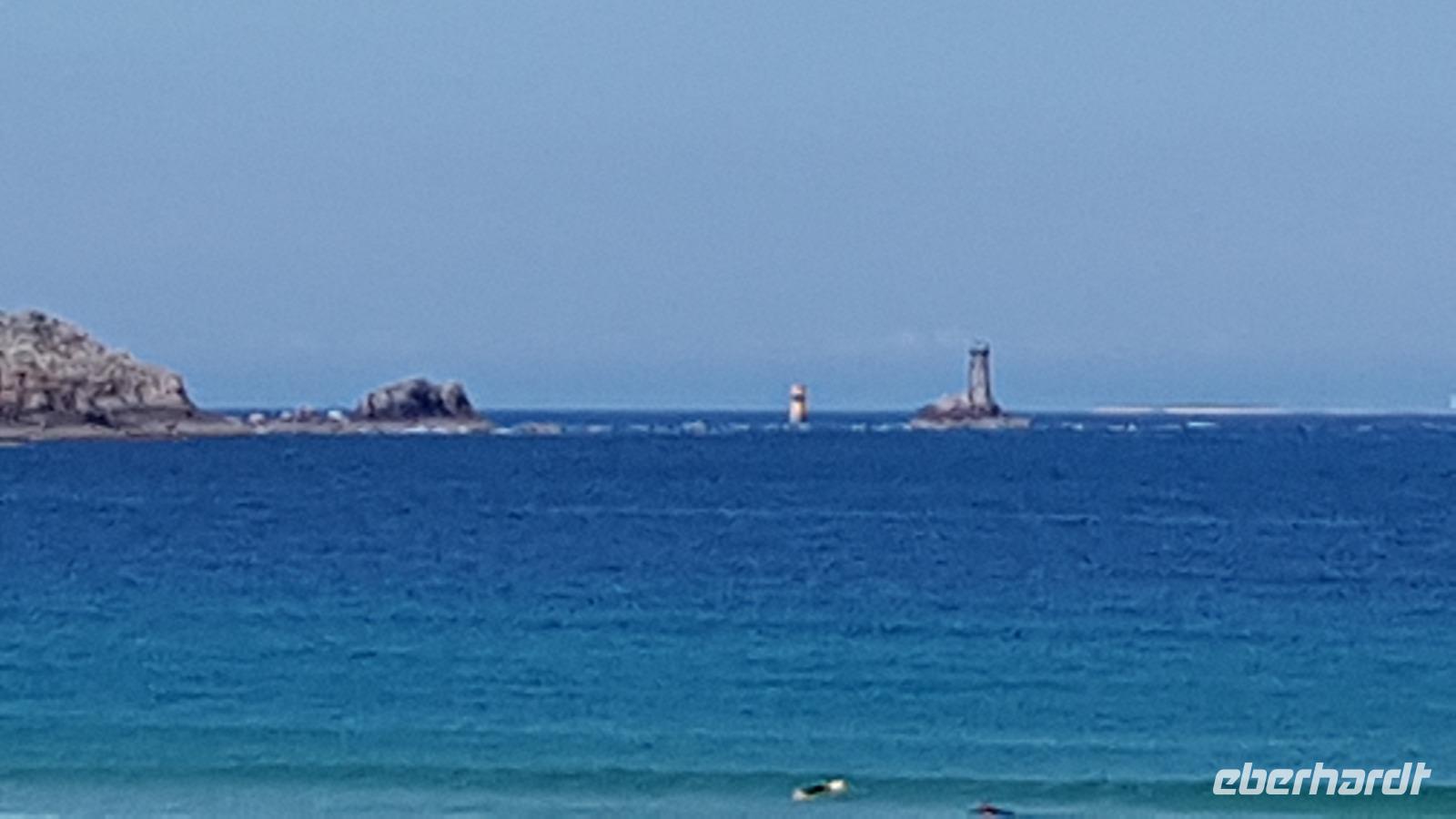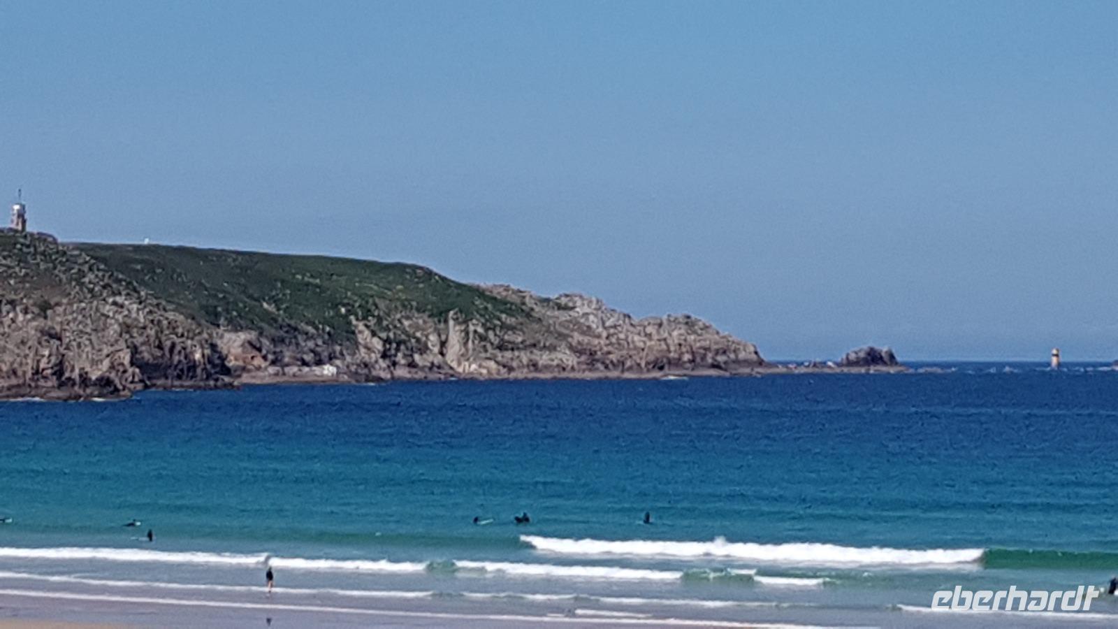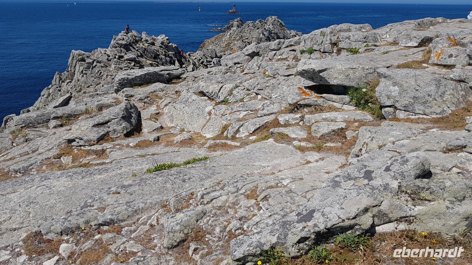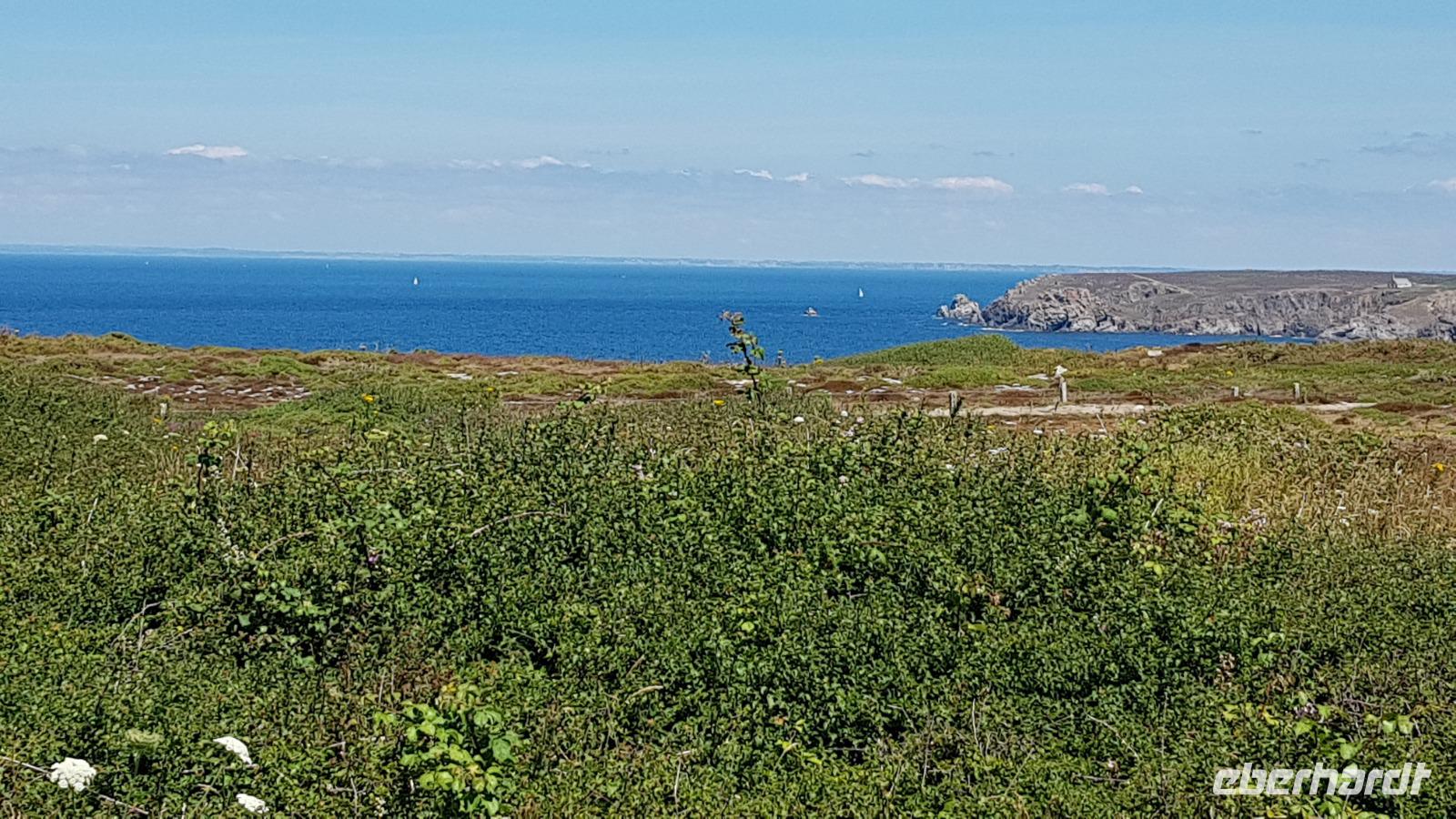 Nach diesem Traumstrand erreichten wir den Parkplatz der Pointe du Raz, der spektakulärste westliche Ausläufer des Caps. Zu ihr führte vom Parkplatz ein ca. 15 minütiger Fußweg. Vor der Pointe du Raz liegen unzählige Klippen. Sie und die starken Gezeitenströme waren einst lebensgefährlich für die Schifffahrt. In den vergangenen Jahrhunderten kam es hier immer wieder zu Schiffsbrüchen. Inzwischen erreichen die Schiffe in einem großen Bogen die ca. 8. km westlich liegende Ile de Sein. Heute, bei dieser fantastischen Sicht konnten wir nicht nur die Ile de Sein sehr gut sehen sondern auch die Pointe de Corsen vor Brest - den westlichsten Punkt des französischen Festlandes.