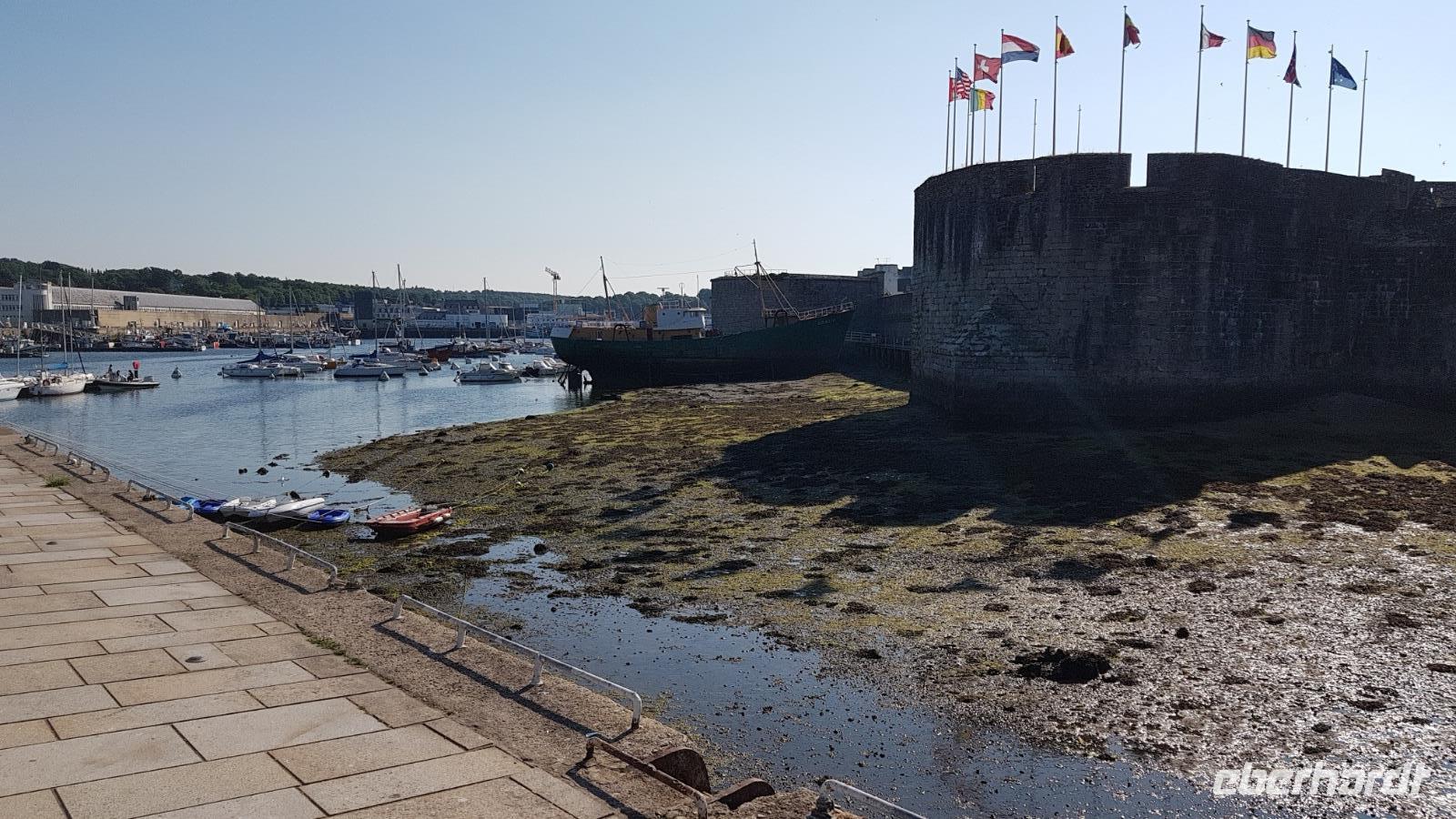 Früh am Morgen fuhren wir wieder zur Schnellstraße N 165, um in den Süden der Bretagne zu gelangen. Zuerst hielten wir in Concarneau, um uns die alte Festungsstadt anzusehen. Sie gehörte in ihrer Vergangenheit zu den wichtigsten Festungen der Bretagne und ist bis heute von einer stattlichen Festungsmauer umgeben. Seit dem 12. Jahrhundert ist die einstige Insel durch eine Brücke mit dem Festland verbunden. Der Haupterwerbszweig der Fischer von Concarneau war früher die Sardienenfischerei. 1905 jedoch blieben die Sardinenschwärme plötzlich aus, was zu Armut und Ratlosigkeit unter den Fischern führte. Da kamen die Künstler im nahen Pont-Aven auf die glänzende Idee, ein Fest als Wohltätigkeitsveranstaltung für die Fischer zu organisieren, das ein voller Erfolg wurde. Seit dem feiert man hier jedes Jahr Mitte August das "Festival der blauen Netze" (Fête des Filets Bleus).