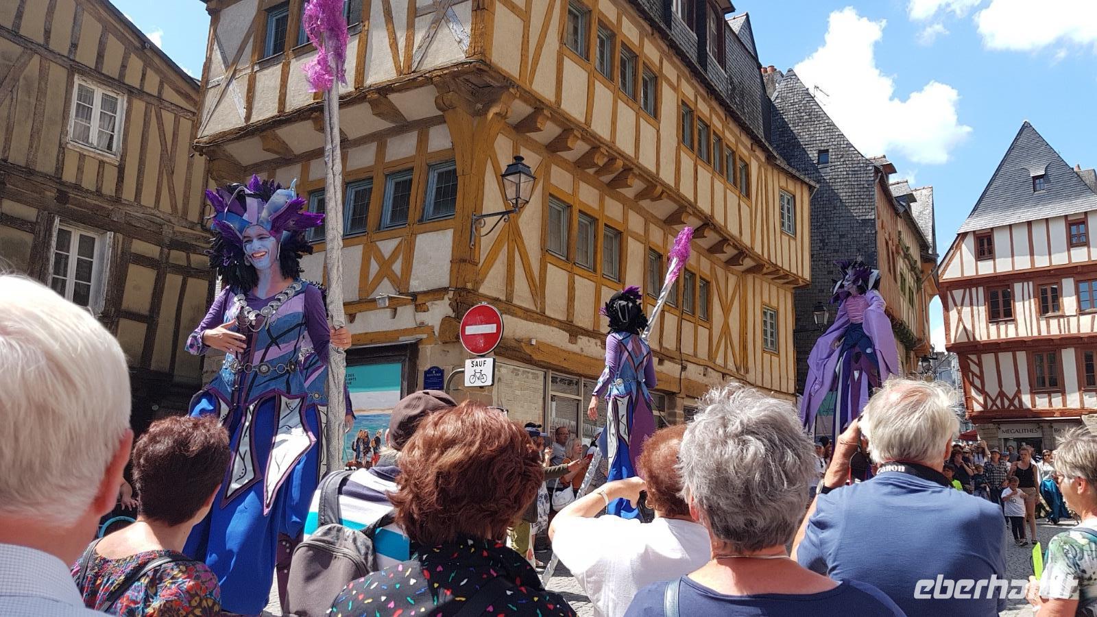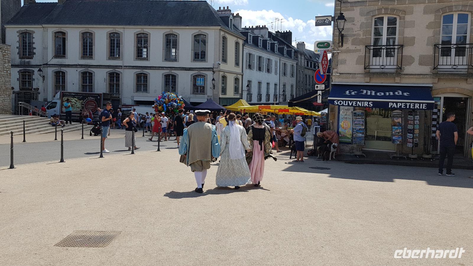 Am frühen Nachmittag fuhren wir weiter nach Vannes, der Hauptstadt des Départements Morbihan. Auch hier war ein großes Fest in Vorbereitung. Vannes feierte anlässlich des französischen Nationalfeiertages am 14. Juli ein historisches Fest mit Umzügen kostümierter Gruppen und historischer Musik auf alten bretonischen Instrumenten. Unsere örtliche Stadtführerin Regula hatte wahre Mühe, uns bei diesem Trubel zusammen zu halten. Doch nach der Führung und später am Abend nutzten manche aus unserer Gruppe die wunderbare Gelegenheit, um von unserem nahe der Altstadt gelegenen Hotel loszuziehen und nach wenigen Minuten die historischen Umzüge mit zu erleben. Das war ein bretonisches Highlight vom Feinsten, denn bretonischer als bei diesem fulminanten, historischen Fest in der malerischen Altstadt von Vannes kann man die Bretagne nicht erleben. Gegen Mitternacht gab es noch das für viele französische Städte am 14. Juli obligatorische Feuerwerk, dass die meisten von uns jedoch im Hotel erlebten.