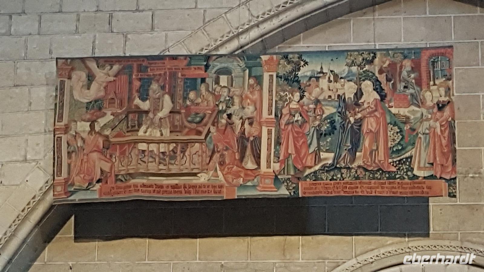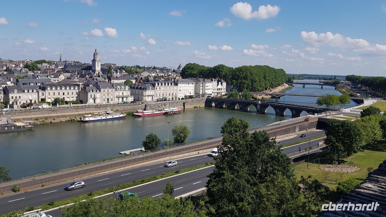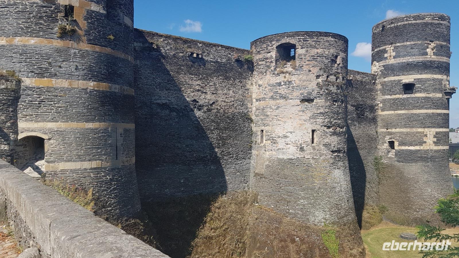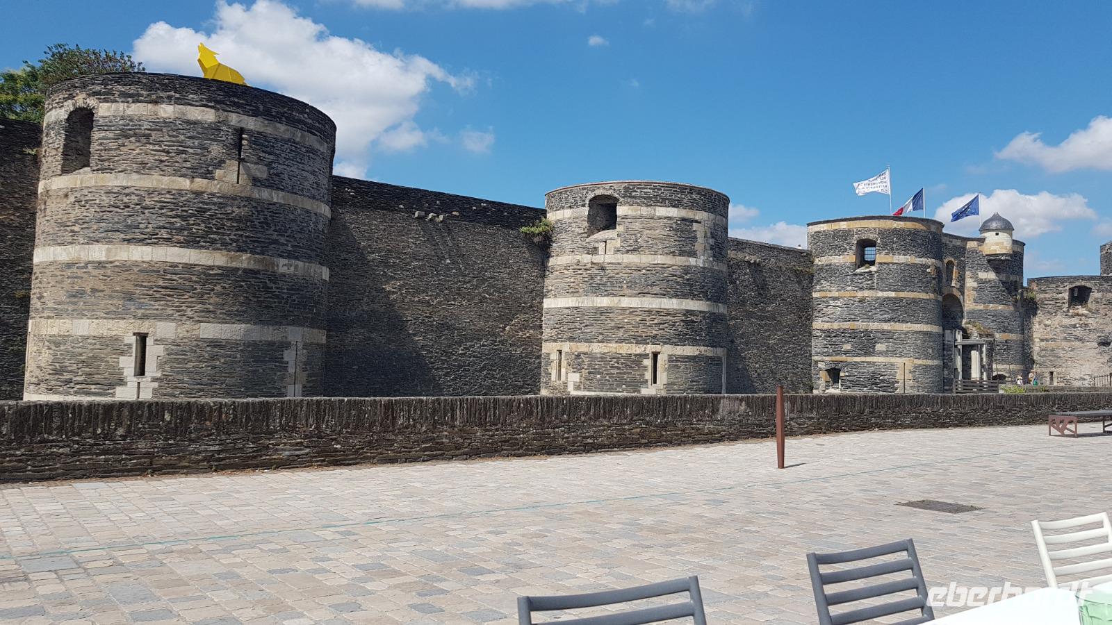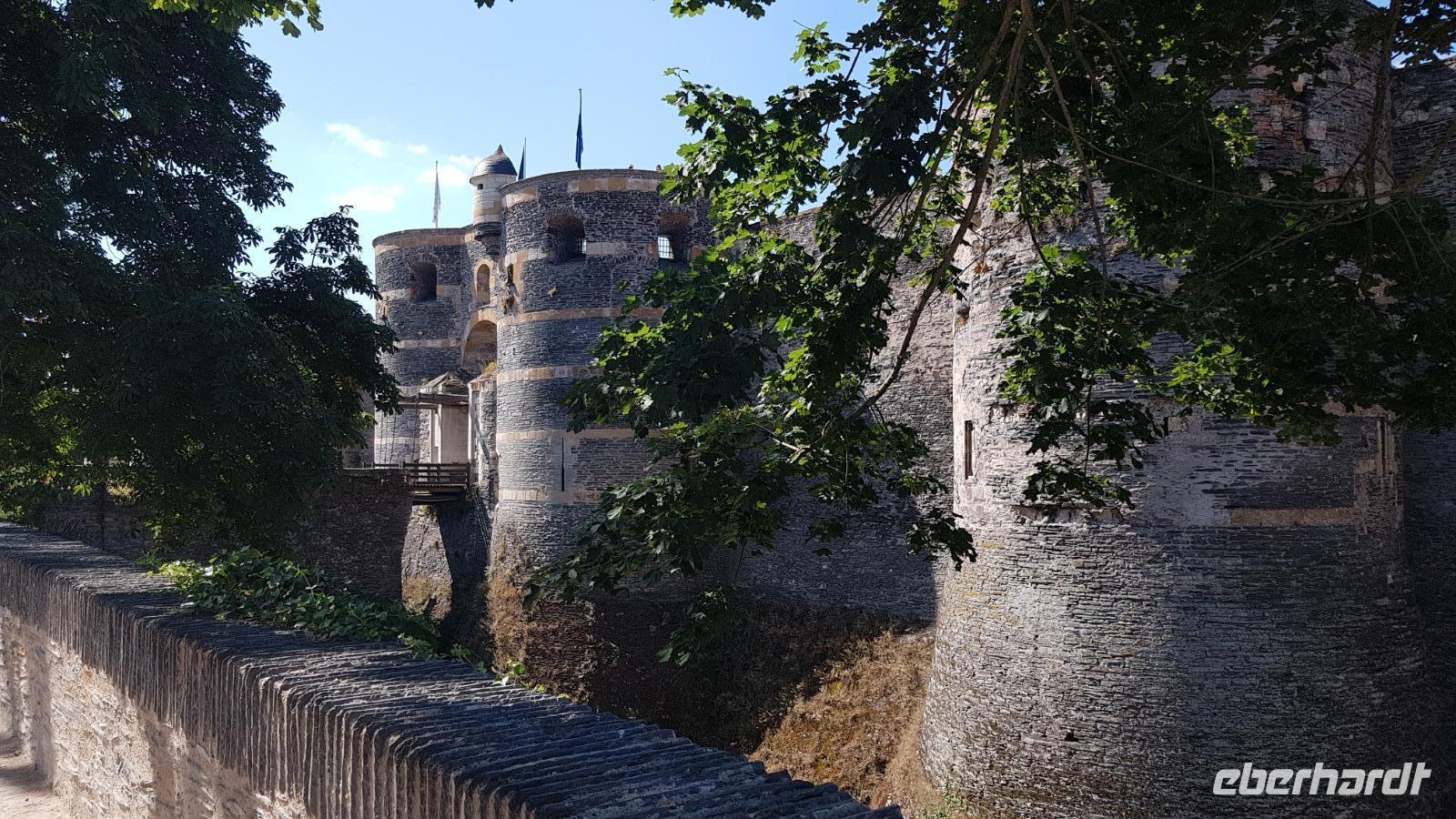 Gegen Mittag begrüßte uns die imposante Burganlage von Angers. Am Fluss Maine war Angers einst Hauptstadt des Anjou und gehörte zur Zeit der Plantagenet, zu dem gigantischen Reich, das von Schottland bis zu den Pyrenäen reichte. Mitte des 12. Jahrhunderts begann die Blütezeit von Angers, die mit dem Tod des Herzogs Réne, des letzten Herzogs des Anjou, im Jahr 1480 abrupt endete. Erhalten blieb aus dieser Periode die beeindruckende Festungsanlage, die im Auftrag der Regentin Blanka von Kastilien und ihres zweiten Sohnes, des späteren Herzogs Karl von Anjou, errichtet wurde, um das Herzogtum von Angriffen der Bretonen zu schützen. Das Kostbarste jedoch, das uns aus der Blütezeit Angers erhalten blieb ist der Teppichzyklus zur Apokalypse des Johannes, dem letzten Buch des Neuen Testaments, der heute in einem modernen Museumsbau innerhalb des Festungshofes ausgestellt ist. Der Auftraggeber dieser Zyklus, war Herzog Ludwig I. von Anjou, Bruder des Königs Karl V.. Dessen Hofmaler Jean de Bruges 1373-1380 schuf die Entwürfe für den Wandteppichzyklus, der in der Pariser Werkstatt des berühmten Nicolas Bataille gewebt wurde.