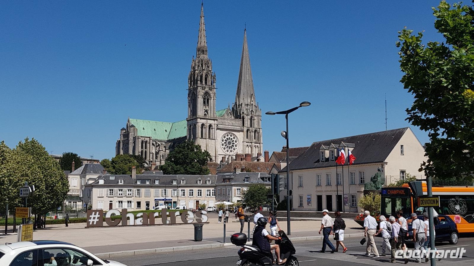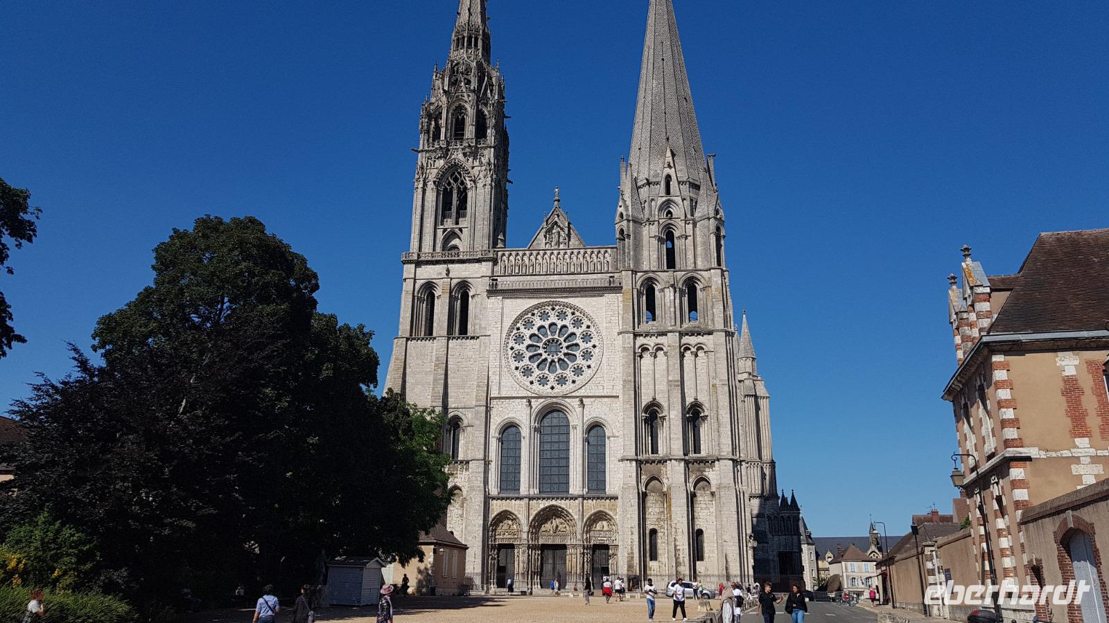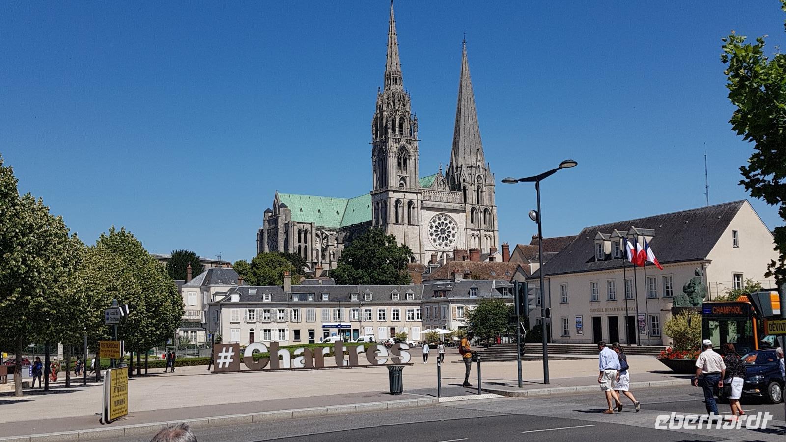 Dann ging es mit unserem Bus direkt in Richtung Paris weiter. Eine gute Stunde vor Paris jedoch fuhren wir noch einmal von der Autobahn ab, um die weltberühmte Kathedrale von Chartres zu besichtigen. Sie ist der Musterbau für viele später erbauten Kathedralen - vor allem in Deutschland. Die Kathedrale ist seit 1979 UNESCO Weltkulturerbe, da sie aus der Zeit ihrer Erbauung nahezu unverändert erhalten geblieben ist und ein Schlüsselstellung unter den Kathedralen Frankreichs einnimmt. So trifft man hier am Westportal auf die ältesten Zeugnissen gotischer Bauplastik und findet hier zum ersten Mal in der Gotik den Grundriss eines lateinischen Kreuzes sowie einen dreigeschossigen Wandaufriss und ein vierteilige Gewölbe vor. Darüber hinaus gehören die umfangreichen Glasfensterzyklen der Kathedrale von Chartres zu den ältesten und bedeutendsten Zeugnissen der französischen Glasmalerei.
