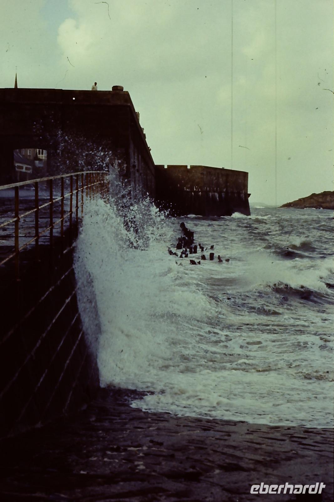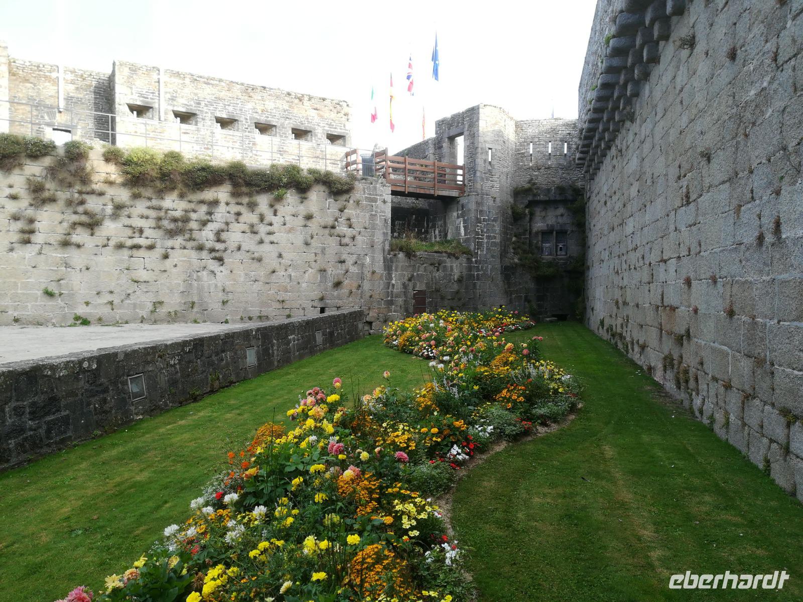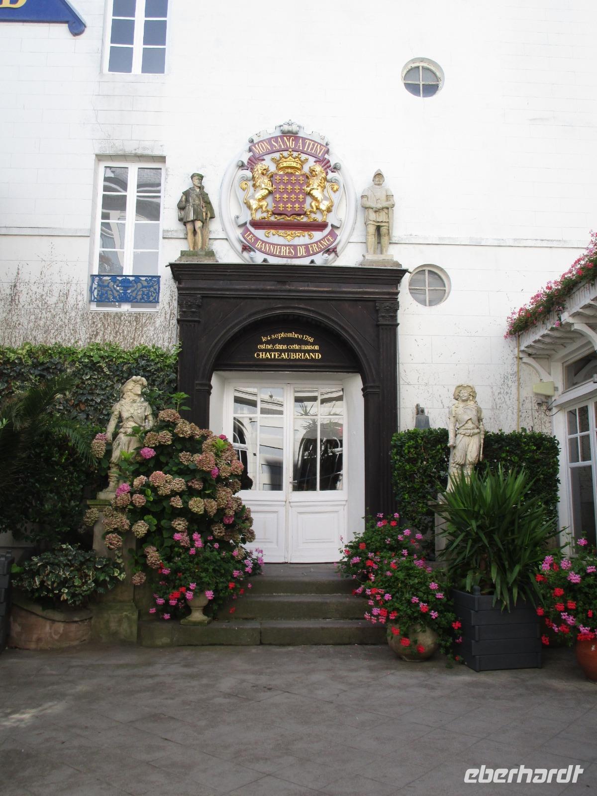 Zurück in St..-Malo unternehmen wir einen kleinen Stadtrundgang, sehen das trutzige Schloss zum Schutz gegen englische Piraten und gegen die gar nicht lammfromme Einwohnerschaft, sehen das Geburtshaus von Chateaubriand, die Bastionen, die vorgelagerten Inseln, die vielen Badegäste, das Denkmal des berühmtesten Korsaren Surcourf und die wiederhergestellte Kathedrale inmitten der eingemauerten, 1944 völlig zerstörten und auf alten Grundmauern wieder neu errichteten Altstadt.