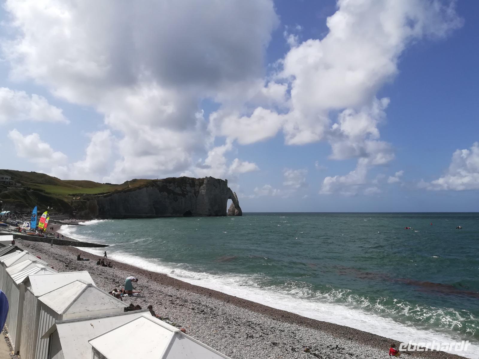 Aber der strahlende Sonnenschein lockt uns nun an die Küste, nach Etretat. Maupassant wuchs hier auf und Claude Monet liebte diesen Ort und malte hier einige seiner bedeutendsten Werke. Es ist ein kleiner Ort, der aber viele Gäste hat, eine kurze Strandpromenade zwischen 2 Kreidehochflächen, die senkrecht ins Meer abfallen und in die das Meer kleine Buchten und Felstore herausgearbeitet hat und dabei eine spitze Pyramide, den Avalfelsen stehengelassen hat. Der Journalist Alphonse Karr sagte 1833. „Müsste man einen Freund zum ersten Male das Meer zeigen, würde ich Etretat wählen."