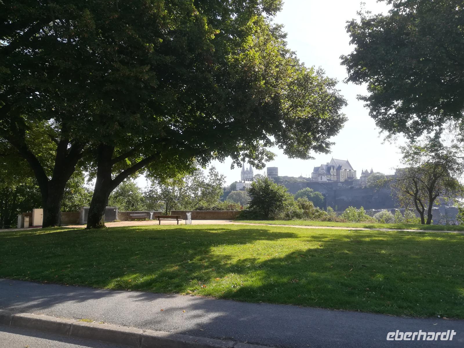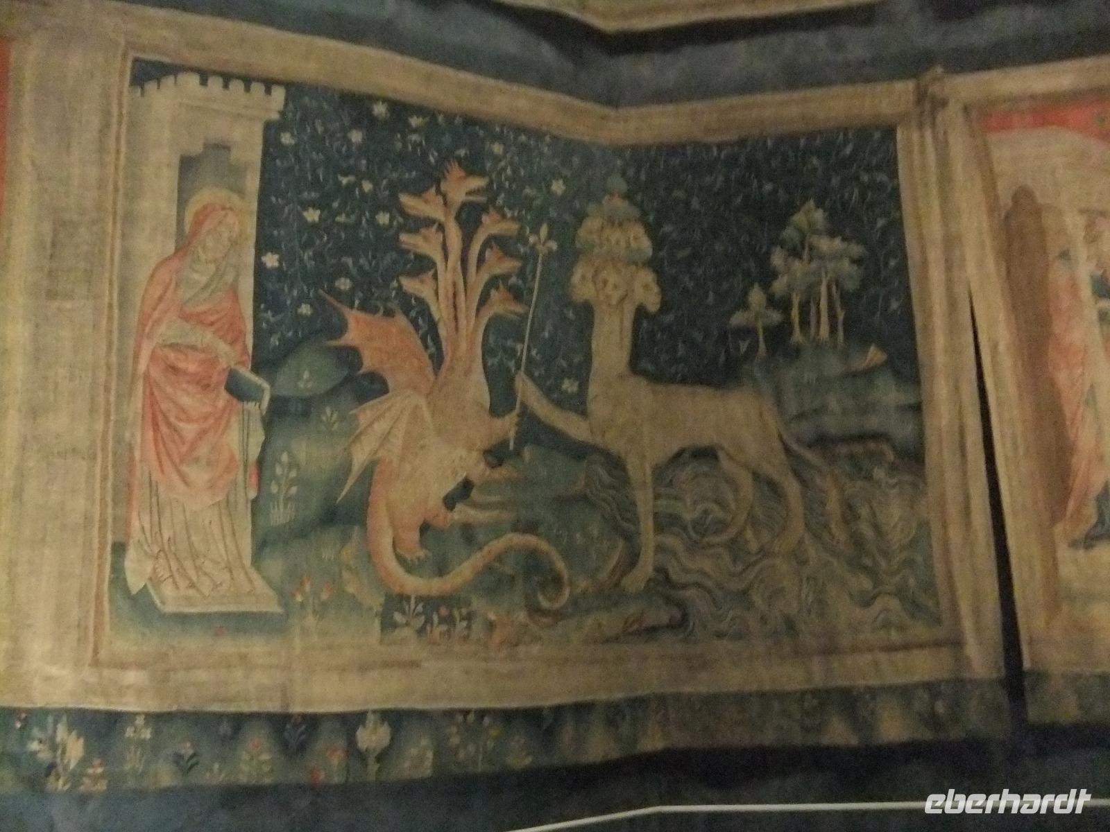 Nun beginnt schon die Rückreise. Aber erst einmal unterbrechen wir die Fahrt und kommen nach Angers. Die Stadt war Hauptstadt des Herzogtums Anjou, das für 300 Jahre auch den englischen Königsthron mit dem Haus Plantagenet belieferte. Kernstück der Altstadt ist das wuchtige Chateau mit seinen hellgrau-dunkelgrau gestreiften Mauern, den 17 wuchtige Türmen und einer wunderschönen Blumendekoration im Wehrgraben. Früher waren Mauern und Türme noch höher, 2 Etagen mussten geschleift werden. Diese Burg birgt einen Schatz: die Wandteppiche der Apokalypse aus dem 14.Jhdt. Von der Bilderserie von ursprünglich 170 m Länge sind 2 Drittel der Einzelstücke wiederaufgefunden worden. Die Offenbarung dieses Johannes von Patmos zeigt in eindringlicher Weise den Kampf zwischen Gut und Böse, der mit dem Sieg des Guten endet und zum himmlischen Jerusalem führt. Johannes verarbeitet - verklausuliert - geschichtliche Ereignisse wie das Vierkaiserjahr nach Neros