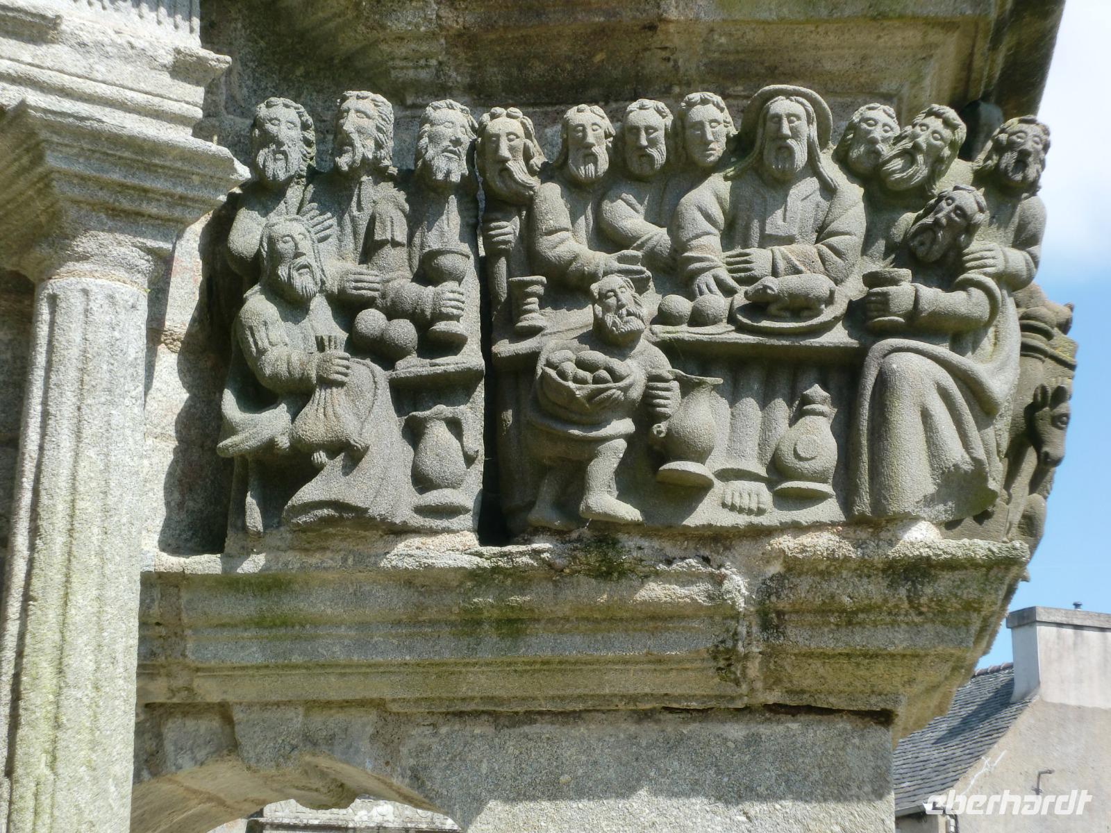 aufgenommen und angepasst. Die 7777 Heiligen der Bretonen sind nur zu einem geringen Teil im Kirchenkalender aufgenommen. Bewundernswert ist, wie diese Glaubensdinge bildlich im harten Granit verarbeitet wurden. Zierde des Pfarrbezirkes von Guilmillau ist der Kalvarienberg, mit seiner Kreuzigungsszene und die Illustration von Szenen aus dem Alten und Neuen Testament für die leseunkundige Bevölkerung. Köstlich ist die Darstellung biblischer Gestalten in Trachten des 16.Jhdt. Auch Legenden haben Eingang gefunden, wie die Verstoßung der putzsüchtigen, liebestollen und tanzwütigen Katel in die Hölle, eine deftige Warnung an das Volk.