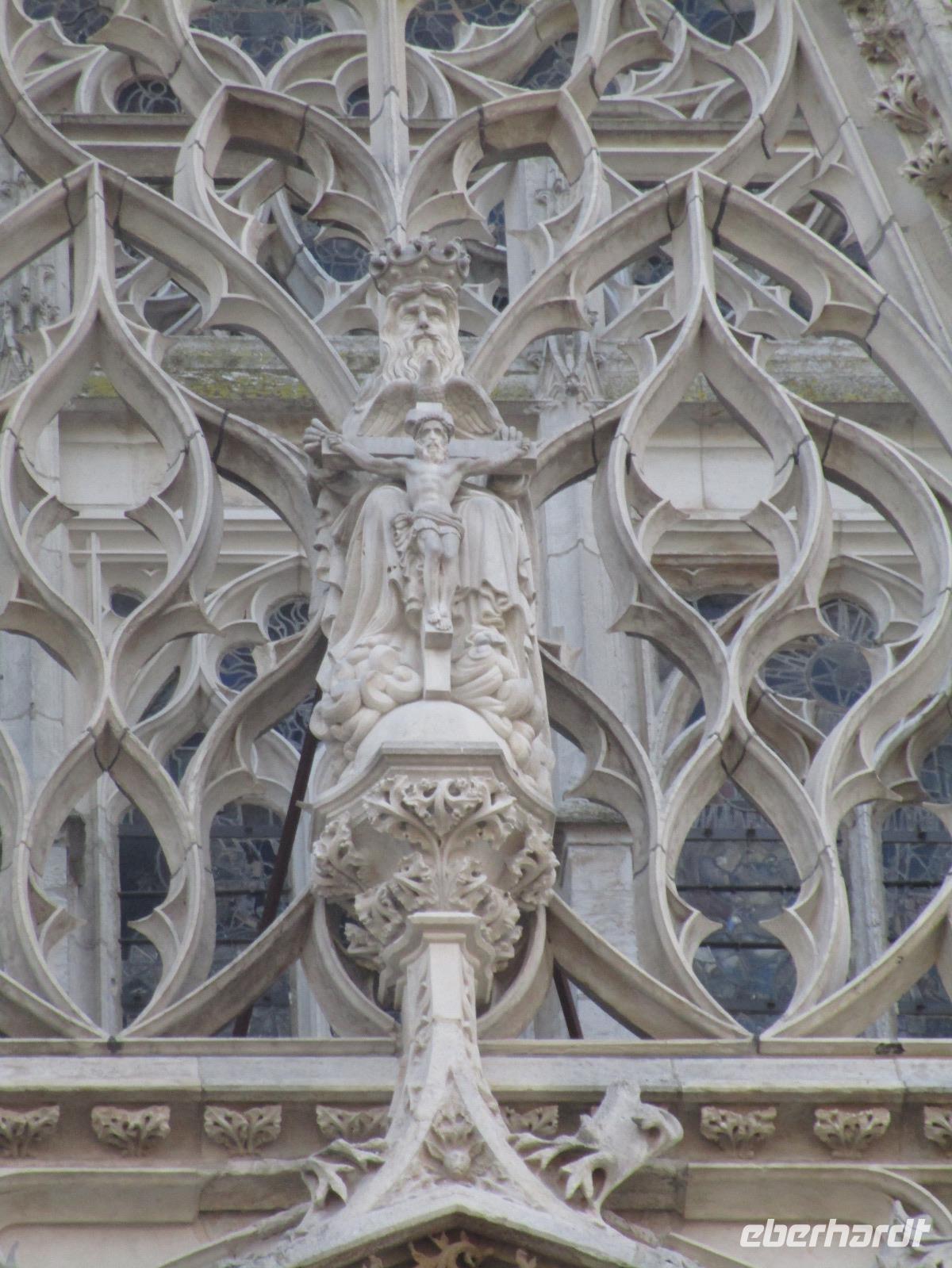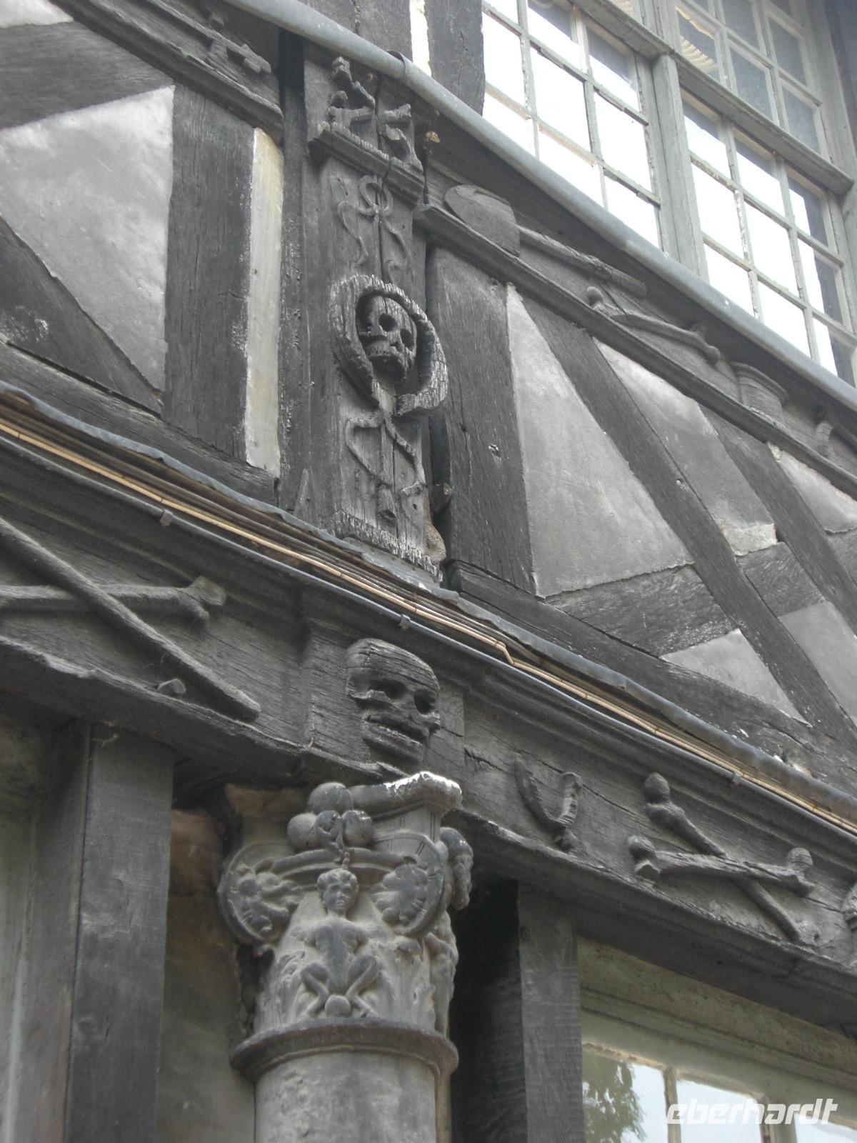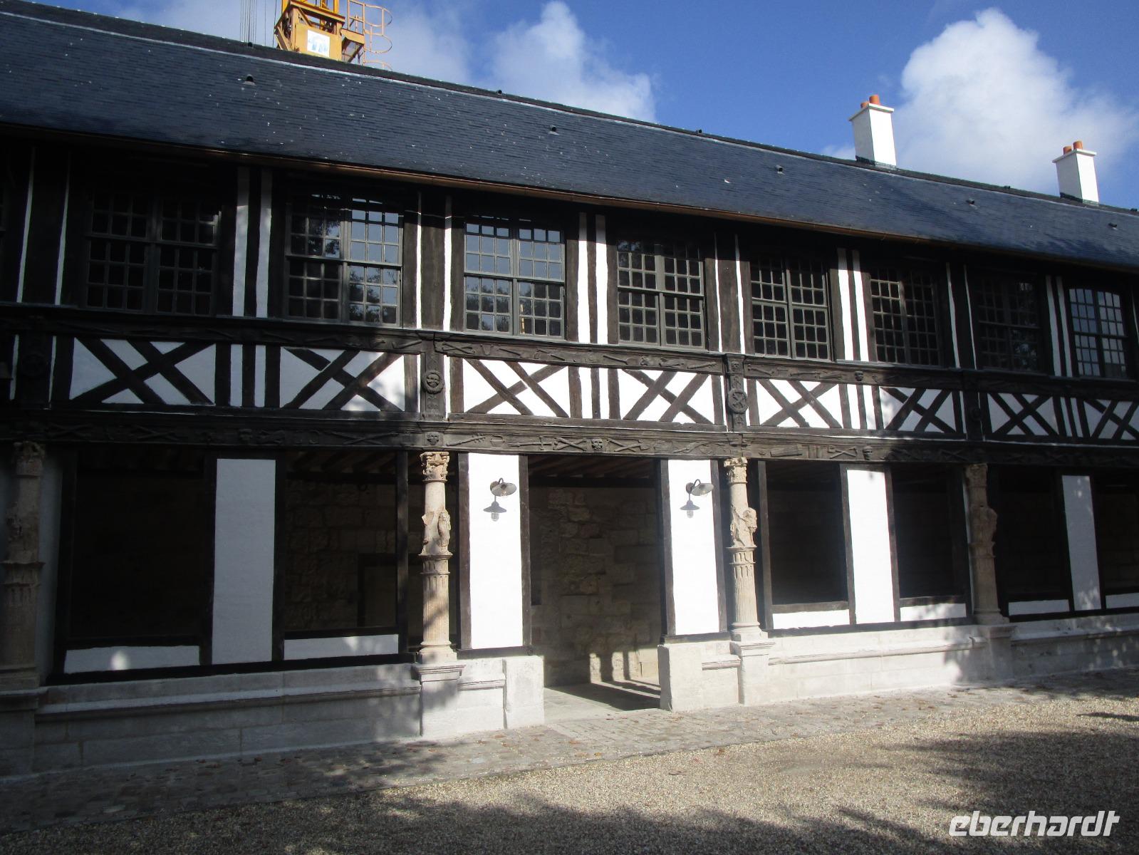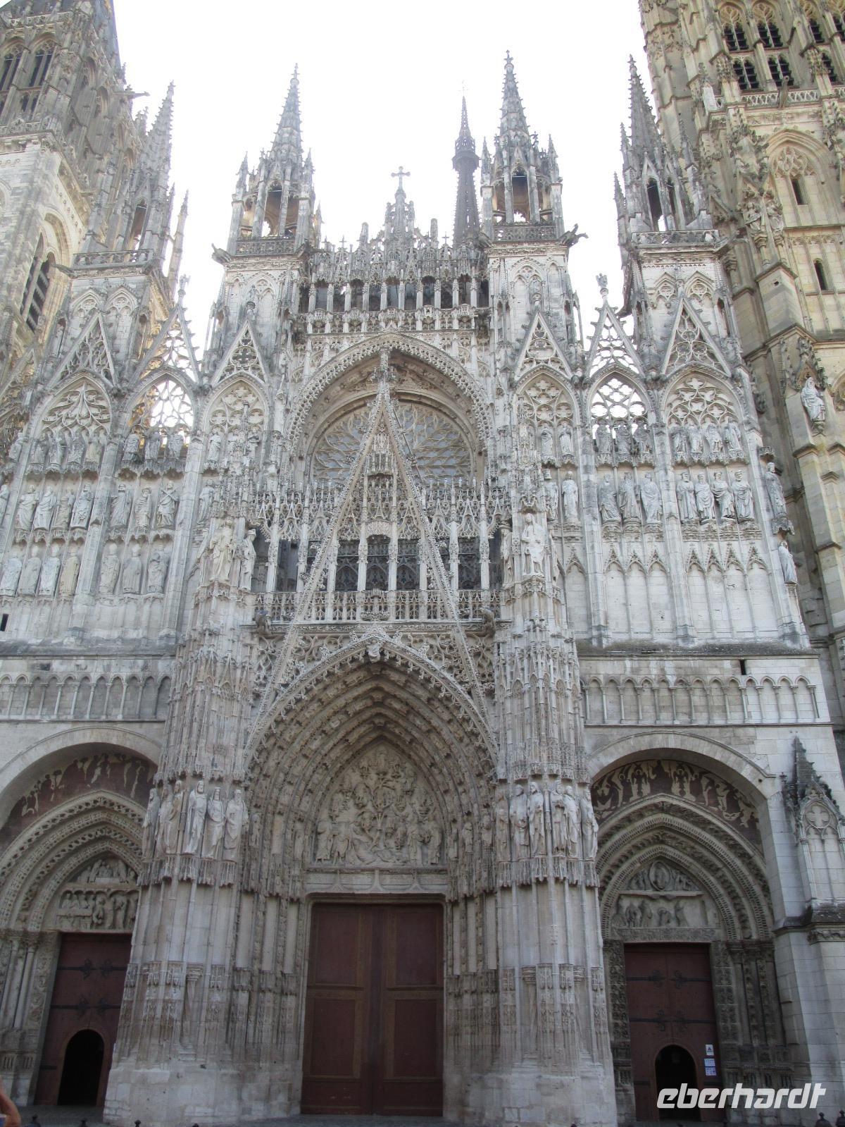 Wir besichtigen die Stadt in zwei kleinen Gruppen mit sehr sachkundigen örtlichen Reiseleitern. Rouen ist die Stadt der hundert Türme, meinte Victor Hugo. Und die Kathedrale hat den höchsten Frankreichs. Die Fassade ist reich gegliedert, ein Turm wurde mit den Geldern aus der Buttersteuer erbaut. Für die Normannen war der Verzicht auf Butter in der Fastenzeit undenkbar. Auch damals war man beim Einführen von Steuern sehr erfindungsreich. Das Kirchenschiff ist lichtdurchflutet, dazu tragen auch die Fenster des Laternenturmes bei. Im Chor haben 4 Herzöge der Normandie ihr Grabdenkmal, darunter der erste Herzog Rollo, mit dem die jahrzehntelangen Raubzüge der Normannen endeten und Richard Löwenherz. Sein Herz wird in der Kathedrale aufbewahrt. Über eine Seitenpforte gelangen wir in eine belebte mittelalterliche Straße. Und hierstehen sie, die ersten der etwa 700 Fachwerkhäuser- Es waren einmal viel mehr, die Uferzonen fielen der Bombardierung der Seinebrücken zum Opfer. Wir gehen an der Kirche St.-Maclou (der St.Malo!) vorbei, feinste Spätgotik, in Frankreich Flamboyant (Flammen)-Gotik genannt. Die Restaurierung des mittelalterlichen Pestfriedhofes Aitre Maclou. geht dem Ende entgegen. besuchen das Viertel am Bächlein Robec, Flaubert wuchs hier auf. Die Führungen enden an einem modernen Komplex aus den 70er Jahren: ein vielgestaltiges Dach breitet sich über die Kirche der Ste.-Jeanne-d'Arc und eine Markthalle aus und lässt Platz für die Stelle; an der der Scheiterhaufen für die Heilige Johanna errichtet wurde. Sie ist Frankreichs Nationalheldin und Heilige, deren Statuen in fast allen Kirchen zu finden sind.
