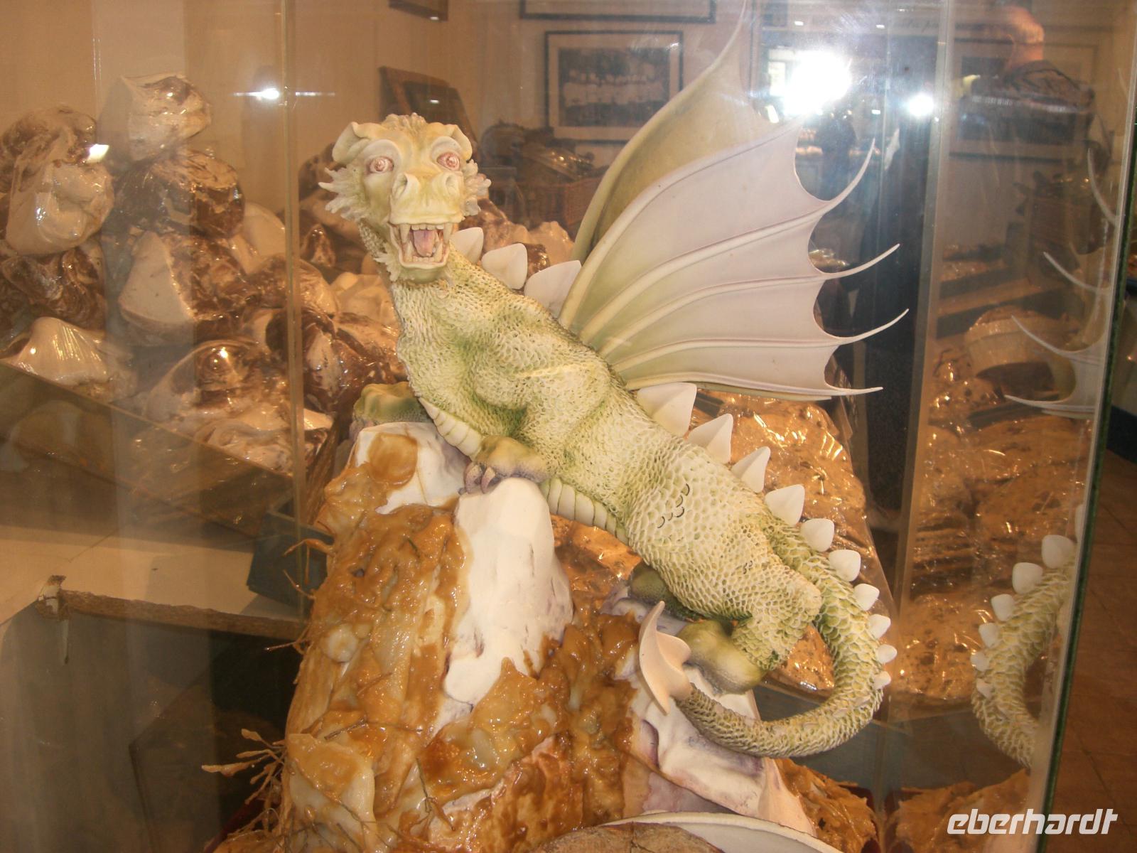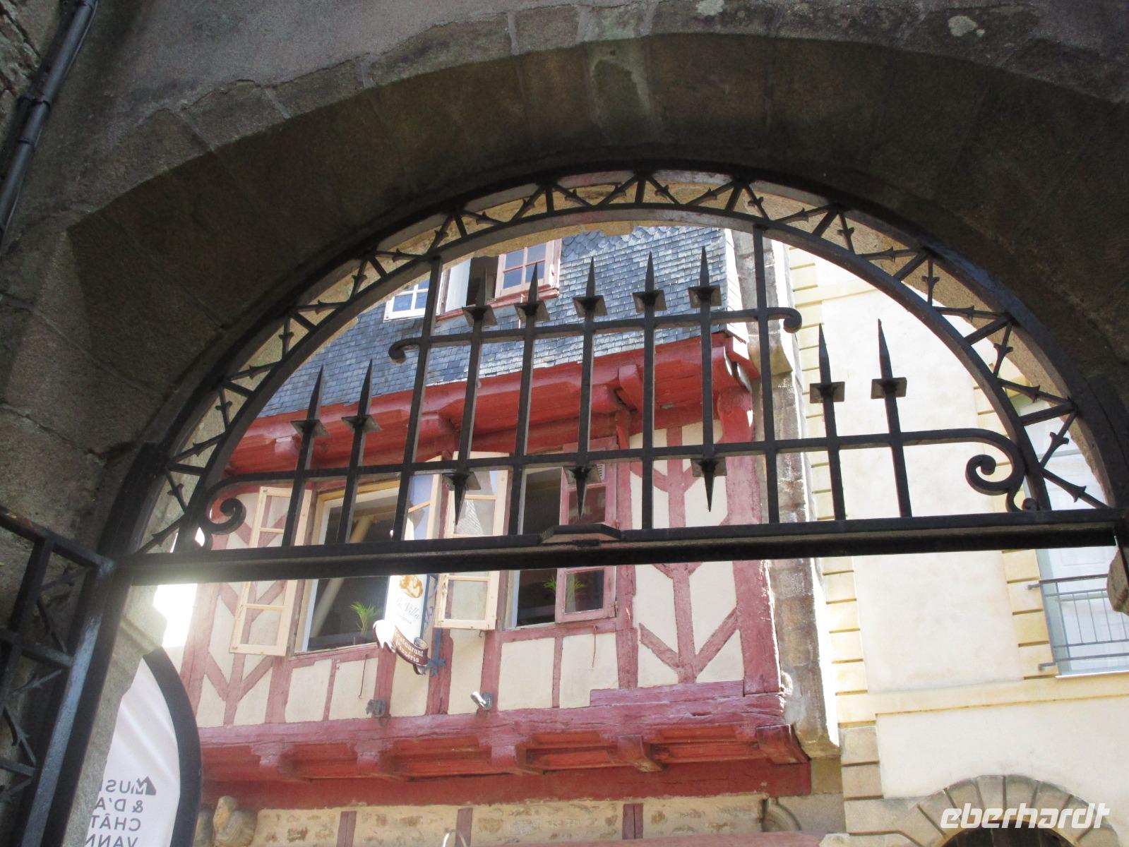 Bei der Einfahrt in die ehemalige Hauptstadt der Bretagne, Vannes, treffen wir auf eine große Menschenmenge am Hafenbecken. Eine Veranstaltung, das Fischerstechen begeistert die Einwohner. Wir werden von Isabell durch die Altstadt geführt, sehen die starken Befestigungen, aber auch die wunderbaren Blumenarrangements im breiten Wehrgaben zu Füßen des ehemaligen Herzogschlosses. Beeindruckend sind die Kathedrale St.-Pierre, die Fachwerkhäuser und die Halle Cohue, in der Händler und darüber das Gericht arbeiteten. Heute ringelt sich hier ein riesiger, schuppiger Lindwurm, seinen Kopf hat er schon verloren - moderne Kunst in temporärer Ausstellung.