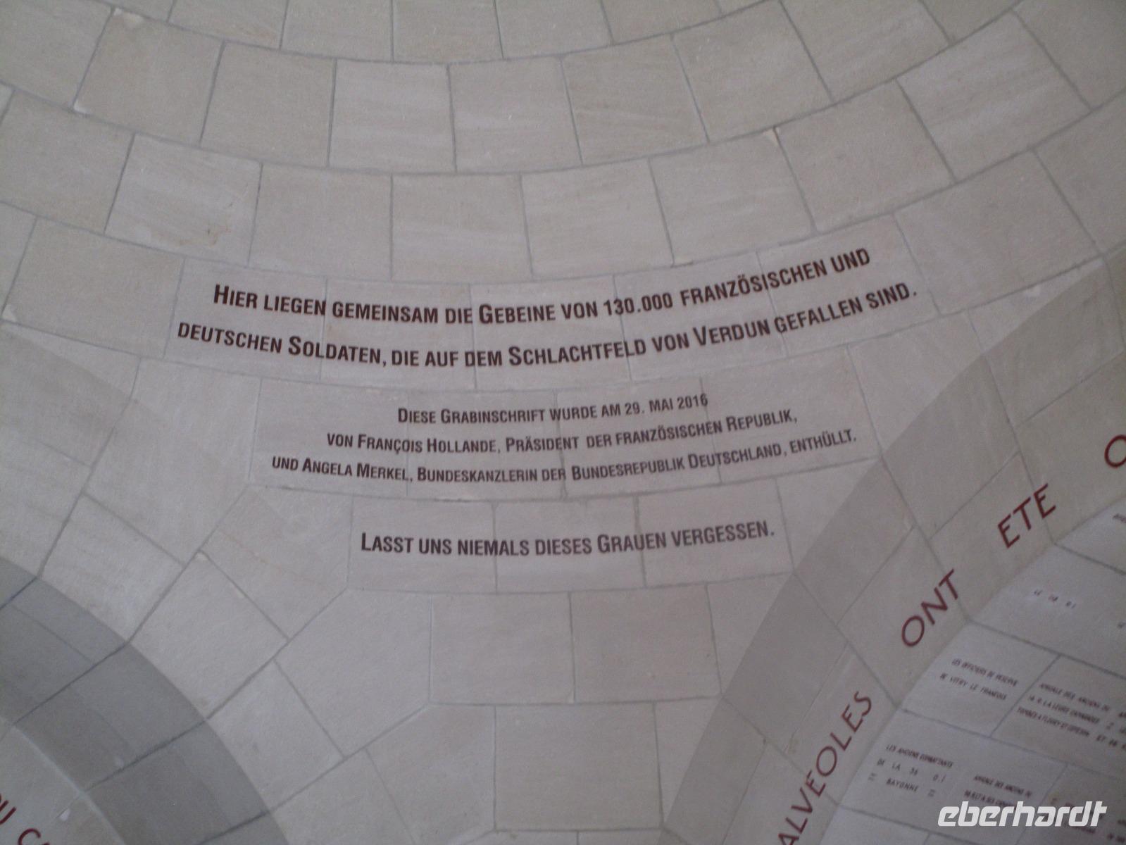 Ein Tag der Besinnung und des Gedenkens. Haben schon die Auseinandersetzungen zwischen Deutschland und Frankreich 1870 bei Metz erschreckende Ausmaße angenommen, so war Verdun die Hölle, durch die junge Soldaten beider Nationen gehen mussten. Arnold Zweig oder Ludwig Renn haben das eindringlich beschrieben. Wir haben einen sehr engagierten und sachkundigen Führer, mit dem wir auf die ehemaligen Schlachtfelder fahren und die Festung Douaumont besichtigen. Es sollte nie vergessen werden, was Krieg bedeutet, sonst ist der nächste nicht mehr weit. Aber es ist auch die gut zu wissen, dass es in 75 Jahren gelungen ist, die blutigen Auseinandersetzungen zwischen beiden Ländern zu beenden durch Verständigung auf allen Ebenen, von Jugendgruppen, Kirchgemeinden, Städtepartnern, Besuchern bis hin zu Spitzenpolitikern, deren Zusammentreffen in Verdun im Beinhaus und vor dem Friedhof gewürdigt werden. Und nie vergessen werden sollte die Mahnung des Gedichtes von Erich Kästners von 1932, dessen letzten beiden Zeilen lauten: Täglich sagt der Chor der Toten: "Habt ein besseres Gedächtnis!"