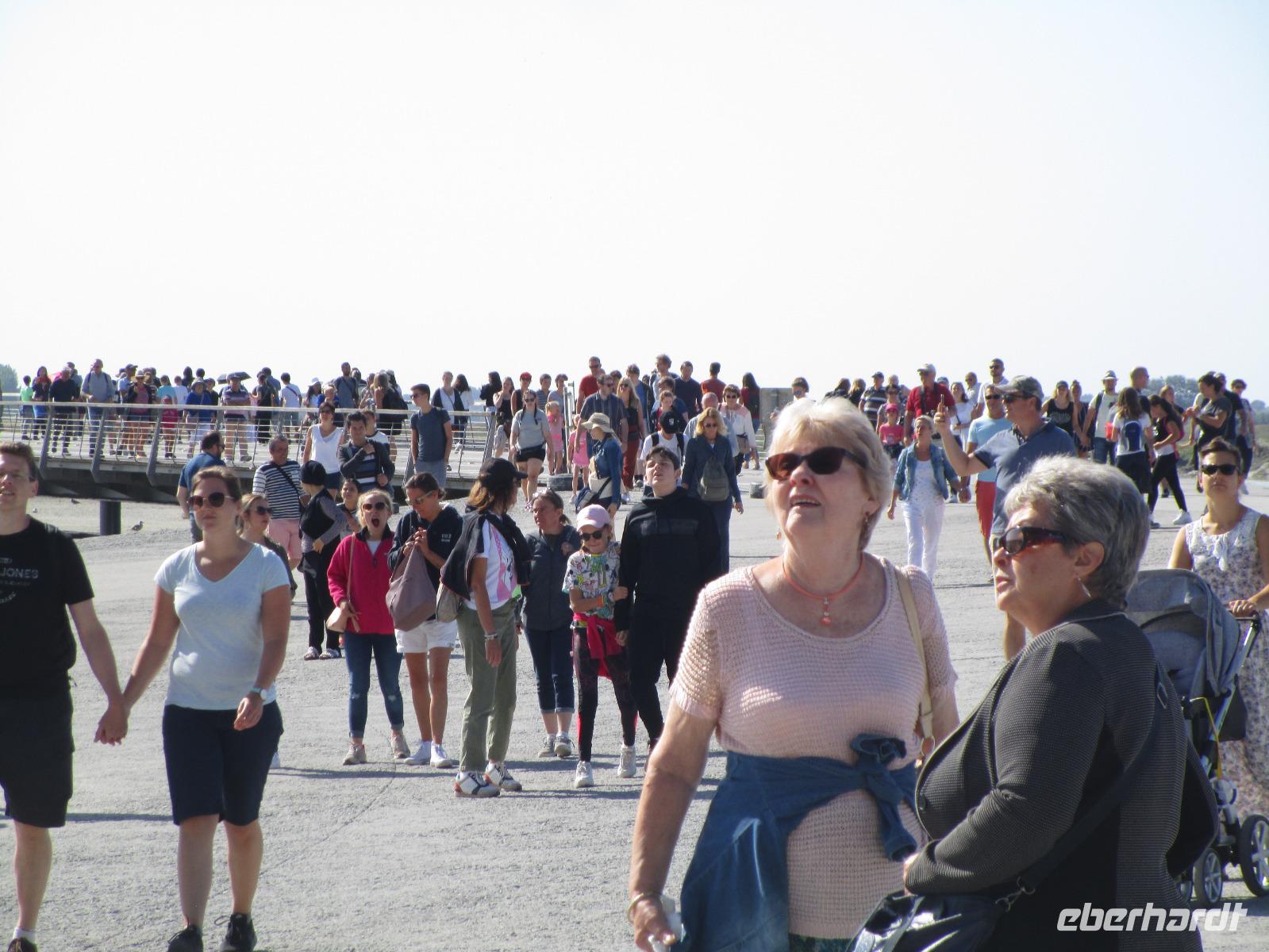 Seit 1300 Jahren sind Menschen zu diesem Mont St.-Michel gepilgert, früher als Wallfahrer, heute meist als Touristen. Immerhin sind es jetzt jährlich fast 3 Millionen. Mönchsgemeinschaften lösten sich auf diesem Berg einander ab, sie erbauten ein Kloster, das den Fels der kleinen Insel krönt. Ein Gürtel von Befestigungen diente zum Schutz des Klosters und in seinen Mauern entwickelte sich ein Dörfchen. Heute hat es 30 Einwohner, aber eine eigene Postleitzahl. Ein Shuttlebus bringt uns auf die neu errichtete Stelzenbrücke und da steht das Wunder des Abendlandes „unglaublich fremd und schön, wie ein Traumpalast." wie es Maupassant empfand. Leider haben die Menschen durch Eingriffe in die Bucht von St.-Michel aus der Felseninsel eine Burg im Schwemmsand gemacht. Nur bei Flut rollt die Flut heran und umspült den Felsen. Mit hohen Kosten wurden Rückbauten vorgenommen und Einrichtungen geschaffen, um in einigen Jahrzehnten wieder
