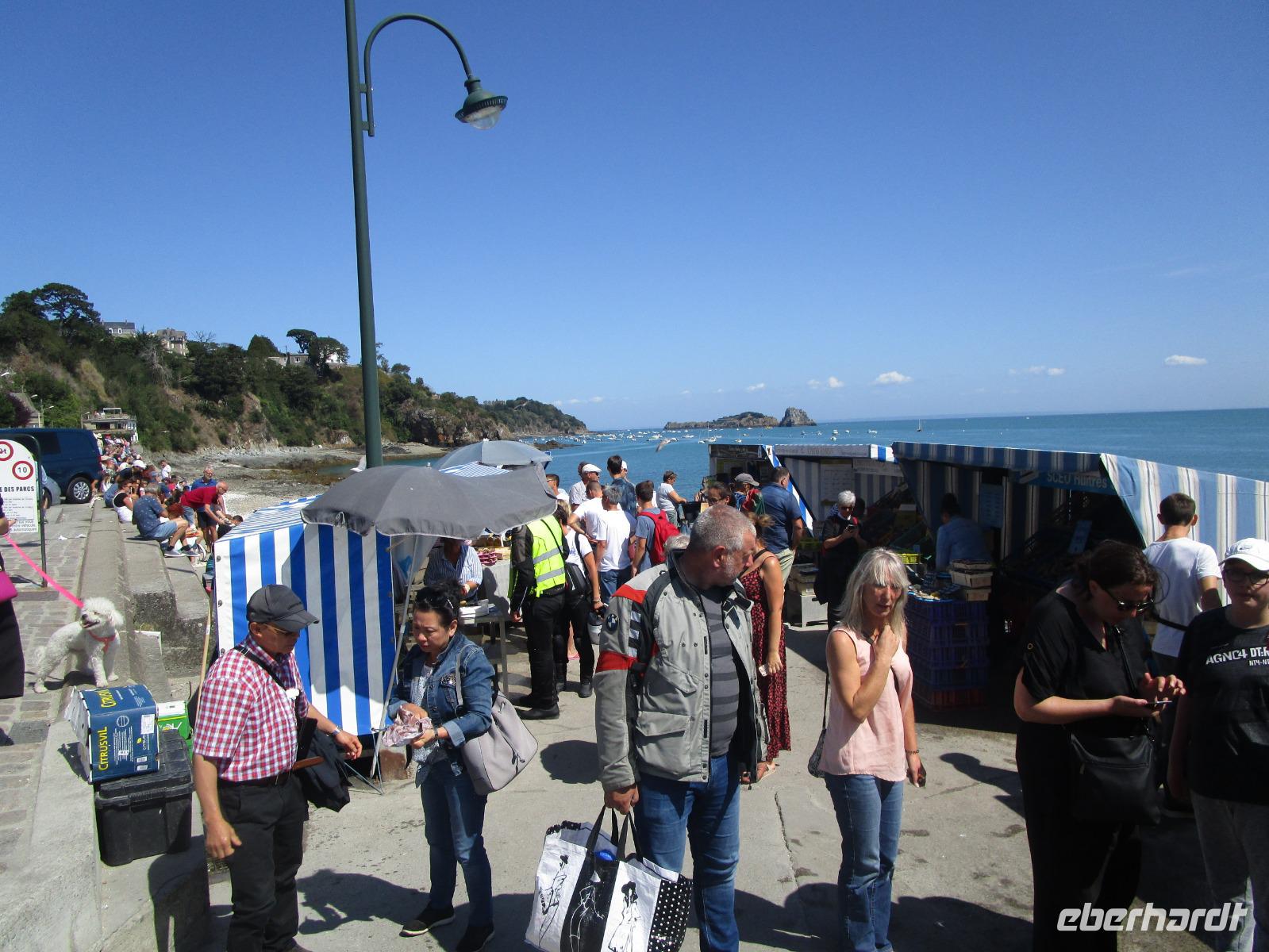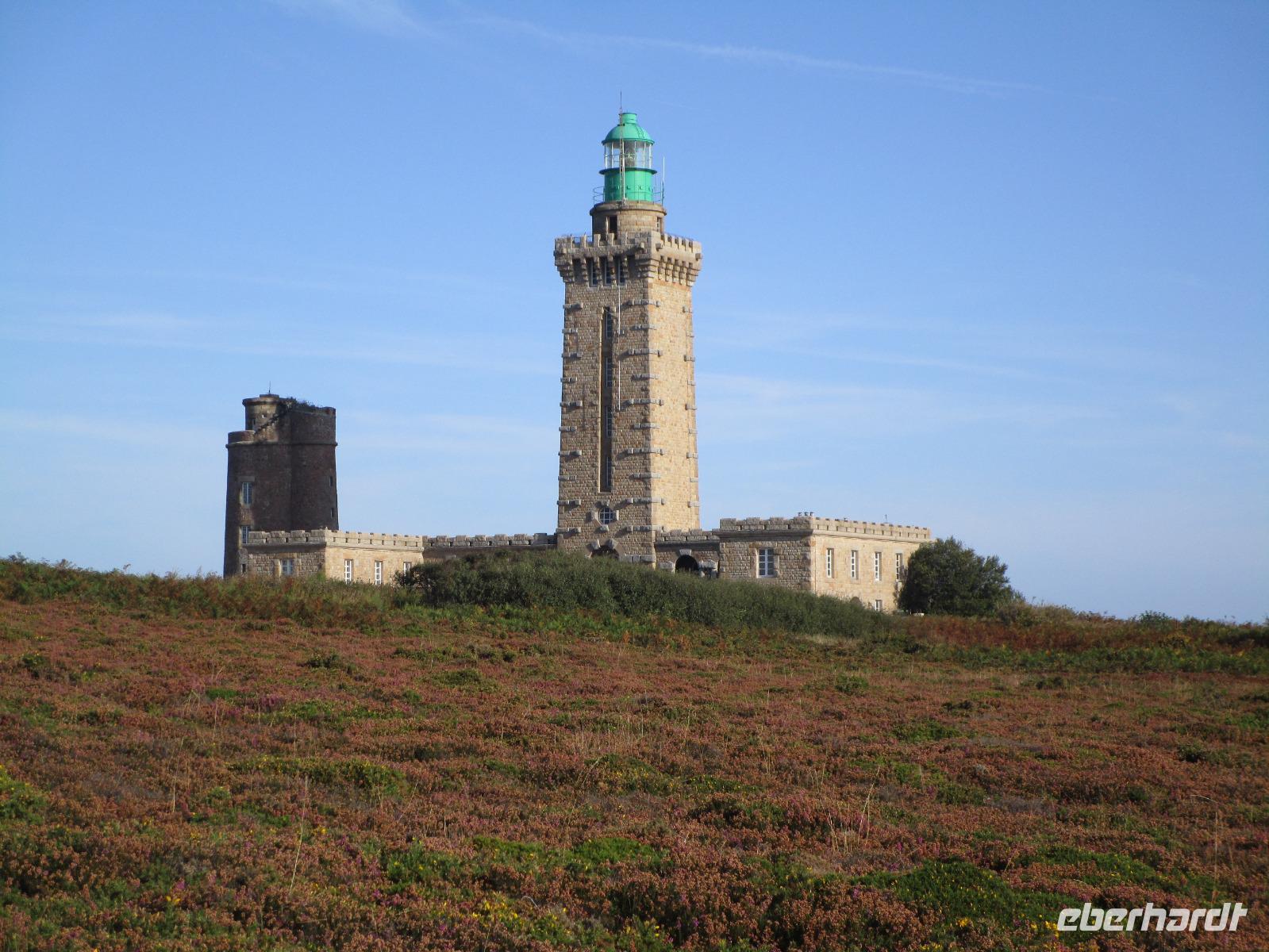 Wir beginnen mit einer Wanderung am Cap Frehel, einer Felszunge in rot, grau und schwarz, die in das blaue Meer hineinragt. Ein großer Leuchtturm, nun der dritte gehört zu den 5 leistungsstärksten Frankreich. Er steht in einer 400 ha großen Heidelandschaft, die zum Wandern einlädt. Rechts ist das Fort de la Latte aus dem 14.Jhdt. zu sehen, einst wichtiges Glied der Küstenverteidigung, heute Touristenziel und Filmkulisse.
