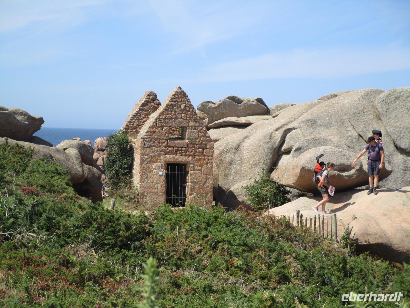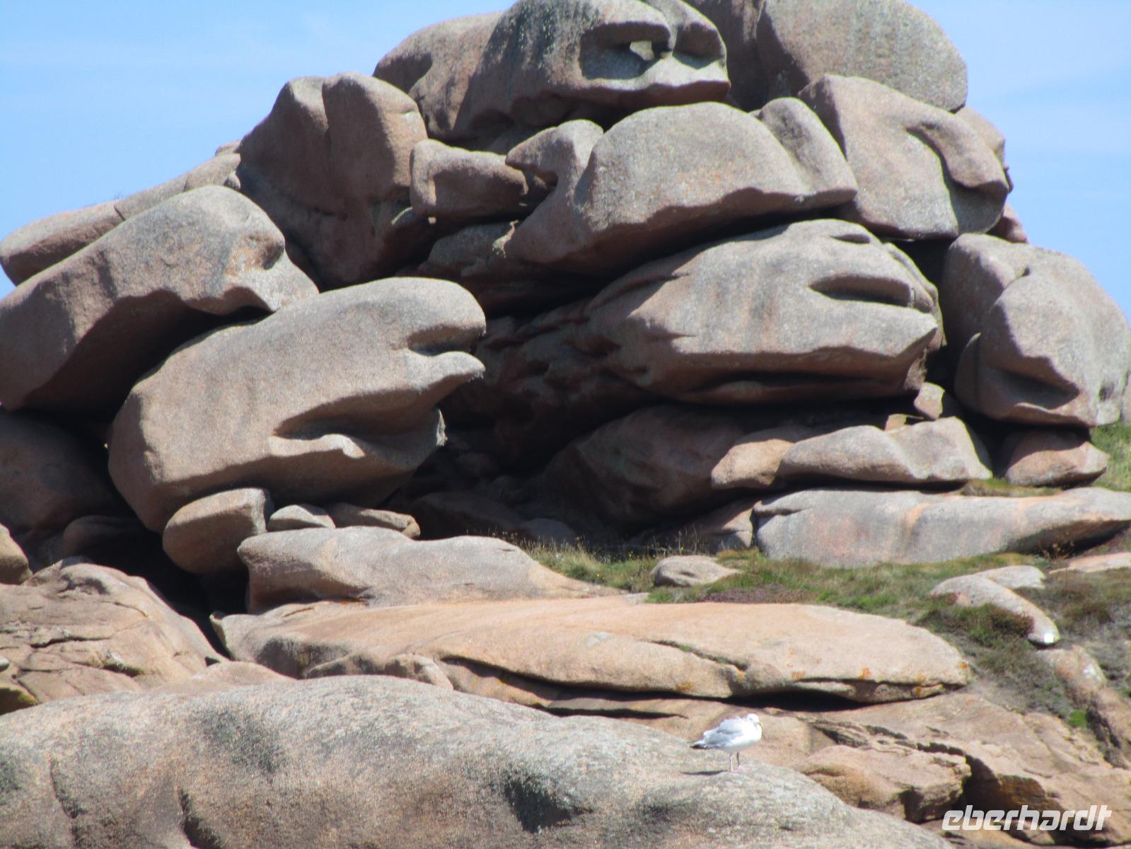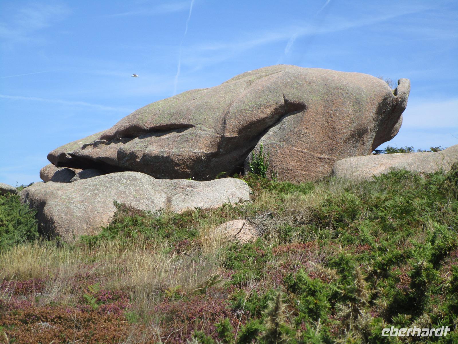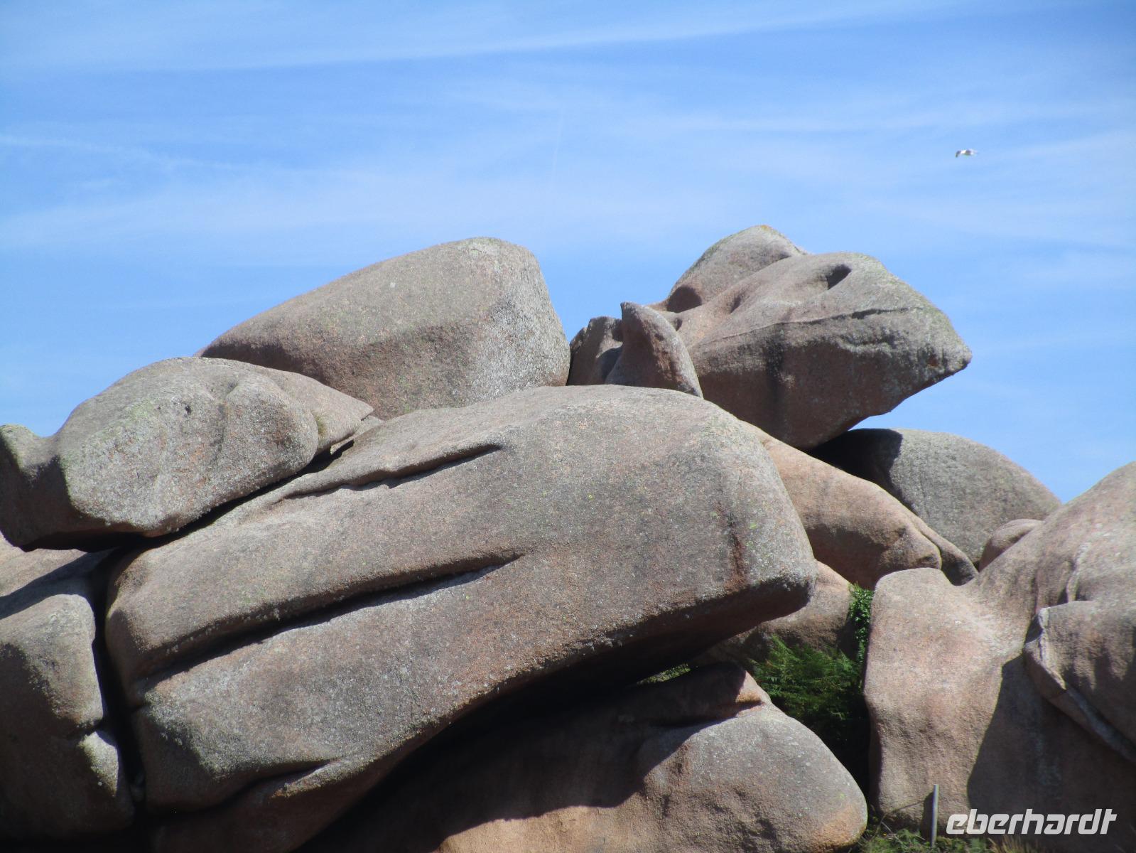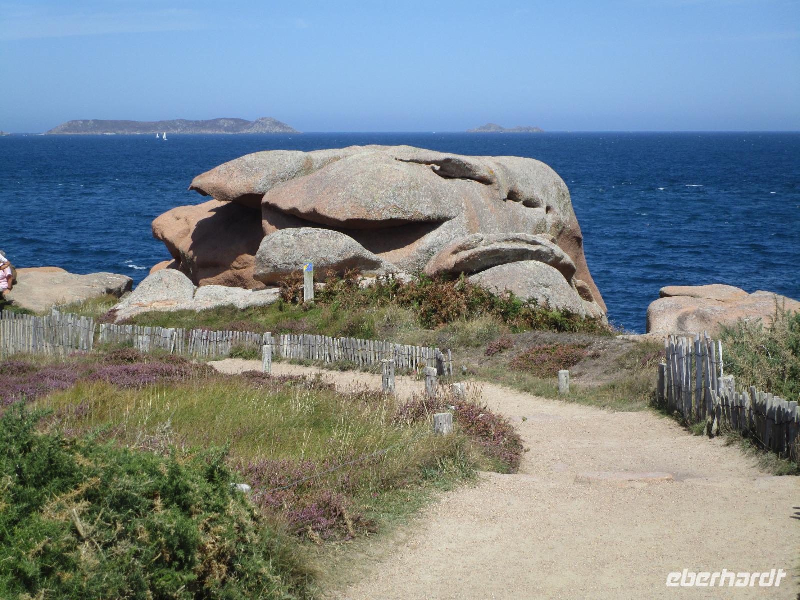 Welche eindrucksvolle Landschaft ist bei Ploumenach entstanden, aus 300 Millionen Jahren alten Granit, der freigelegt wurde und Wind, Regen und Wellen ausgesetzt war. Wie von Riesen aufgetürmte Haufen aus gewaltigen Blöcken, die oft ein wunderliches Aussehen haben, die die Phantasie anregen. Eine beeindruckende Komposition aus dem Blau des Meeres und des Himmels, dem rosa Granit und dem Grün der Bäume im Hintergrund. Den schönen Wanderweg verdanken wir Napoleon I, der hier einen Patrouillenweg für die Zöllner anlegen ließ, die das Handelsembargo gegen England (so etwas gab es auch damals schon) durchsetzen sollten.