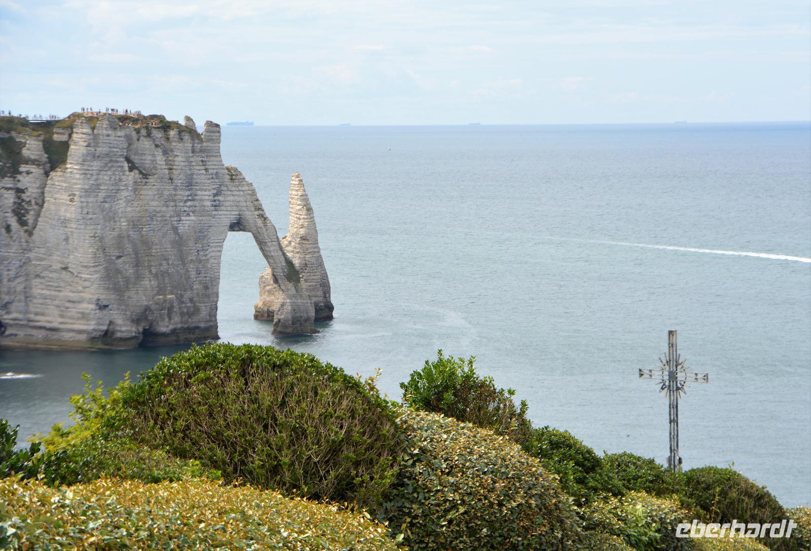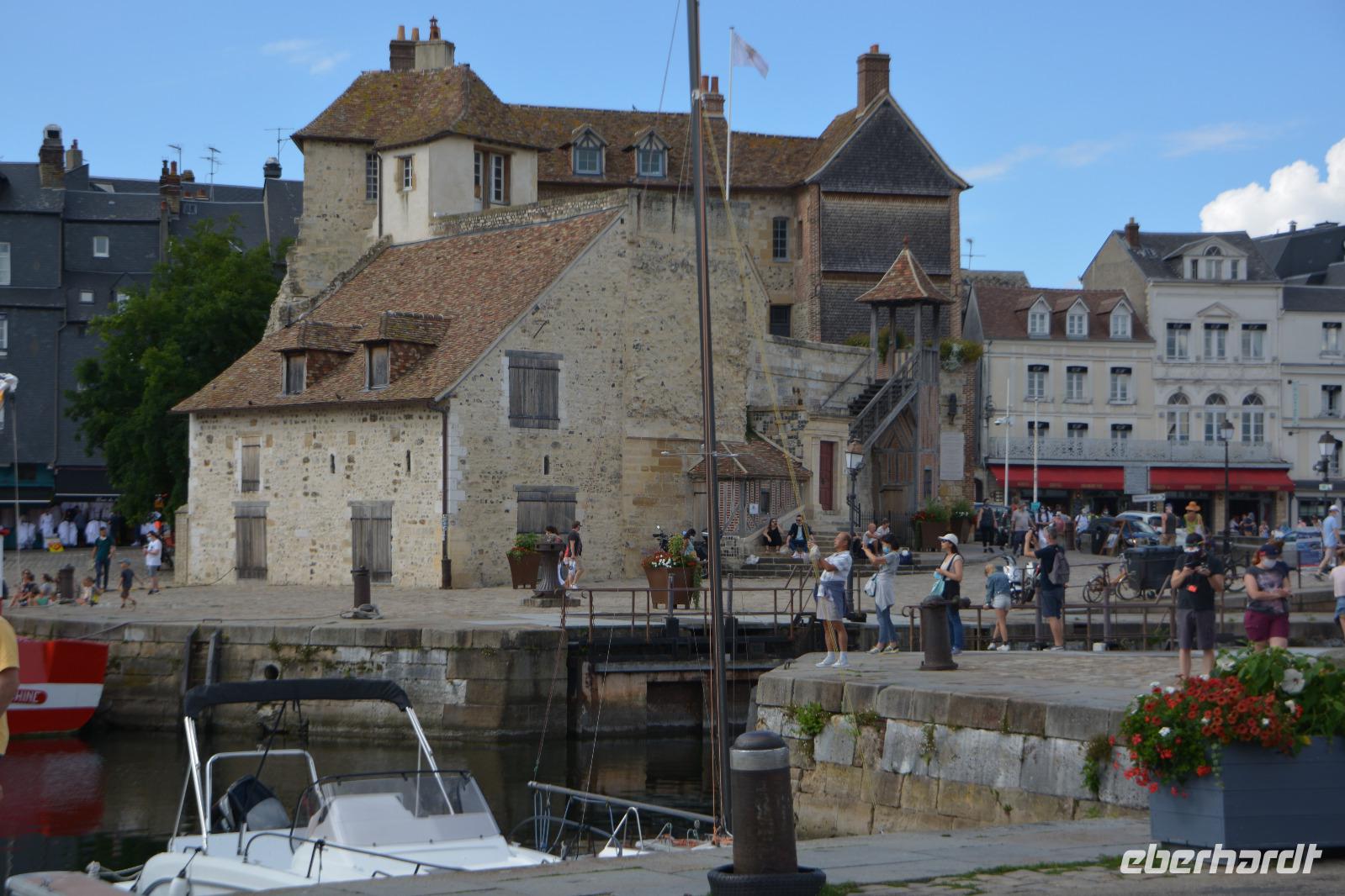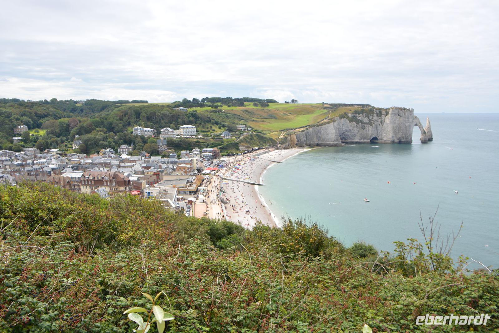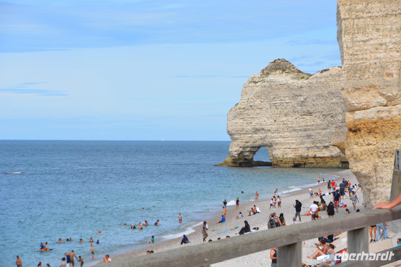 Nach einem ausgiebigen Frühstück fahren wir in die Innenstadt von Rouen, die von Viktor Hugo auch als die "Stadt der 100 Kirchtürme" bezeichnet wurde. Dort treffen wir an der Kathedrale vor dem Fremdenverkehrsamt, ein schöner Renaissance-Bau, unsere lokale Stadtführerin, die uns pünktklich dort empfängt. Hier vor den Häusern vor der Kathedrale saß einst Monet und malte seine berühmten Kathedralenbilder. Vor der Kathedrale Notre-Dame erfahren wir etwas von der Baugeschichte dieses Gebäudes, welche man an der Baufront ablesen kann: Romanik, Gotik, Renaissance und schließlich die Vollendung des Vierungsturms erst im 19.Jahrhundert.Wir laufen weiter zur Kirche St.Maclou die von alten Fachwerkhäusern umgeben ist. Unterschiedliche Bautechniken werden uns hier erläutert. Den Höhepunkt bildet ein Besuch des Beinhauses "Aitre St.Maclou" aus dem 14.Jahrhundert. Hier war der Friedhof der Pestkranken im 14.Jahrhundert. Der Innenhof wird von Galerien gesäumt die mit Holzschnitzerein verziert sind. Heute finden hier Kunstgalerien eine Bleibe. Weiter spazieren wir zurück durch die schönen Fachwerkgassen vorbei am Erzbischöflichen Palais und betrachten die Kathedrale Notre Dame von innen. Jahrhunderte blicken auf uns herab. Leider ist der Steinsarg mit dem Herz von Richard Löwenherz im Moment nicht zu sehen. Der Weg führt uns nun entlang der "Rue du Gros Horloge", wie der Name schon sagt, genau zum Großen Uhrturm mit einer Uhr aus dem 14.Jahrhundert. Durch die Nebenstraßen können wir einen Blick auf den Justizpalast werfen, welcher das größte nichtsakrale gotische Gebäude Europas ist. Unter seinem Hof wurde das älteste jüdische Bauwerk Frankreichs (um 1100 n.Chr.) entdeckt. Es soll sich um die älteste jüdische Universität in Europa handeln. Nun aber wenden wir uns zum Place du Vieux Marché auf dem ein interessanter Kirchenbau dem wohl historisch wichtigsten Ereignis der Stadt gewidmet ist. Hier auf diesem Platz wurde am 30. Mai 1431 Jeanne d'Arc verbrannt. Sie kämpfte für ein von den Engländern befreites Frankreich. Schnell ist die Zeit vergangen und bald schon wartet unser Bus auf uns. Noch ein kleiner Spaziergang und etwas zu Essen gekauft und dann ist es auch schon so weit. Wir verabschieden uns von unserer Stadtführerin und fahren weiter in Richtung Etretat, dem Badeort am Ärmelkanal. Künstler und Literaten entdeckten schon Ende des 19.Jahrhunderts dieses nette Örtchen, von Klippen umrahmt. Entsprechend ist der Andrang, denn in diesem Jahr machen die Franzosen verstärkt Ferien im eigenen Land. Also Mundschutz an und wir gehen los. Da die Interessen variieren, geht jeder seinen eigenen Weg, denn verlaufen kann man sich in Etretat nicht. 2 Klippenwege führen zu den Aussichtspunkten 75 m über dem Meer: die "Porte d'Aval" und auf der anderen Seite die "Porte Amont". Die Klippen bestehen aus Feuerstein und werden zu rundlichen Kieseln geschliffen, die den Strand dominieren. Nicht umsonst heißt die Küste "Alabasterküste". Trotz der Kiesel ist der Strand an diesem heißen Tag voll mit Badegästen. Im Ort gibt es einen Botanischen Garten und natürlich kann man auch zu einer längeren Wanderung starten, bei der Schwindelfreiheit von Vorteil ist. Wir treffen uns nach diesem Ausflug wieder am Bus und fahren weiter. Vorbei an Le Havre, dort wo die Seine in den Atlantik mündet und über die "Pont-de-Normanie", der Schrägseilbrücke mit der größten Spannweite Europas erreichen wir die Stadt Honfleur an der "Cote Fleurie". Der Maler Eugène Boudin wurde hier geboren und hielt die aufregenden Küstenlandschaften eindrücklich im Bild fest. Andere wie Pissarro, Cezanne und Renoir kamen und so wurde Honfleur zur Wiege des Impressionismus.Wir spazieren um den alten Hafen mit seinen Yachten zur Kirche Sainte Catherine, deren Dach komplett aus Holz von Schiffszimmerleuten in der Mitte des 15. Jahrhunderts erbaut wurde. Beeindruckend ist auch der einzeln stehende Glockenturm. Nun aber geht es zurück zum Bus und in unser Hotel am Rande der Stadt Caen. Die Geschichte dieser Stadt, die im 2.Weltkrieg besonders zur leiden hatte stimmt uns auf den nächsten Tag ein. Erst einmal lassen wir uns aber unser verdientes Abendessen schmecken.