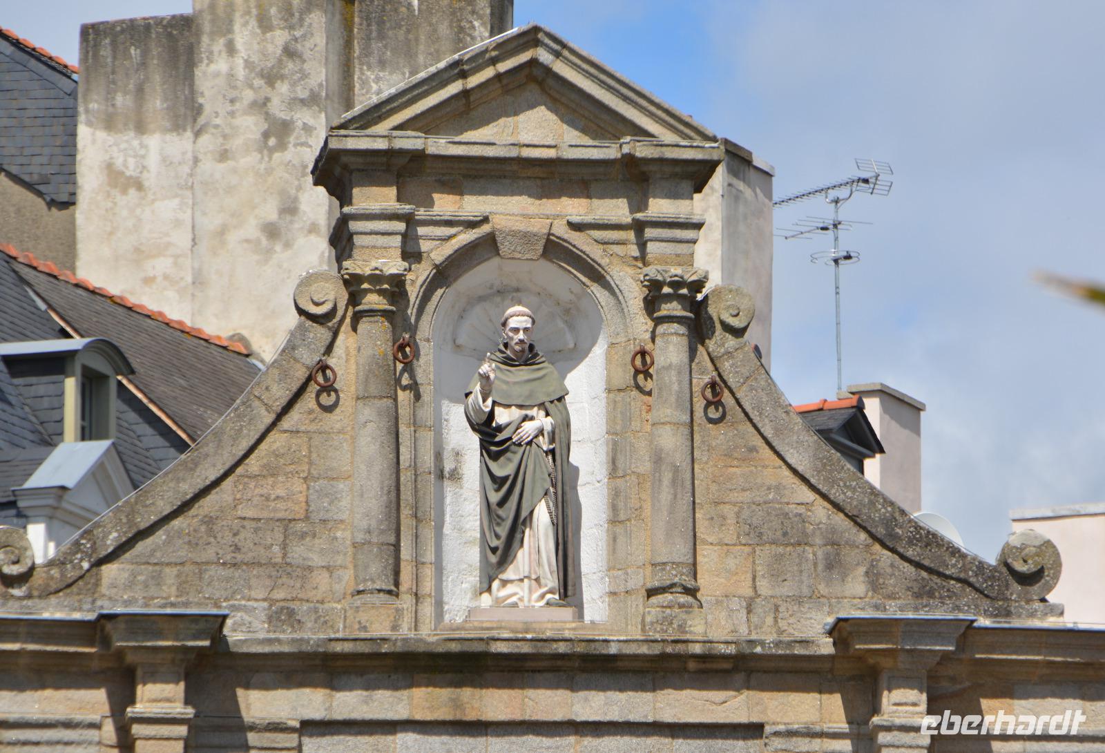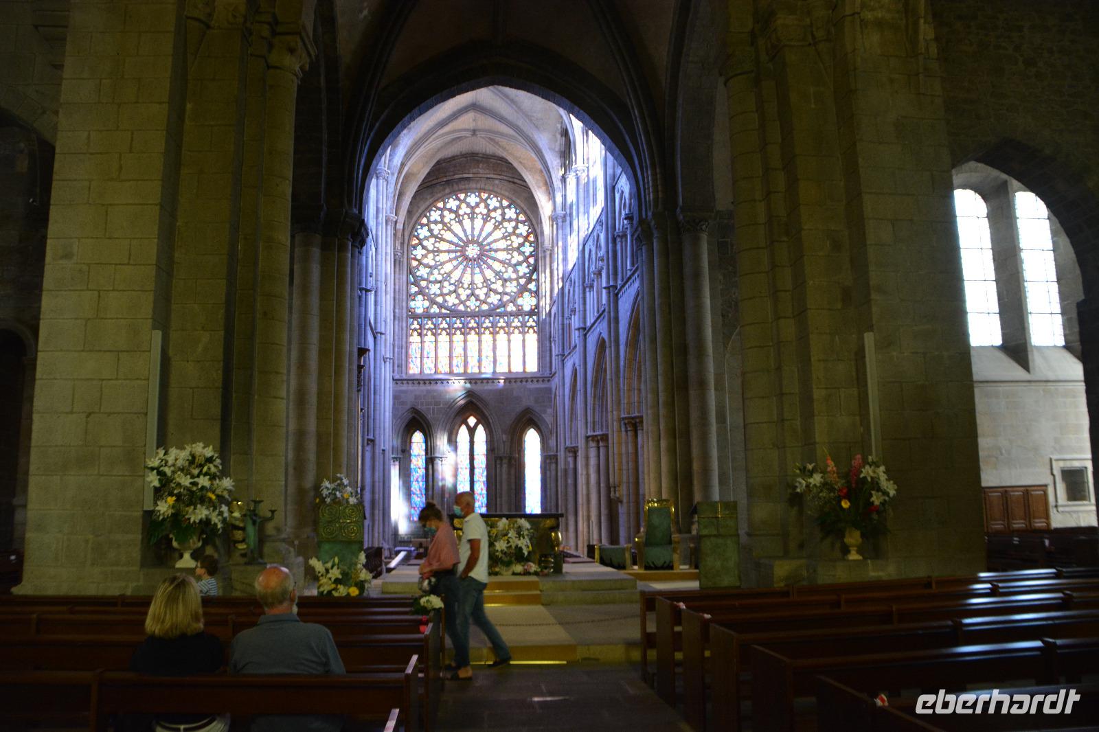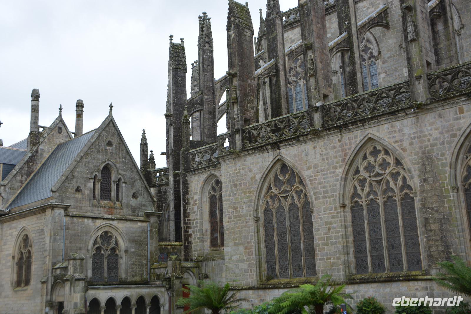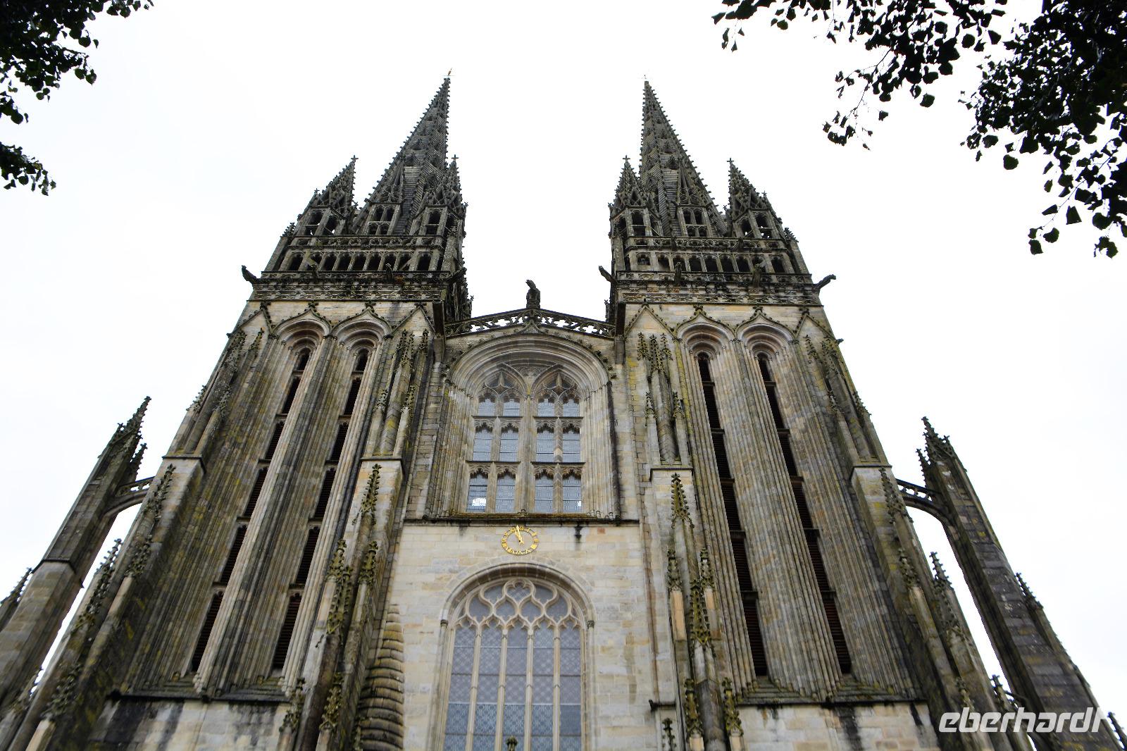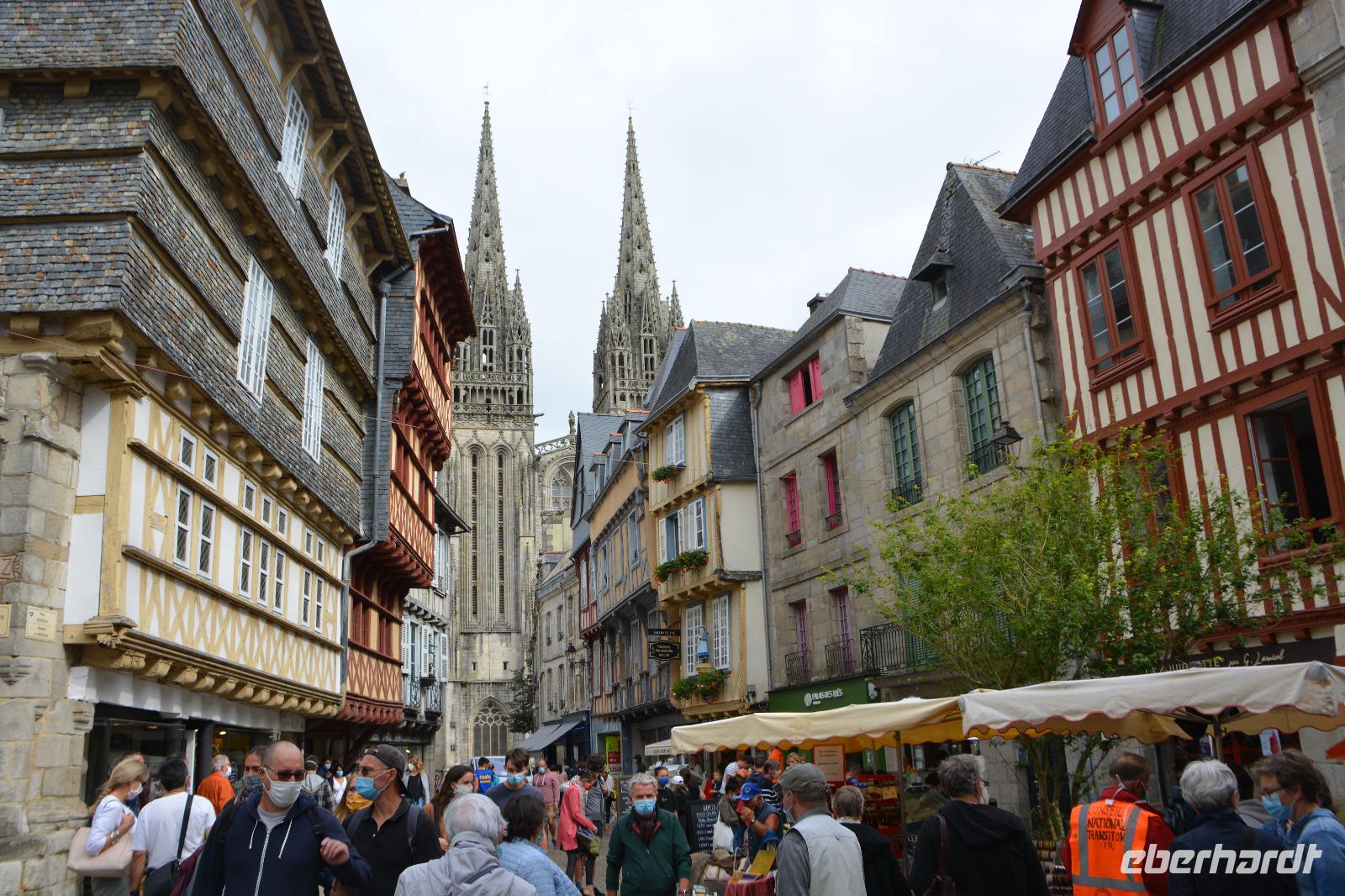 Fast alle haben sich zur heutigen Tour in den äußersten Westen der Bretagne dem "Pointe du Raz" angemeldet. Einige der Reiseteilnehmer möchten gerne einen ruhigeren Tag in Quimper verbringen. Das Wetter ist heute etwas durchwachsen und wir hoffen auf die sonnigen Abschnitte. So fahren wir denn positiv gestimmt nach Locronan, ebenfalls ein Ort welcher durch die Leinenindustrie zu Reichtum gelangte. Ein irischer Mönch, der heilige Ronan fand hier seinen Ort der Bestimmung und ihm ist auch die Kirche gewidmet. Während sich die Gruppe den Ort anschaut, fährt die "Mannschaft" zum Picknick einkaufen in den nahe gelegenen großen Supermarkt, da dieser erst um 09.00 Uhr öffnet. Hier gibt es alles was wir für das Picknick brauchen. Wir merken beim Einkaufen: man lässt sich Zeit in der Bretagne.Anschließend geht es weiter zum "Pointe du Raz". Wir fahren über Locronan, einst ein großer Sardinenhafen in dem zu Zeiten der Römer ihre bekannte Fischpaste "Garum" produziert wurde und weiter durch kleine bretonische Dörfer in Richtung der westlichsten Spitze. Meerumtoste Felsen erheben sich bis zu 70 Meter in die Höhe. In der Ferne sieht man einen Leuchtturm, der den Fischern und Seeleuten auch heute noch den Weg weist. Viele Legenden ranken sich um den Ort. Hier soll das sagenhafte Lys gelegen haben, welches vielfach in den bretonischen Legenden auftaucht. Das Denkmal zeigt Maria als Patronin der Schiffbrüchigen. Einige von uns machen auch hier eine kleine Küstenwanderung. Danach gibt es ein zünftiges bretonisches Picknick mit frischem Baguette, Pastete und bretonischem Käse, unter anderem eine Sorte mit Algen, der allen gut schmeckt. Gut gelaunt und in heiterer Stimmung fahren wir wieder in Richtung Quimper, Nach einem kurzen Stopp am Hotel laufen wir gemeinsam zur Kathedrale auf der der Legendenkönig Gradlon auf seinem Pferd grüßt. Die "Kathedrale "St-Corentin" ist eine der wichtigsten Kathedralen der Bretagne. Im 13.Jahrhundert wurde mit ihrem Bau in einer damals neuen Bautechnik mit Rippengewölbe und Strebepfeilern begonnen. Später kamen dann die gotischen Fenster dazu. Auch hier erinnern die Türme im bretonischen Stil an England. Beim Bummeln durch den Ort kommt man unter Anderem an den "Butterplatz" mit schönem Fachwerk. Das Örtchen vermittelt geschäftiges Treiben und es gibt einige interessante Geschäfte. Ein schöner Tag geht zu Ende bei einem Abendessen in unserem Hotel.