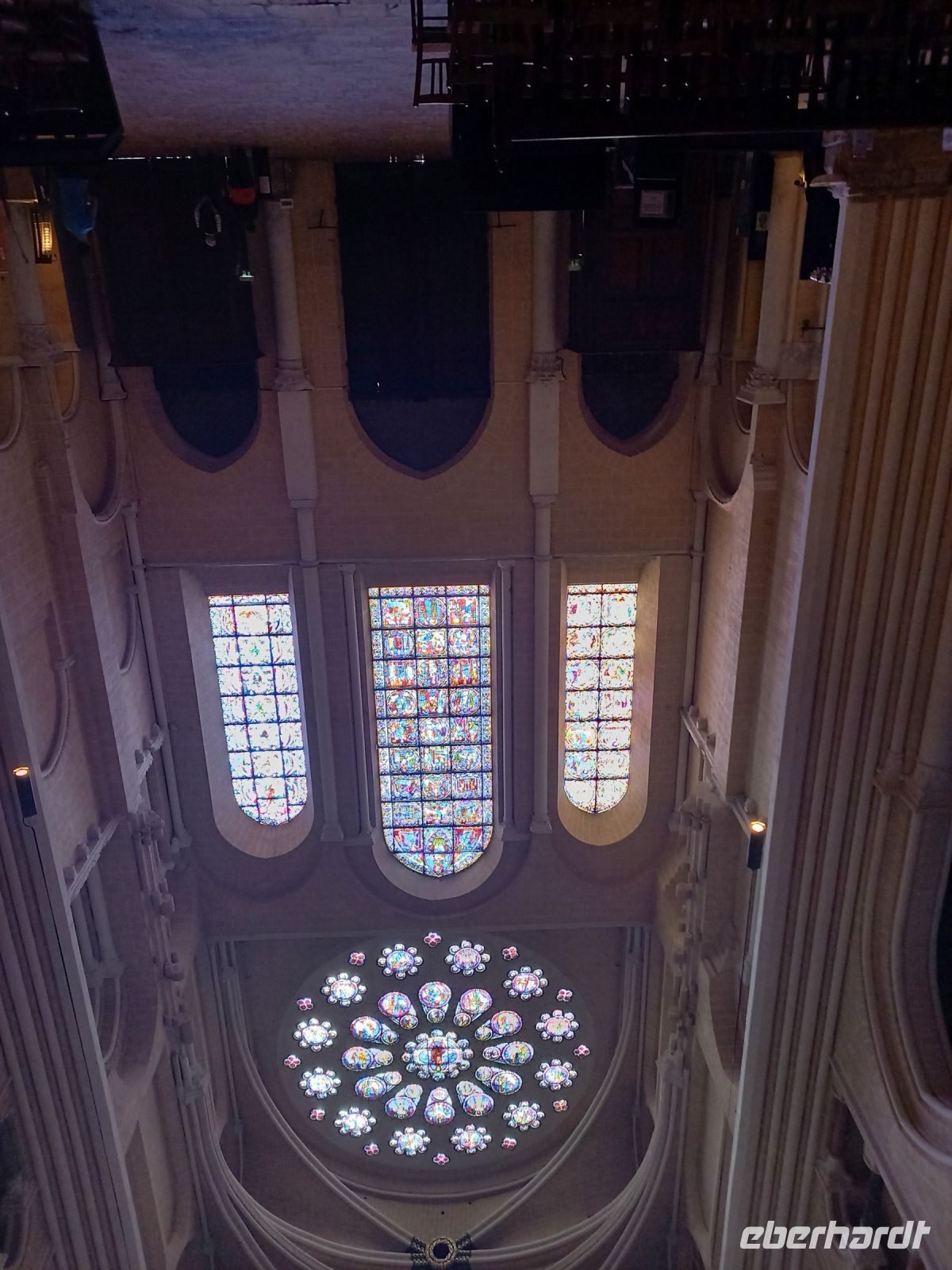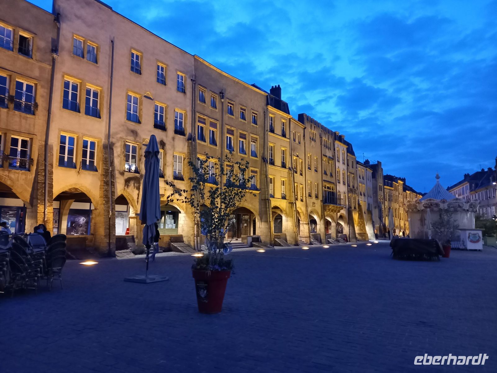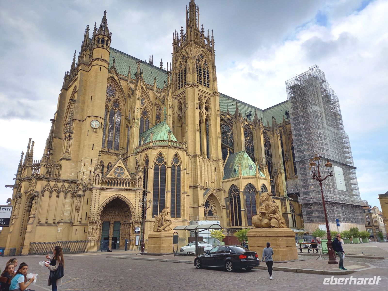 Sonntags reist man – wegen fehlender LKWs – doch eher entspannt durch Deutschland. So hatten wir eine recht übersichtliche Verkehrssituation, die es uns erlaubte, bereits am Nachmittag fast ganz Deutschland auf der Autobahn von Osten nach Südwesten durchquert zu haben und am Nachmittag Metz, einst Hauptort der Region Lothringen, die jetzt im neuen französischen Verwaltungsgebiet „Grand Est“ aufgegangen ist, zu erreichen. Unser hiesiges Hotel lag am Rand der hübschen Altstadt. Metz kann als bedeutender Marktort auf eine vielhundertjährige Geschichte zurückblicken und war zu Zeiten des Frankenreiches eine von dessen Hauptstädten, später Reichsstadt und schließlich auch eine bedeutende Handelsstadt im französischen Lothringen. Wir begannen einen Stadtrundgang an einem der historischen Märkte, an dessen Rand dass zur Gründungslegende der Stadt gehörende „Maison de Tete d’Or“ liegt, mit einigen einst vergoldeten Stuckköpfen verziert. . Von hier ging es durch die – wegen des Sonntags nicht sehr belebte – innere Altstadt bis zur Kathedrale mit den Reliquien des Heiligen Stefan. Seiner Bedeutung als Bischofssitz. verdankt es auch seine baulich bemerkenswerte herrliche Kathedrale Saint-Étienne, die zwischen 1220 und 1520 errichtet wurde. Sie beeindruckt nicht nur mit der ungewöhnlichen Höhe ihres gotischen Mittelschiffs, sondern die gewaltige Raumwirkung der Kirche ist auch auf die herrlichen vielfarbigen Glasfenster aus mehreren Jahrhunderten zurückzuführen. Die haben ihr einst nicht nur den Namen „Laterne des lieben Gottes“ beschert, sondern machen ihre etwa 6.500 m² Glasfläche zur größten und bedeutendsten ihrer Art in Frankreich. Immer noch auf dem höchsten Punkt der Altstadt neben altem Paradeplatz und neuer Markthalle über der die Stadt durchfließenden Mosel gelegen, beherrscht St.-Étienne bereits von weitem das Stadtbild. Weiter ging es dann hinunter zur Mosel, die hier durch eine große Insel geteilt wird, auf der das älteste erhaltene Theater Frankreich im Ensemble mit der danebenliegenden ehemaligen Präfektur Lothringens, kunstvoll von Blumenrabatten und Brunnen umrahmt, liegt. Über die ehemaligen Zwingerbefestigungen von Metz – heute als Esplanade eingeebnet – in deren Nähe die gut erhaltene Kapelle der einstigen hiesigen Komturei der Tempelritter liegt, kehrten wir zum Hotel zurück, wo uns ein leckeres Abendessen erwartete.