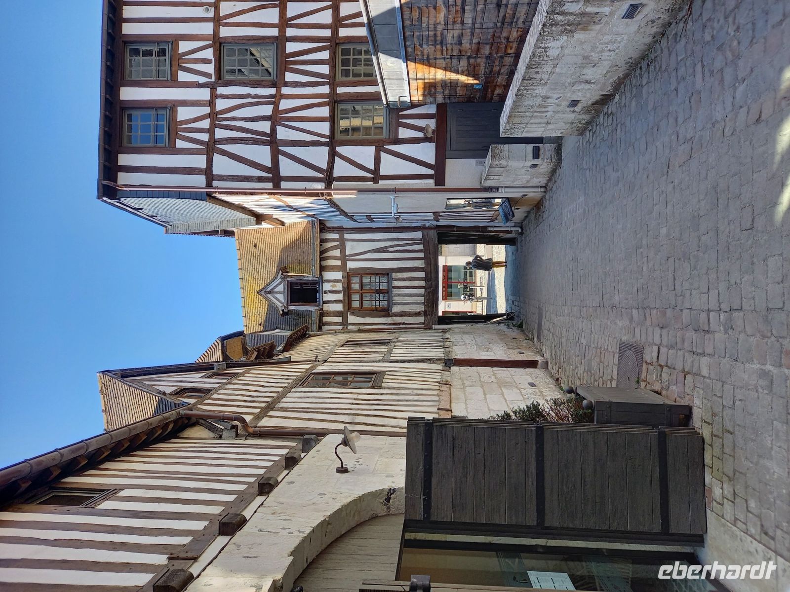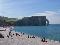 Die normannische Hauptstadt Rouen gehört zu den schönsten und am besten erhaltenen Altstädten Frankreichs. Wir begannen unseren Stadtrundgang vor der Westfassade der herrlichen Kathedrale. Auch sie gotisch wie die zuvor kurz besuchte Hauptkirche von Metz, wirkt sie jedoch baulich ganz anders. Einst hatte vom gegenüberliegenden Renaissancehaus den Blick zur Kirche malend, der impressionistische Künstler Claude Monet der wundervollen Eingangsfassade mit seinen 33 „Ansichten der Kathedrale“ als einer der bekanntesten Motivreihen des Impressionismus ein bleibendes bildnerisches Denkmal gesetzt. Filigran zeigen hier Rosenfenster, verschwenderisch eingesetztes Maßwerk und zierliche Strebewerke die ganze Vielfalt der Gotik. Eindrucksvoll ist auch der Figurenschmuck der Schaufassade zwischen den Türmen, von denen der rechte „Butterturm“ genannt wird, weil sein Bau mit Extrazahlungen aus Fastenzeiten finanziert wurde. Auch das Innere dieser Kirche beeindruckt mit phantastischer Raumwirkung und dem Eindruck sich mitten in der Gotik, der „Architektur des Lichts“ zu befinden. Wir verließen die Kirche durch den Seitenausgang und kamen dabei in einer der alten Fachwerkstraßen an, die direkt an der Kirche und den sich an sie anschließenden ehemaligen Bischofspalast entlangführt – den Resten jenes Gebäudes, das der Schauplatz des Prozesses gegen die französische Nationalheilige Jeanne d’Arc war, die als „Jungfrau von Orleans“ eine bedeutende Rolle im grausamen „hundertjährigen Krieg“ Englands gegen Frankreich gespielt hatte. Als die Engländer sie gefangen nahmen, veranstaltete man hier in Rouen einen Schauprozess wegen Ketzerei verurteilte sie 1431 zum Tode auf dem Scheiterhaufen. Unser Weg führte durch das alte Fachwerkviertel von Rouen hinter die alte Pfarrkirche Saint-Maclou, hinter der eine interessante, wenn auch leicht makabere Sehenswürdigkeit liegt: das „Aitre de Maclou“, ein alter Pestfriedhof, ist ein an allen Seiten von zweistöckigen Fachwerkgebäuden umgeben, deren Balken mit uralten Schnitzereien - Totenköpfe, Gebeine und Beerdigungswerkzeuge – versehen. Der Aitre gehört zu den ältesten geschlossenen Fachwerkensembles in Europa. Unserer weiterer Rundgang durch die Altstadt von Rouen zeigte uns den verzierten alten Parlamentsbau der Normandie, der heute Justizpalast ist und in der Übergang von der Spätgotik zur Frührenaissance entstand. Die alte Hauptstraße von der Kathedrale zum Markt erreichten wir dann wieder und durchquerten den Uhrturm mit seiner astronomischen Uhr neben dem der ehemalige Belfried, Rathausturm und Freiheitszeichen der Stadt, steht. Unser Ziel war der alte Markt von Rouen, den eine modernes Gebäude, eine Kirche in Form eines Drachen beherrscht und der umstanden wird von historischen Fachwerkhäusern. An einer bestimmten, durch ein großes Kreuz markierten Stelle wurde damals, Ende Mai 1431, die Nationalheldin Jeanne d‘Arc auf dem Scheiterhaufen verbrannt. Für die 1920 heiliggesprochene Jeanne wurde 1979 eine Kathedrale zu ihrem Gedenken an ihrer Hinrichtungsstätte errichtet – jener seltsam geformte Bau aus Stahlbeton, der als Höhepunkt des zum Gedenken konzipierten Innenraums 500 m² farbiger mittelalterlicher Glasfenster beinhaltet, die man aus der im Krieg zerstörten alten Marktkirche gerettet hatte. Hier am Markt hatten wir Freizeit für einen Mittagsimbiss und Souvenirkäufe. Später setzten wir unsere Reise zur Atlantikküste fort. Wir erreichten am frühen Nachmittag den Bade- und Künstlerort Ètretat, unter anderem bekannt für seine umgebenden Kreidefelsenformationen. Rasch war bei einem kurzen Spaziergang vom Busparkplatz zum Strand das malerische Städtchen durchquert und von der Schotterküste hatte man einen Superblick auf die Kreidefelsen, deren wunderlichen Formen ihnen den Namen „Elefantenfelsen“ eingebracht haben. Hier hatten wir bei herrlichem Wetter genügend Zeit für einen Spaziergang zu den Formationen an einem der schönsten Küstenabschnitte Europas. Auf der Weiterfahrt zum historischen Hafenort Honfleur passierten wir die unweit vom riesigen Ölhafen Le Havre liegende Hängebrücke Pont de Normandie. Zzwar hat ihr inzwischen die Hängebrück von Millau in Südfrankreich etwas den Rang und die Bekanntheit abgelaufen, aber immer noch gehört die Schrägseilbrücke, deren Länge in etwa der der berühmten Pariser Prachtstraße Champs-Elysées entspricht, zu den „Wundern“ der Normandie und der 1995 eröffnete Bau ist die wichtigste Straßenverbindung über die Seinemündung. Nach deren Überquerung erreichten wir die pittoresken Hafenstadt Honfleur. Sie zieht seit Jahrhunderten bedeutende Künstler an und verdankt ihren Ruf als eine der bedeutendsten normannischen Touristenattraktionen vor allem zwei Dingen: einer berühmten Holzkirche und einem uralten Hafenbecken. Die historische Katherinenkirche, wurde kurz nach dem französischen Sieg im hundertjährigen Krieg erbaut, als nicht nur Geld, sondern auch Baumeister und Steinmetze fehlten. So nutzte man in Honfleur die eigenen Gewerke: die – für Kirchenbauten ungewöhnlich: zweischiffige – Kirche wurde von Schiffszimmerleuten erbaut und zwar angeblich aus dem Materialien abgewrackter Schiffe. Direkt unterhalb der Katharinenkirche und ihrem kleinen Markt liegt das von malerischen hohen, schiefergedeckten Häusern umstandene alten Hafenbecken, das der Altstadt von Honfleur sein unverwechselbares Ambiente gibt. Wir setzten unseren Weg fort zum Hotel, das in Caen lag, dem Hauport des Departements Calvados, das auch dem berühmten normannischen Apfelbrand seinen Namen gab.