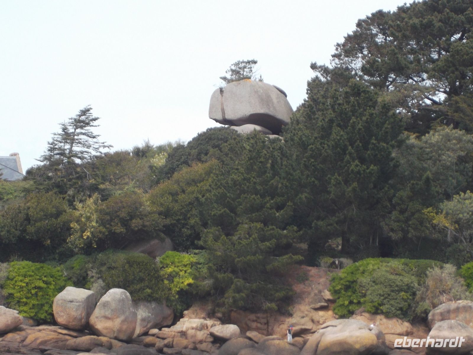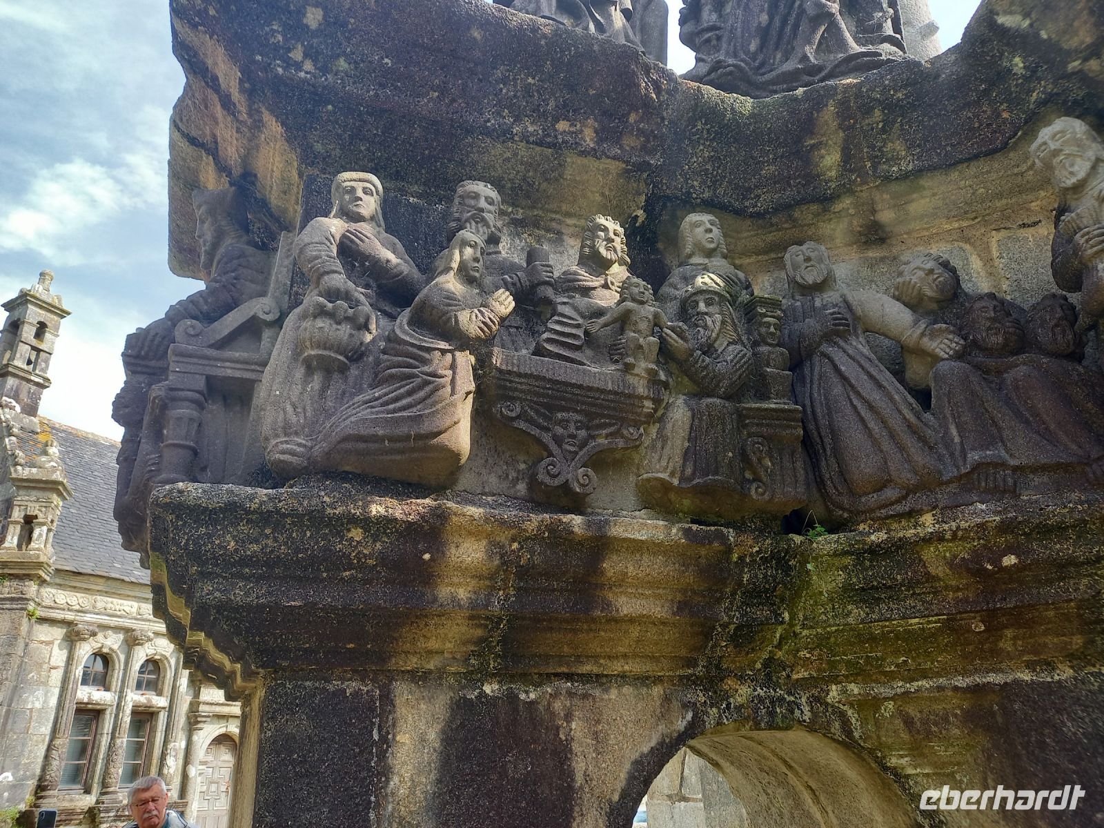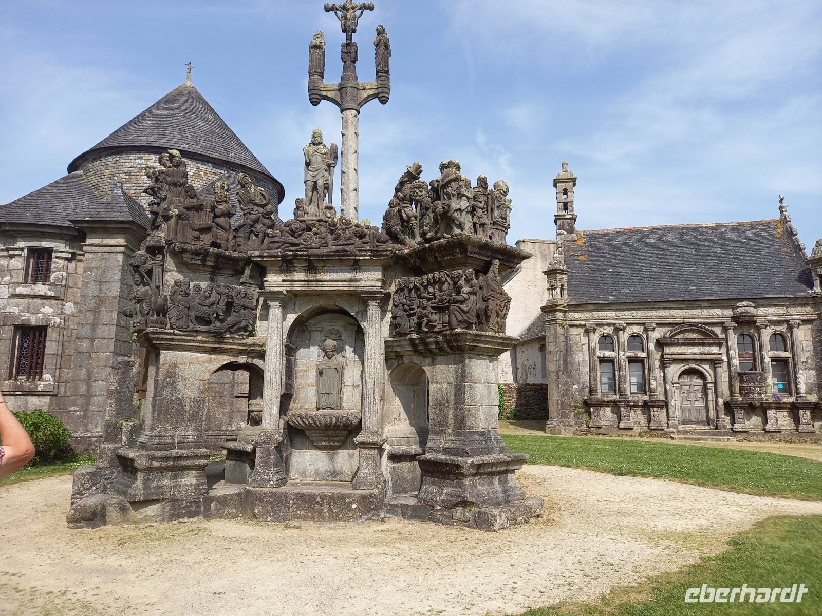 Unsere heutige Tagesetappe führte in die Stadt Quimper ziemlich im Westen der Bretagne. Erster Haltepunkt war das malerisch gelegene Kap Frehel, dessen Klippe über 70 m aus den Meeresfluten ragen. Mehrere Wege führen zum von vielen Bretagnefotos bekannten steinernen Leuchtturm von 1950, von dessen Felsenflanken man das Kap und Naturschauspiel bewundert, wie die Wellen des Atlantik-Wassers die Felsküste, bestehend aus verschiedenfarbigem Gestein, umtosen. Nach einer Stunde ging es schon weiter zur nächsten bekannten bretonischen Landschaft – der vor ungefähr 300 Millionen Jahren entstandenen rosa Granitküste. Die „Cote de granit rosé“ erhielt Farbe und Namen wegen bestimmter Mineralien im Gestein. Durch Erosion schließlich entstanden in der Umgebung des heutigen Ortes Ploumanach die heute noch berühmten und mit phantasievollen Namen versehenen Felsenformationen. Besonders gut sind sie im Verlauf des heute als Wanderweg beliebten „Zöllnerpfades“ vom Städtchen Ploumanach zu sehen. Am Nachmittag wurden wir mit den starken religiösen Traditionen und Besonderheiten der Bretagne konfrontiert. Nur hier, im Westen der Bretagne, gibt es eine Vielzahl „umfriedeter Pfarrhöfe“, Ensembles aus Dorfkirche, ummauertem Friedhof mit Triumphtor, Beinhaus und dem „Kalvarienberg“. Besonders bekannt und sehenswert ist ein solcher Pfarrhof im Dörchen Guimiliau. Kavarienberge – auf Französisch „calvaire“ nennt man die „Bauernaltäre“ der Region, die vor allem für Außengottesdienste gedacht sind. Der von Guimiliau gilt als einer der am reichsten verzierten seiner Art: ein steinernes Podest mit üppigem Figurenschmuck und einer aus der Mitte aufragenden Kreuzigungsgruppe. Aus hartem Granit sind die Figuren der Kalvarienberge, an denen die Priester einst die von den steinernen Bildwerken untermalten Geschichten aus der Bibel erzählten. Fast alle ähnlichen Dorfkirchen und Ensembles stammen aus dem 16. oder 17.Jahrhundert und wurden fast alle wurden von Bauernkünstlern aus der Umgebung gestaltet. Nach dem Besuch des Pfarrhofs in Guimiliau reisten wir für die nächsten zwei Übernachtungen nach Quimper weiter.