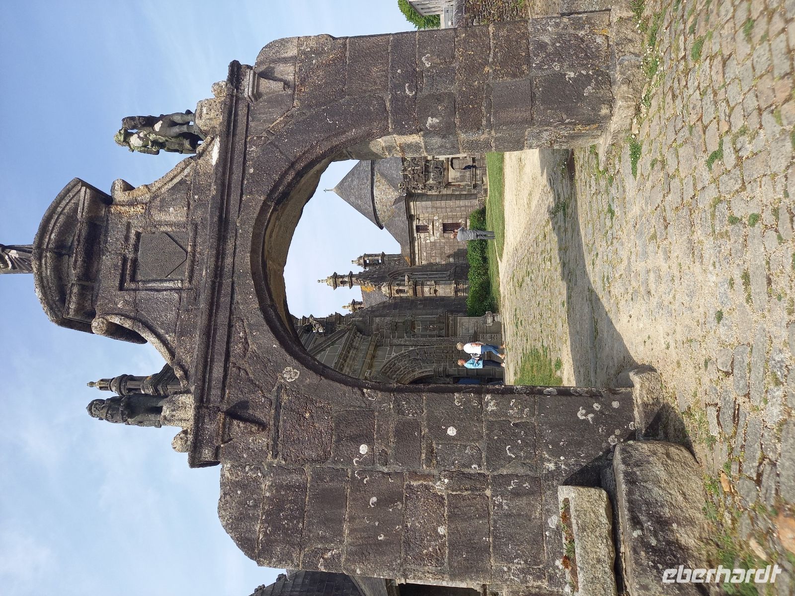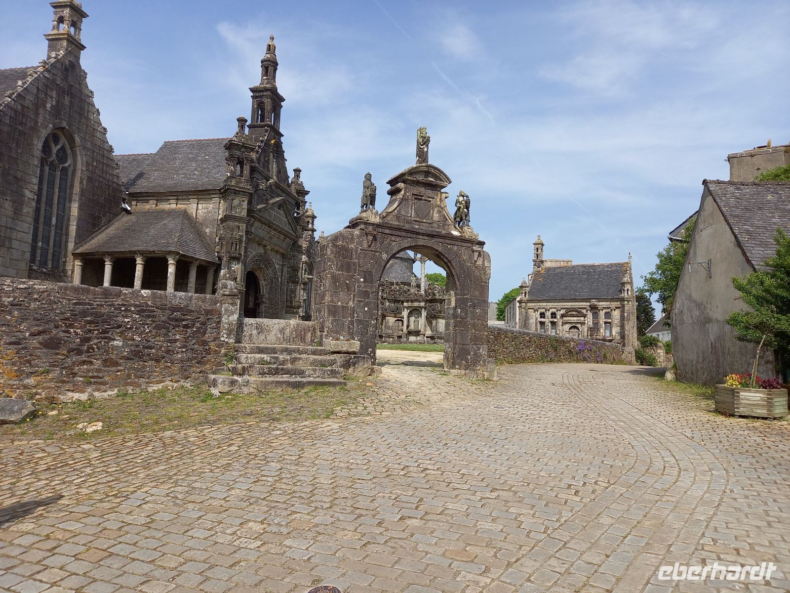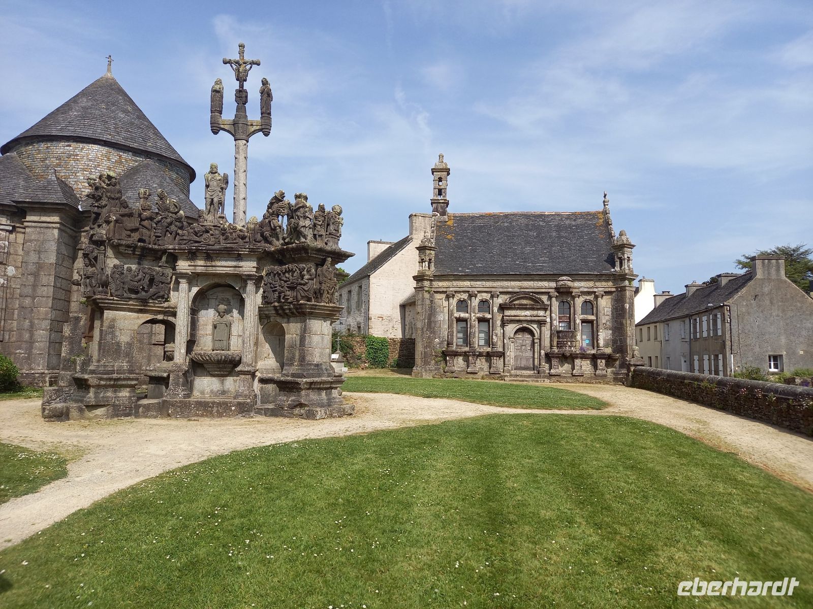 An unserem heutigen fakultativen Ausflug auf die Halbinel Cournouaille nahmen alle 31 Gäste teil. Unser erstes Ziel war der westlichste Punkt der Halbinsel Cornouaille – was übersetzt „Cornwall“ bedeutet, da ihre Besiedlung angeblich von dieser südwestlichen Halbinsel Großbritanniens aus erfolgt ist. Und die Entsprechung von Lands End – Englands südwestlicher Spitze, ist in der Bretagne die Pointe du Raz, die tatsächlich mit ihren brandungsumtosten dunklen Felsen dem Ort in England sehr ähnelt. Während die Gäste die malerische Landzunge bei einem Spaziergang erkundeten, kauften unser Chauffeur Frank Schünzel und ich für ein Picknick ein. Das bauten wir dann kurz vor Rückkehr der Gäste auf dem Picknickplatz am Parkplatz der Pointe du Raz auf und alle taten sich zum Mittagessen an diesem herrlichen Tag daran gütlich. Danach führte uns der Weg vorbei an der Westküste, an der sich die malerische, allerdings für die Schifffahrt nicht ungefährliche „Baie des Trepasseés“ ausbreitet. Einen weiteren Fotostopp legten wir an Kirche und Kalvarienberg des Dörfchens Confort-Meilars ein. In der Kirche befindet sich ein sehr seltenes wundertätiges Glockenrad. Hauptziel des Nachmittags war aber das pittoreske Städtchent Locronan. Früher durch seine Segeltuchherstellung bekannt und wohlhabend geworden, bewahrte es sein mittelalterliches Flair wie kaum ein anderer Ort in Frankreich. Deshalb gehört es nicht nur offiziell zu den schönsten Orten Frankreichs,und steht komplett unter Denkmalschutz, sondern war auch wiederholt Filmkulisse, vorzugsweise für historische Filme. Mehrere inzwischen klassische „Musketiere“-Verfilmungen, französische Historienfilme und Serien sowie beispielsweise die in den 60er Jashren sehr bekannten „Angelique“-Filme wurden hier gedreht. Anschließend fuhren wir zurück nach Quimper, damit noch ein Spaziergang ins nahe Stadtzentrum und zur Kathedrale St. Corentin möglich wurde.