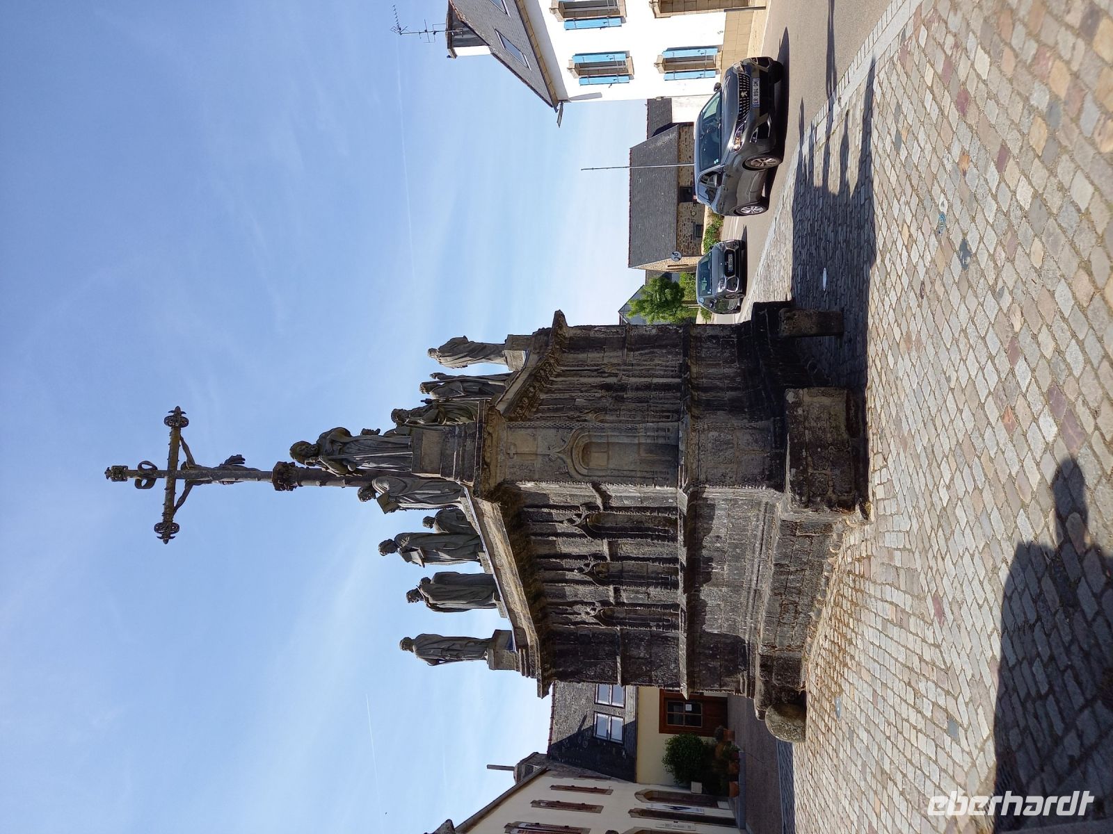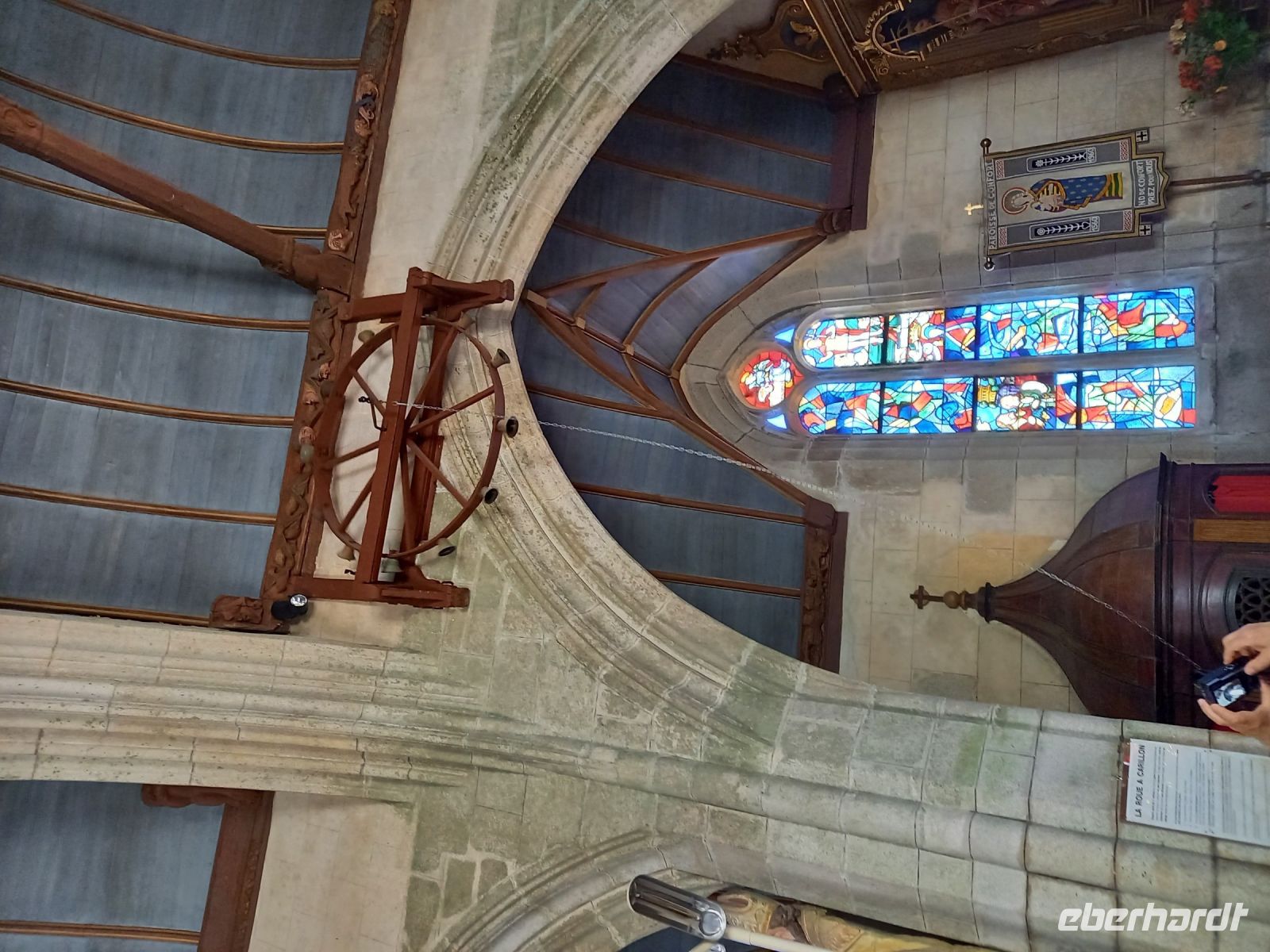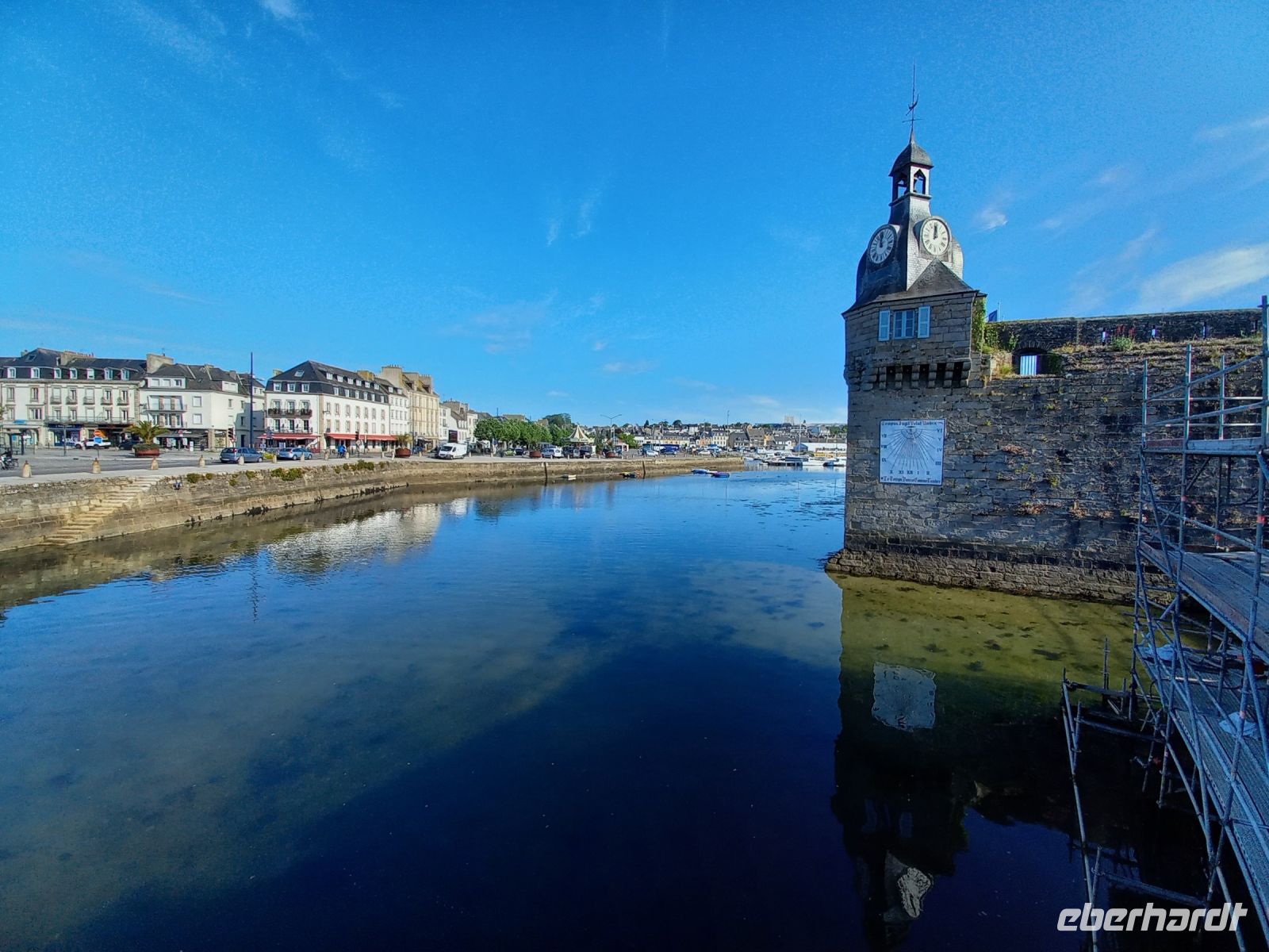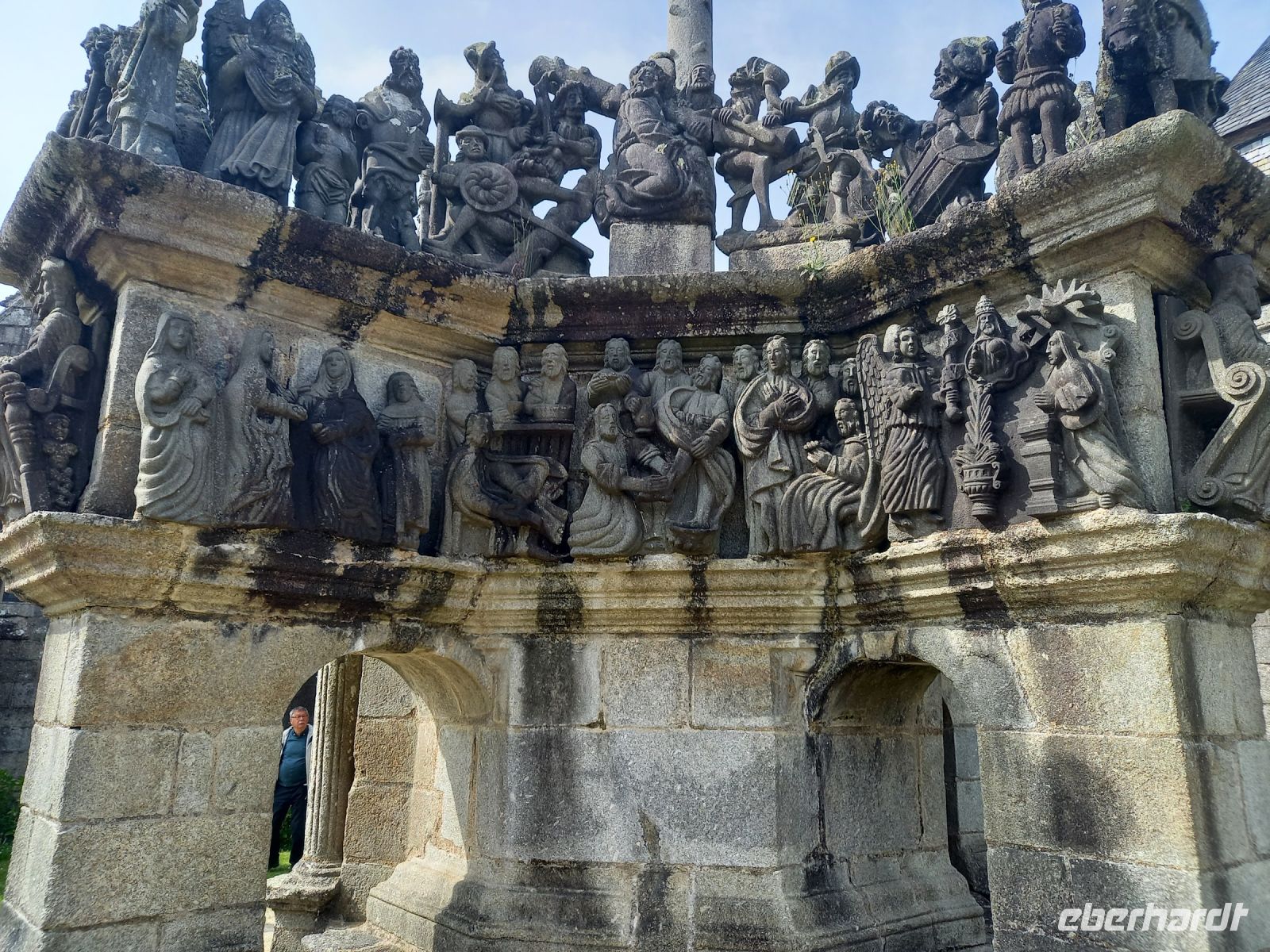 An unserem heutigen fakultativen Ausflug auf die Halbinel Cournouaille nahmen alle 31 Gäste teil. Unser erstes Ziel war der westlichste Punkt der Halbinsel Cornouaille – was übersetzt „Cornwall“ bedeutet, da ihre Besiedlung angeblich von dieser südwestlichen Halbinsel Großbritanniens aus erfolgt ist. Und die Entsprechung von Lands End – Englands südwestlicher Spitze, ist in der Bretagne die Pointe du Raz, die tatsächlich mit ihren brandungsumtosten dunklen Felsen dem Ort in England sehr ähnelt. Während die Gäste die malerische Landzunge bei einem Spaziergang erkundeten, kauften unser Chauffeur Frank Schünzel und ich für ein Picknick ein. Das bauten wir dann kurz vor Rückkehr der Gäste auf dem Picknickplatz am Parkplatz der Pointe du Raz auf und alle taten sich zum Mittagessen an diesem herrlichen Tag daran gütlich. Danach führte uns der Weg vorbei an der Westküste, an der sich die malerische, allerdings für die Schifffahrt nicht ungefährliche „Baie des Trepasseés“ ausbreitet. Einen weiteren Fotostopp legten wir an Kirche und Kalvarienberg des Dörfchens Confort-Meilars ein. In der Kirche befindet sich ein sehr seltenes wundertätiges Glockenrad. Hauptziel des Nachmittags war aber das pittoreske Städtchent Locronan. Früher durch seine Segeltuchherstellung bekannt und wohlhabend geworden, bewahrte es sein mittelalterliches Flair wie kaum ein anderer Ort in Frankreich. Deshalb gehört es nicht nur offiziell zu den schönsten Orten Frankreichs,und steht komplett unter Denkmalschutz, sondern war auch wiederholt Filmkulisse, vorzugsweise für historische Filme. Mehrere inzwischen klassische „Musketiere“-Verfilmungen, französische Historienfilme und Serien sowie beispielsweise die in den 60er Jashren sehr bekannten „Angelique“-Filme wurden hier gedreht. Anschließend fuhren wir zurück nach Quimper, damit noch ein Spaziergang ins nahe Stadtzentrum und zur Kathedrale St. Corentin möglich wurde.