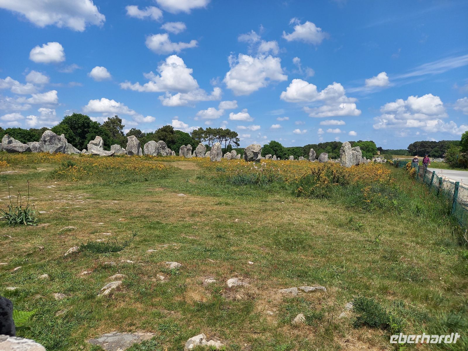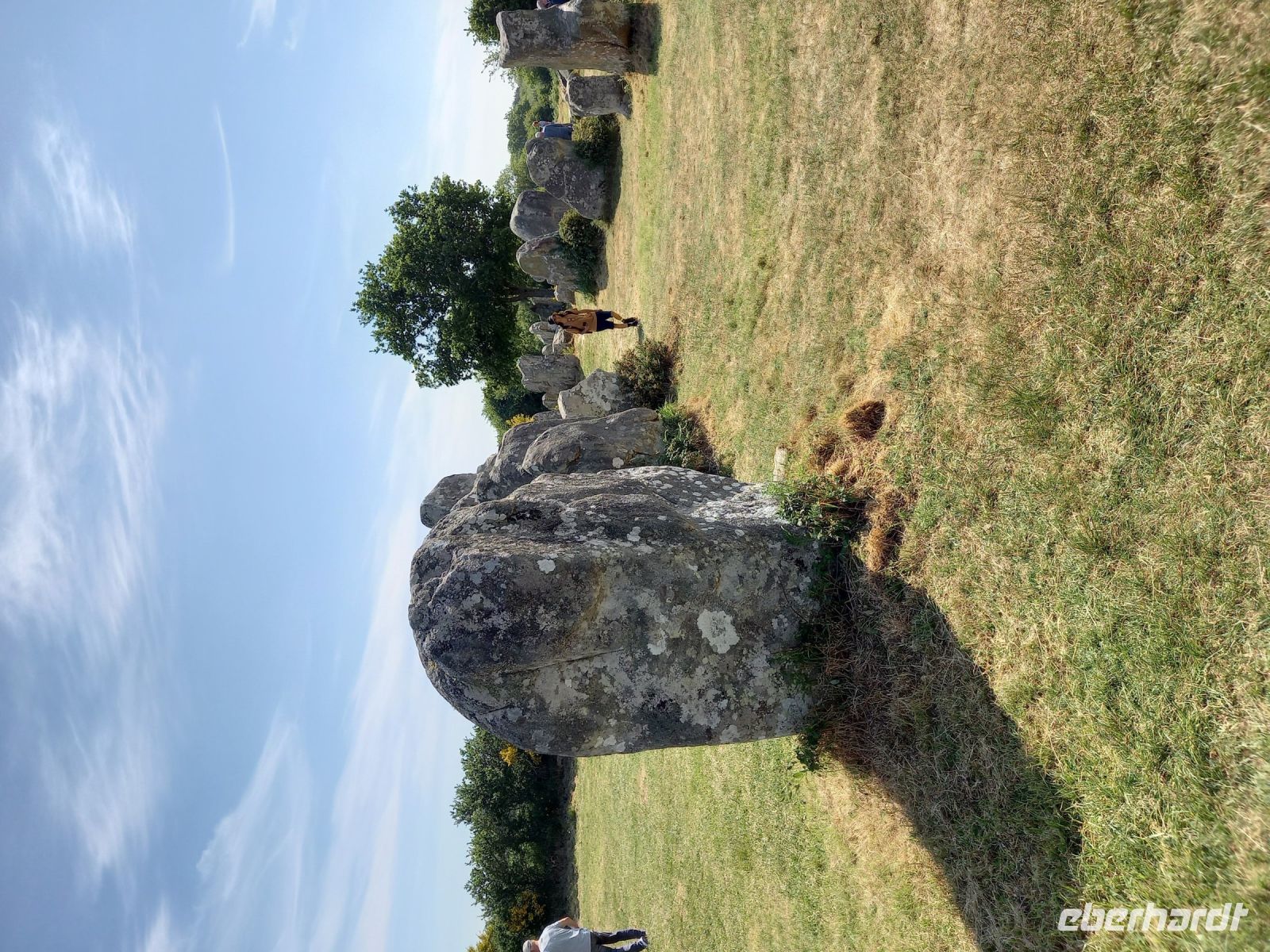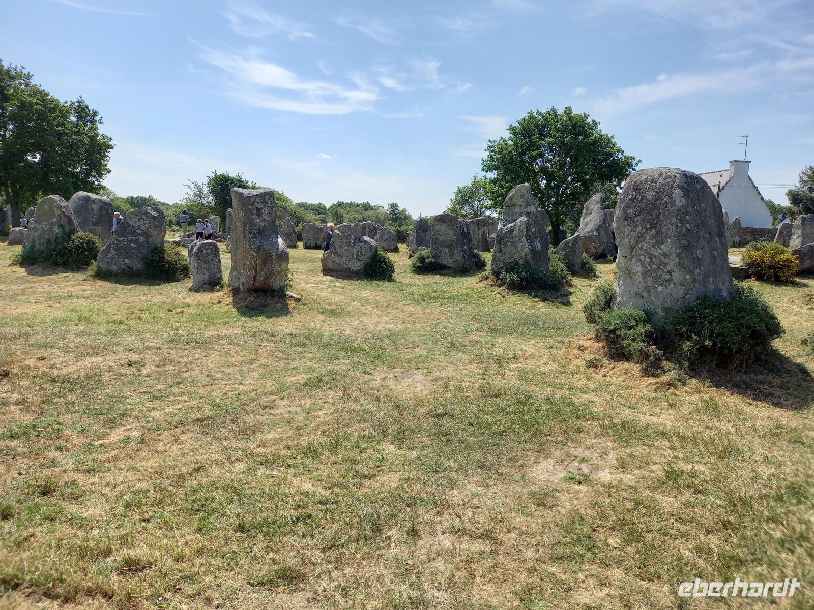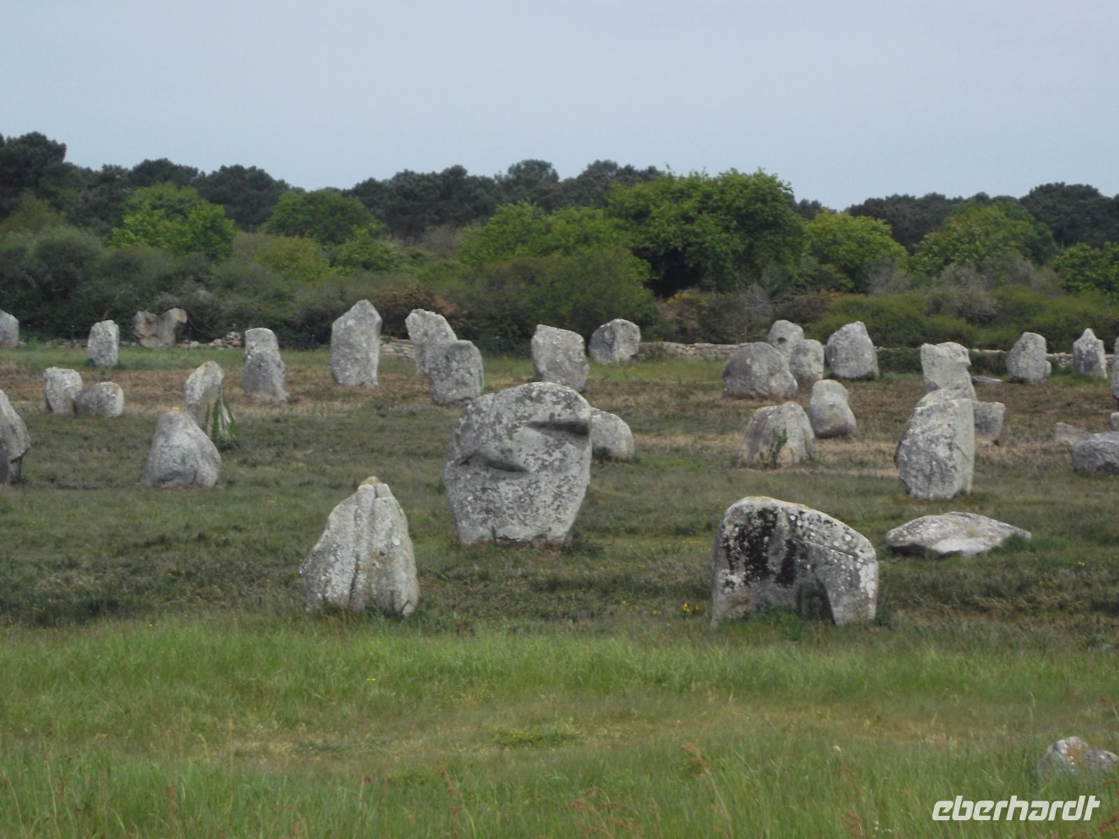 Immer noch ging es weiter nach Süden und unser erster Halt war in der Fischereistadt Concarneau. Bekannt inzwischen als „Wohnort“ des Kommissars Dupin in den Filmen nach Romanvorlagen des Krimiautors Jean-Luc Bannalec, besitzt der Fischereiohafen vor allem eine sehenswerte Altstadt. Sie liegt auf einer einstmals leicht zu verteidigenden Gezeiteninsel. Ihre Form ähnelt einem gewaltigen steinernen Schiff und da sie nur einen leicht zu verteidigenden Zugang hatte, wurde und wird sie „La Ville close“ genannt, die „geschlossene Stadt“. Ich heutiges Erscheinungsbild prägte Vauban, der Festungsbaumeister Ludwigs XIV. seine im 17. Jh. angelegten Festungswerke umschließen immer noch komplett die kleine, etwa 350 lange und 150 m breite Insel und ihr einziger Zugang wird durch eine Art Sperrfestung gesichert. Hier hindurch muss man, wenn man in Vaubans Garnisons- und Artilleriestadt hinein will. Noch heute hat sie ihr mittelalterliches Gepräge, an den nur zwei Hauptstraßen, durch wenige Quergassen verbunden, scheint sich an der Seefestungsstadt des 17. Jahrhunderts kaum etwas geändert zu haben. Hier hatten wir etwas Zeit zu bummeln, bevor wir zur Autobahn zurückkehrten und uns auf den Weg zu den großen französischen Megalithanlagen machten. Die Zeugnisse und Überreste der aus der Steinzeit stammenden Großsteinkultur gibt es zwar in vielen Ländern Europas, aber die „Alignements“ genannten Reihen aus riesigen, parallel stehenden Steinen sind eine Spezialität der Bretagne. Einen ersten Fotostopp an diesen Alleen aus tonnenschweren Felsbrocken legten wir am Alignement von Kerzhero, ein, einem der wenigen, wo man noch ungehindert direkt zwischen den stehenden Kolossen herumlaufen darf. Bevor wir jedoch weiter fuhren zu den bekannteren Steinreihen von Carnac gestatten wir uns einen kleinen Abstecher auf die weit in den Atlantik gestreckte schmale Halbinsel Quiberon. Entlang der „cote sauvage“ – der “wilden Küste“- die zu den schönsten Felsenküsten der Bretagne gehört, aber leider kaum noch Haltepunkte für Busse gewährt, gelangten wir in den hübschen, sehr mediterran anmutenden Badeort Quiberon, wo wir eine kurze Pause einlegen konnten. Zurück ging es dann und nach Carnac. Wo wir am größten – allerdings eingezäunten – der Alignements hielten. Paradestück neben den über tausend aufrecht stehenden in mehreren Reihen exakt parallel ausgerichteten Steinen ist ein gut erhaltener Dolmen, der als Prototyp für alle Großsteingräber, die bei uns „Hünengräber“ genannt werden, gelten könnte. Anschließend brachte uns der Bus nach Vannes, einer kleinen mittelalterlich wirkenden Stadt, die früher einmal Hauptstadt und Parlamentssitz der Bretagne gewesen war. Wir stiegen an der Spitze des langgestreckten Hafens von Vannes aus, genau da, wo ein Tor in die ummauerte Stadt führt. Wir nutzten jedoch den Weg außerhalb der Mauer und konnten So nicht nur die Reste des einstigen Herzogsschlosses sehen, sondern auch den herrlichen Garten bewundern, den die Bewohner aus den Gräben der einstigen Stadtbefestigung gemacht haben. Auch das berühmte historische Waschhaus aus dem 16. Jh. vor den Befestigungen am einst den Stadtgraben bildenden Flüßchen konnten wir sehen. Dann betraten die Stadt durch das alte „Gefängnistor“ und sahen noch einen Teil der alten Fachwerkinnenstadt bevor wir uns vor der Kathedrale verabredeten, um noch etas Freizeit in der Stadt zu verbringen. Anschließend trafen wir uns und gingen gemeinsam zum Bus, um nach kurzer Fahrt zu unserer letzten Übernachtung in der Bretagne einzuchecken.