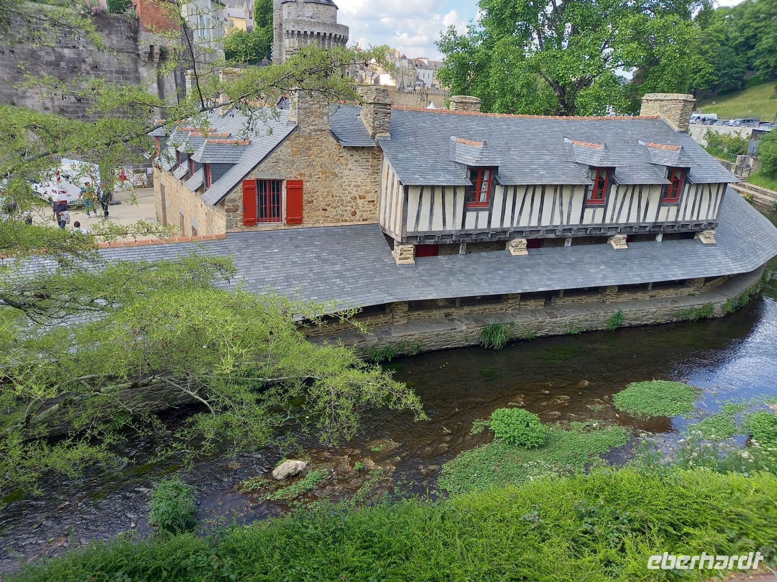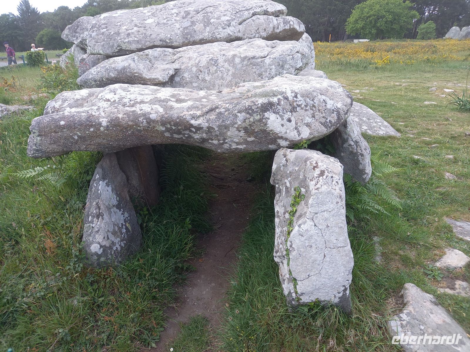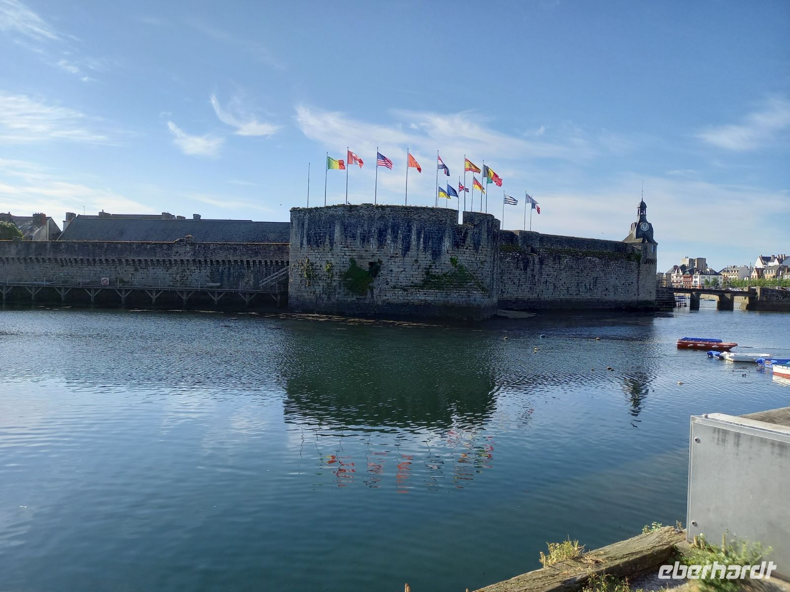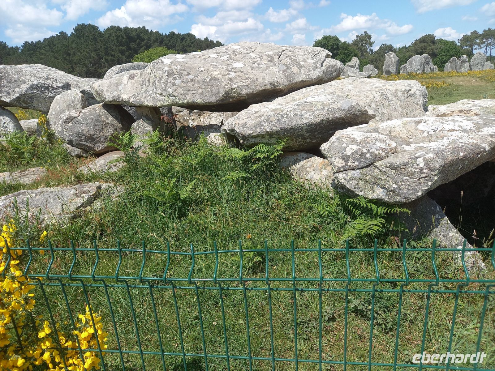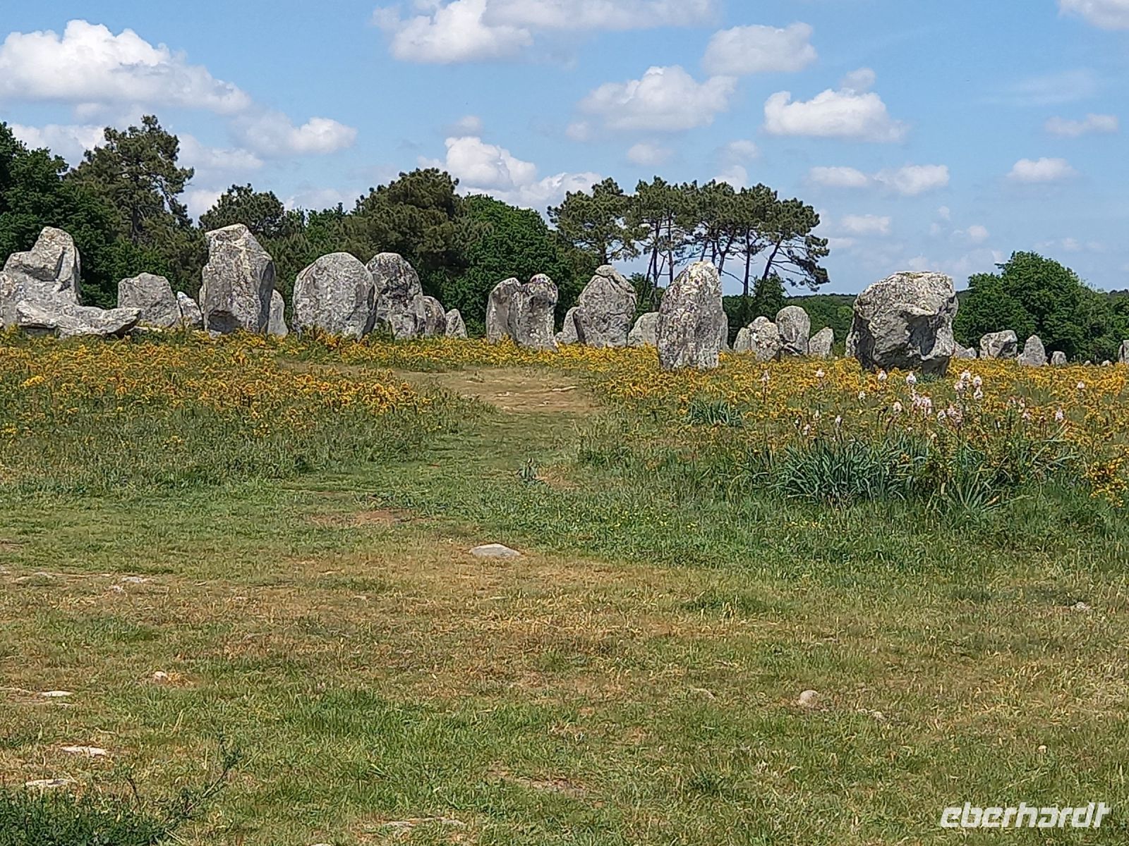 Immer noch ging es weiter nach Süden und unser erster Halt war in der Fischereistadt Concarneau. Bekannt inzwischen als „Wohnort“ des Kommissars Dupin in den Filmen nach Romanvorlagen des Krimiautors Jean-Luc Bannalec, besitzt der Fischereiohafen vor allem eine sehenswerte Altstadt. Sie liegt auf einer einstmals leicht zu verteidigenden Gezeiteninsel. Ihre Form ähnelt einem gewaltigen steinernen Schiff und da sie nur einen leicht zu verteidigenden Zugang hatte, wurde und wird sie „La Ville close“ genannt, die „geschlossene Stadt“. Ich heutiges Erscheinungsbild prägte Vauban, der Festungsbaumeister Ludwigs XIV. seine im 17. Jh. angelegten Festungswerke umschließen immer noch komplett die kleine, etwa 350 lange und 150 m breite Insel und ihr einziger Zugang wird durch eine Art Sperrfestung gesichert. Hier hindurch muss man, wenn man in Vaubans Garnisons- und Artilleriestadt hinein will. Noch heute hat sie ihr mittelalterliches Gepräge, an den nur zwei Hauptstraßen, durch wenige Quergassen verbunden, scheint sich an der Seefestungsstadt des 17. Jahrhunderts kaum etwas geändert zu haben. Hier hatten wir etwas Zeit zu bummeln, bevor wir zur Autobahn zurückkehrten und uns auf den Weg zu den großen französischen Megalithanlagen machten. Die Zeugnisse und Überreste der aus der Steinzeit stammenden Großsteinkultur gibt es zwar in vielen Ländern Europas, aber die „Alignements“ genannten Reihen aus riesigen, parallel stehenden Steinen sind eine Spezialität der Bretagne. Einen ersten Fotostopp an diesen Alleen aus tonnenschweren Felsbrocken legten wir am Alignement von Kerzhero, ein, einem der wenigen, wo man noch ungehindert direkt zwischen den stehenden Kolossen herumlaufen darf. Bevor wir jedoch weiter fuhren zu den bekannteren Steinreihen von Carnac gestatten wir uns einen kleinen Abstecher auf die weit in den Atlantik gestreckte schmale Halbinsel Quiberon. Entlang der „cote sauvage“ – der “wilden Küste“- die zu den schönsten Felsenküsten der Bretagne gehört, aber leider kaum noch Haltepunkte für Busse gewährt, gelangten wir in den hübschen, sehr mediterran anmutenden Badeort Quiberon, wo wir eine kurze Pause einlegen konnten. Zurück ging es dann und nach Carnac. Wo wir am größten – allerdings eingezäunten – der Alignements hielten. Paradestück neben den über tausend aufrecht stehenden in mehreren Reihen exakt parallel ausgerichteten Steinen ist ein gut erhaltener Dolmen, der als Prototyp für alle Großsteingräber, die bei uns „Hünengräber“ genannt werden, gelten könnte. Anschließend brachte uns der Bus nach Vannes, einer kleinen mittelalterlich wirkenden Stadt, die früher einmal Hauptstadt und Parlamentssitz der Bretagne gewesen war. Wir stiegen an der Spitze des langgestreckten Hafens von Vannes aus, genau da, wo ein Tor in die ummauerte Stadt führt. Wir nutzten jedoch den Weg außerhalb der Mauer und konnten So nicht nur die Reste des einstigen Herzogsschlosses sehen, sondern auch den herrlichen Garten bewundern, den die Bewohner aus den Gräben der einstigen Stadtbefestigung gemacht haben. Auch das berühmte historische Waschhaus aus dem 16. Jh. vor den Befestigungen am einst den Stadtgraben bildenden Flüßchen konnten wir sehen. Dann betraten die Stadt durch das alte „Gefängnistor“ und sahen noch einen Teil der alten Fachwerkinnenstadt bevor wir uns vor der Kathedrale verabredeten, um noch etas Freizeit in der Stadt zu verbringen. Anschließend trafen wir uns und gingen gemeinsam zum Bus, um nach kurzer Fahrt zu unserer letzten Übernachtung in der Bretagne einzuchecken.