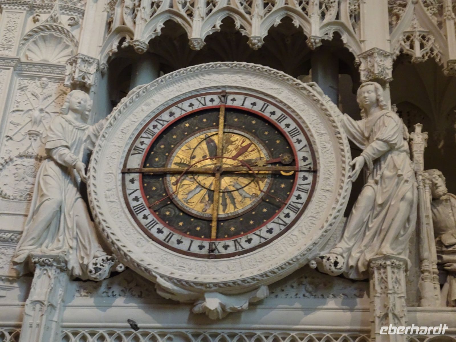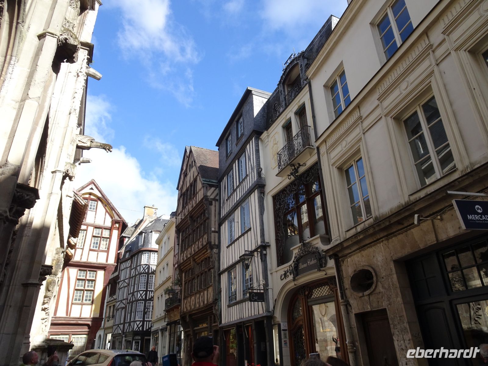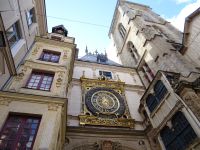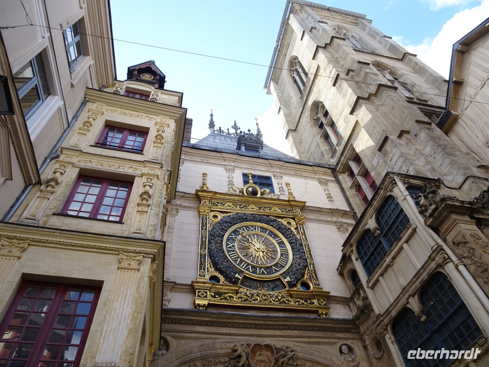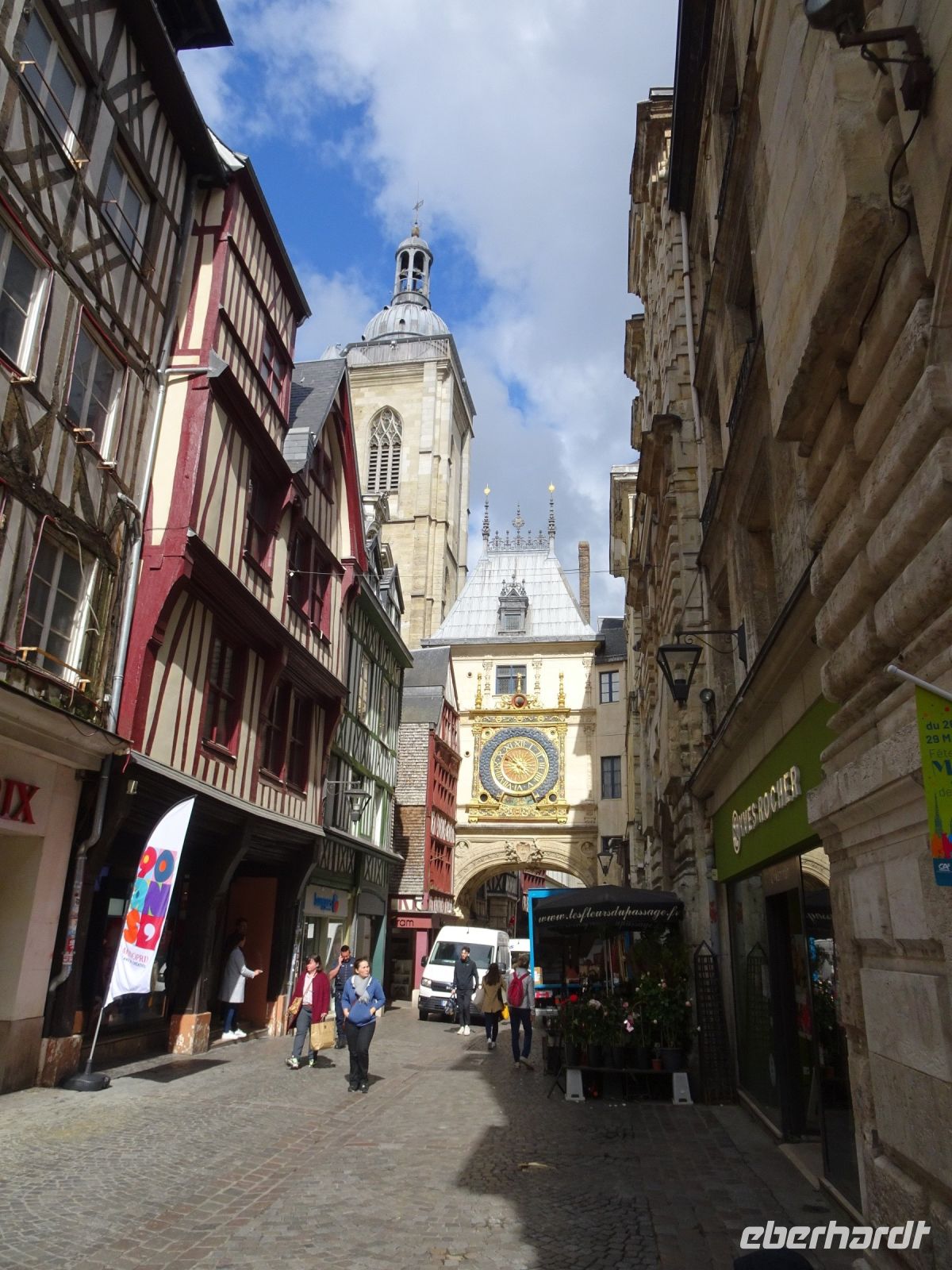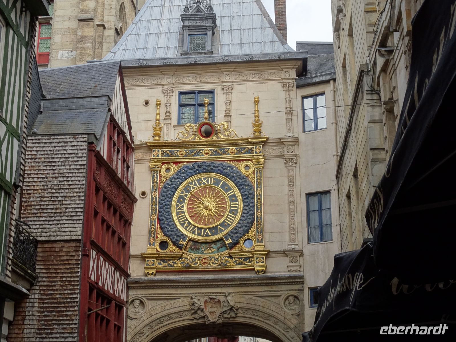 Nach der Besichtigung der Kathedrale spazieren wir weiter durch die Altstadt, vorbei an den schönen Fachwerkhäusern bis zum Altmarkt. Hier wurde Jean dÁrc 1431 zum Tode verurteilt und verbrannt. Weiter geht es in die Rue du Gros Horloge, eine belebte und beliebte Einkaufsstraße. In einem Torbogen über der Straße befindet sich (auf beiden Seiten) eine große astronomische Uhr aus dem Jahre 1389. Die Zifferblätter sind mit 24 Sonnenstrahlen geschmückt. Neben der Uhrzeit werden auch Mondphasen und Wochentage angezeigt.