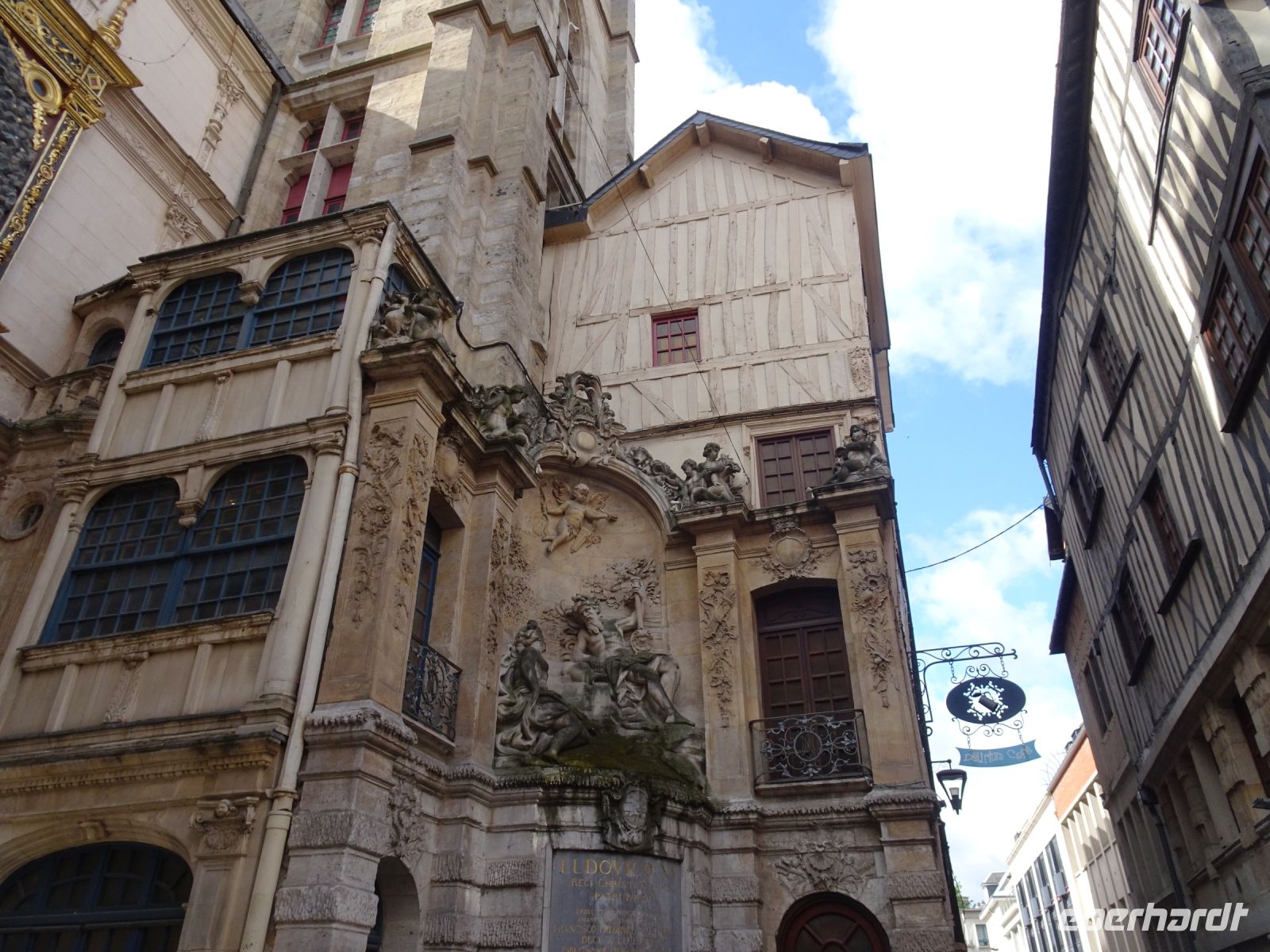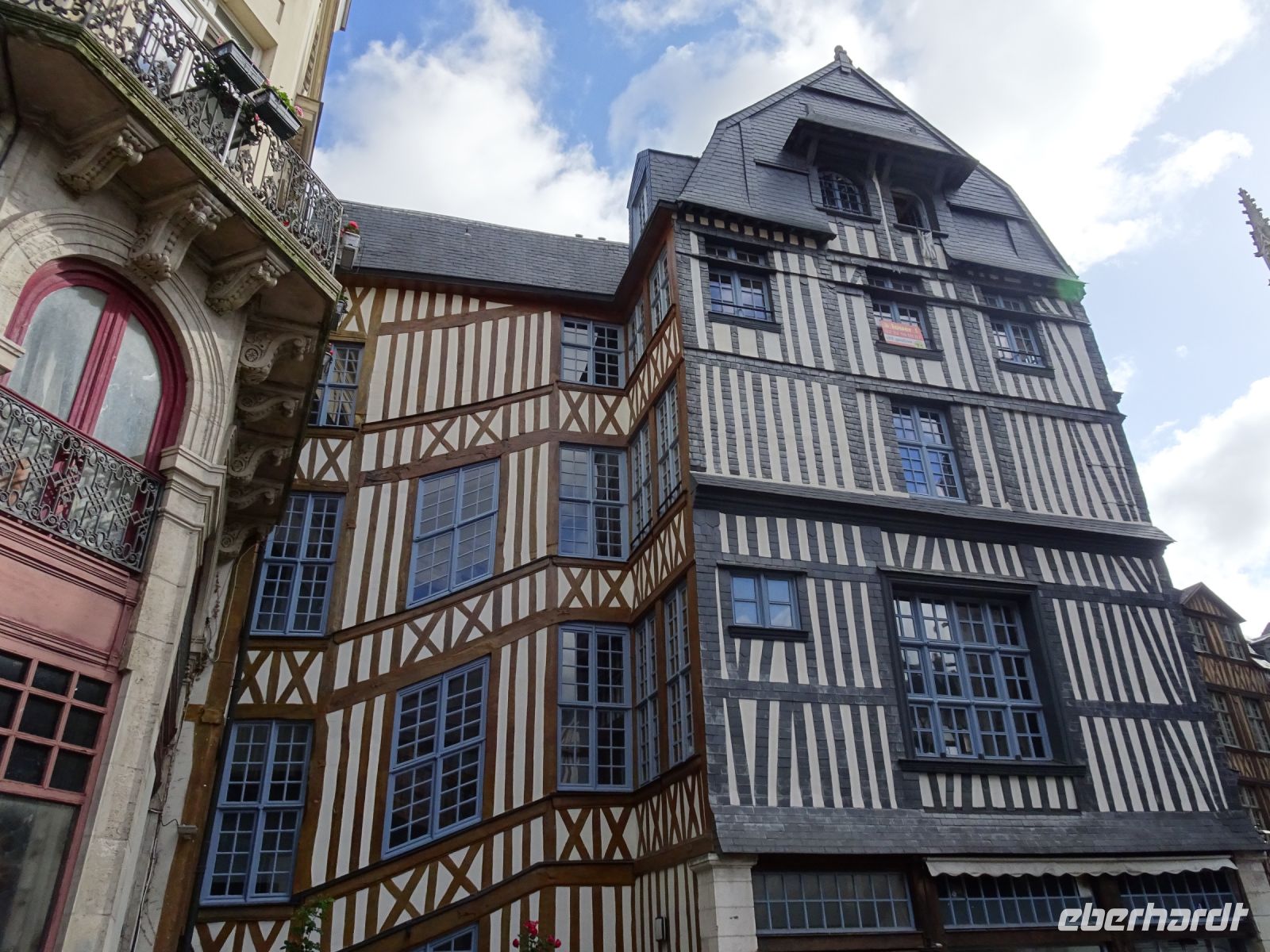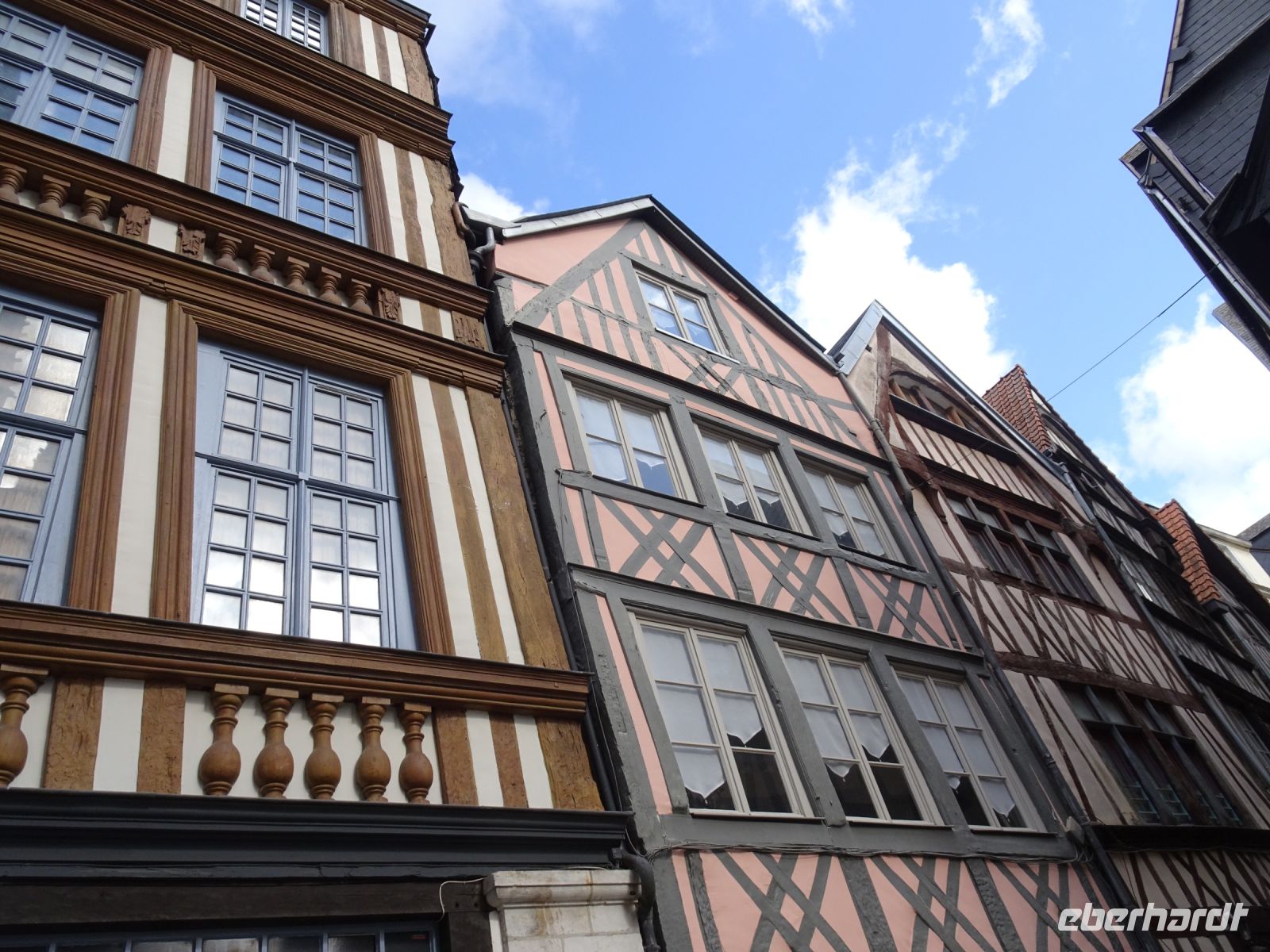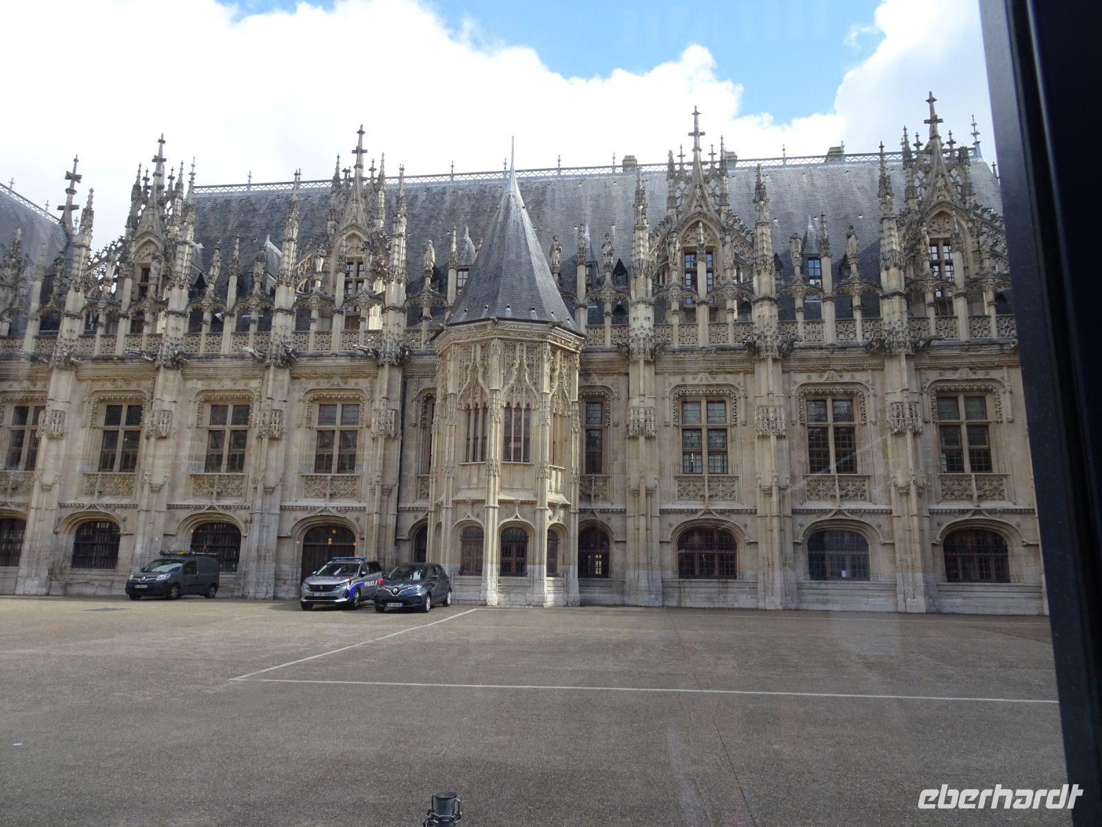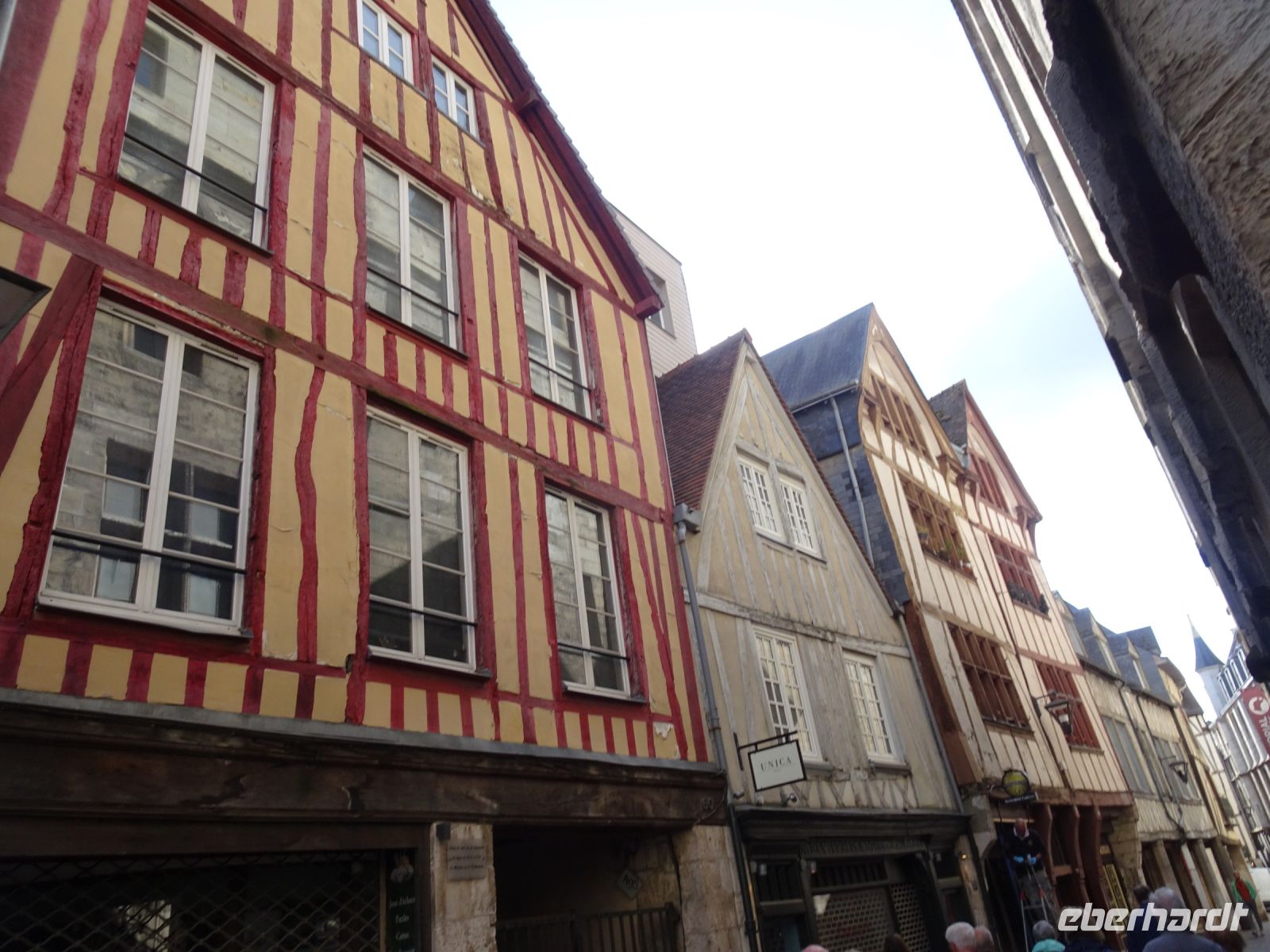Nach der Besichtigung der Kathedrale spazieren wir weiter durch die Altstadt, vorbei an den schönen Fachwerkhäusern bis zum Altmarkt. Hier wurde Jean dÁrc 1431 zum Tode verurteilt und verbrannt. Weiter geht es in die Rue du Gros Horloge, eine belebte und beliebte Einkaufsstraße. In einem Torbogen über der Straße befindet sich (auf beiden Seiten) eine große astronomische Uhr aus dem Jahre 1389. Die Zifferblätter sind mit 24 Sonnenstrahlen geschmückt. Neben der Uhrzeit werden auch Mondphasen und Wochentage angezeigt.