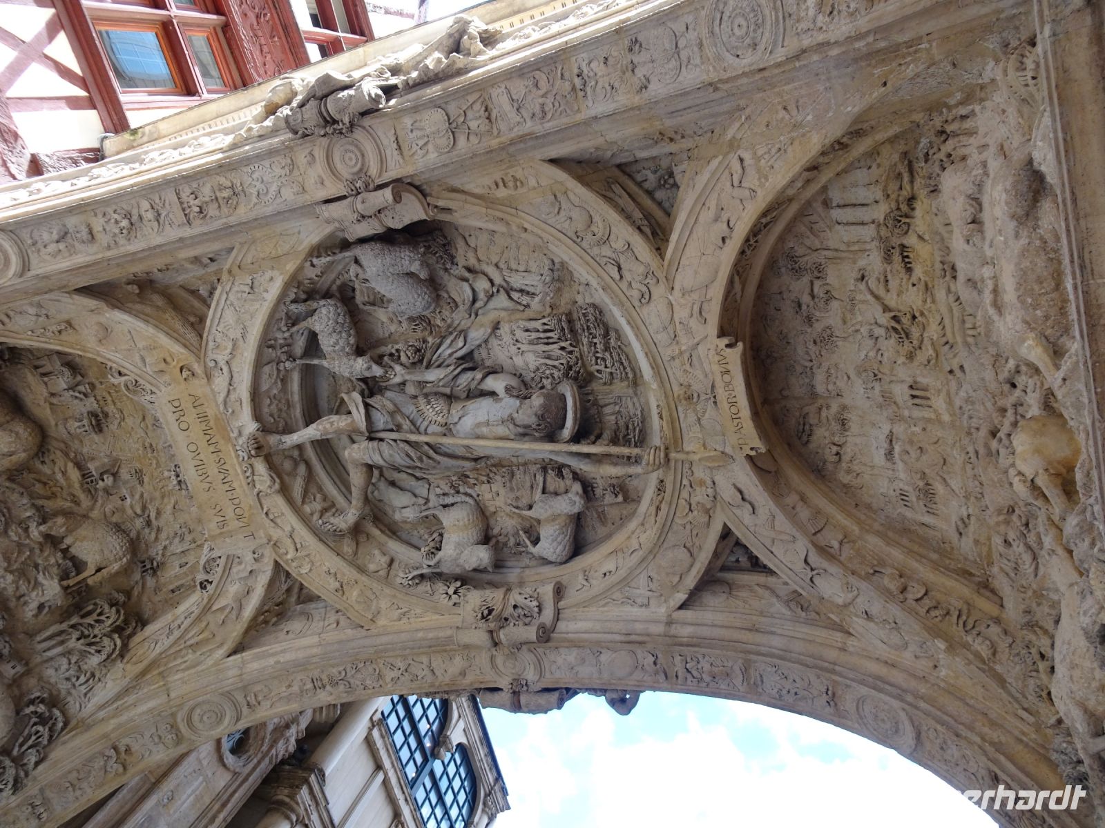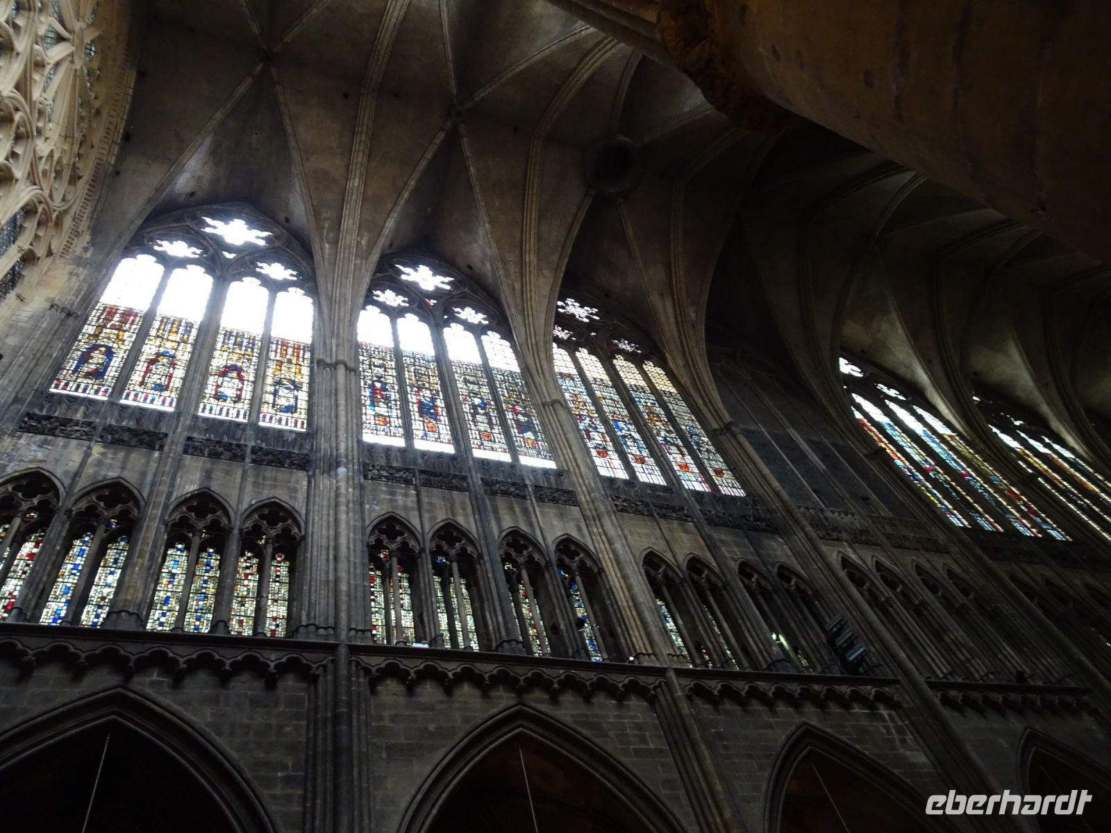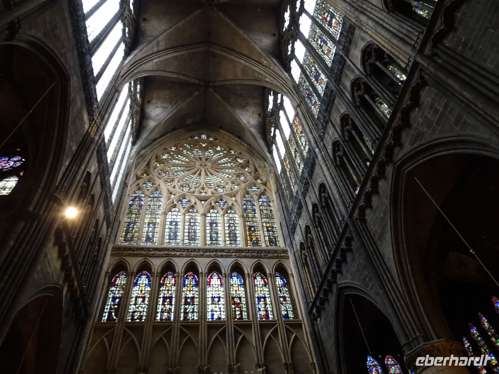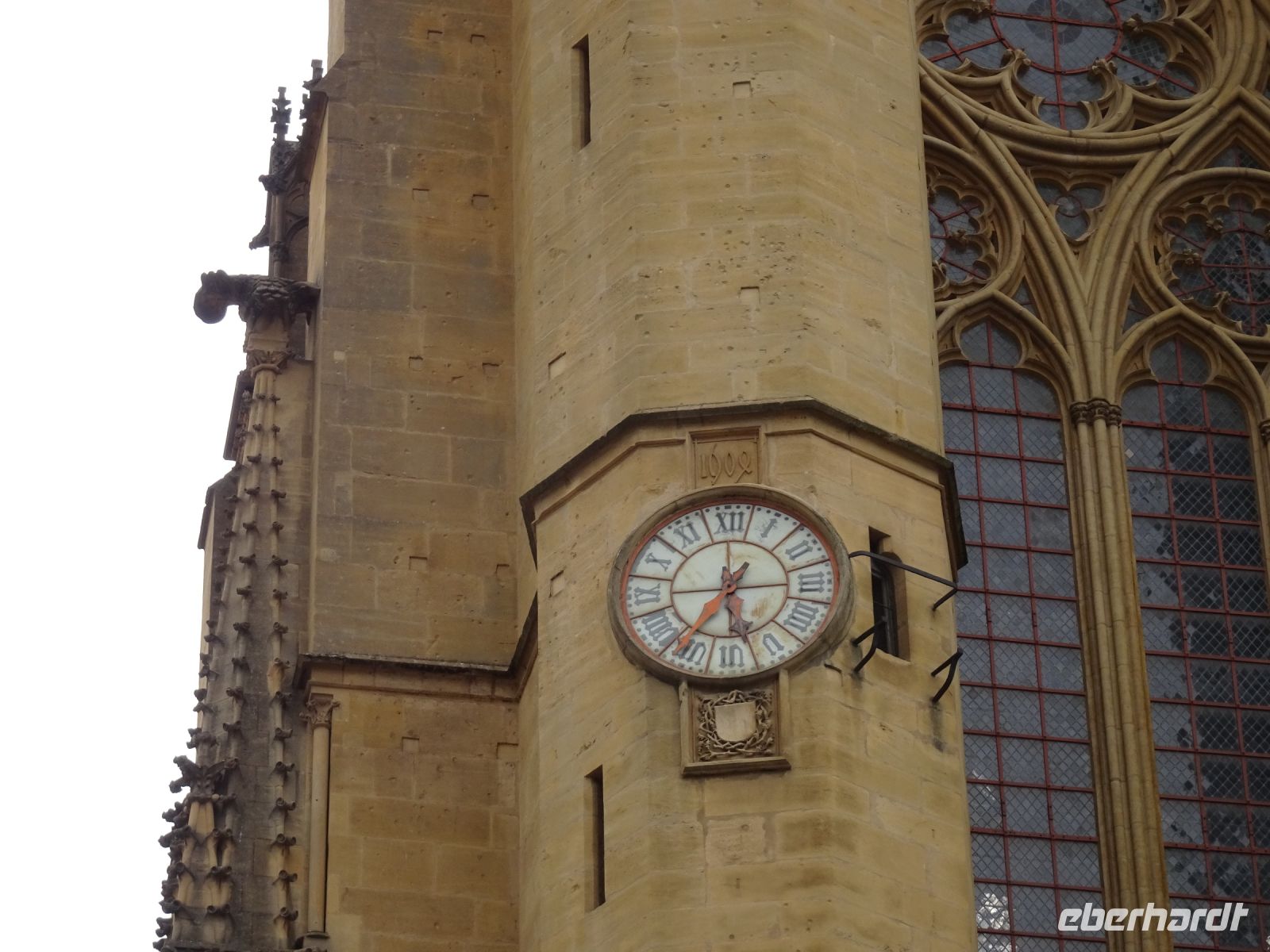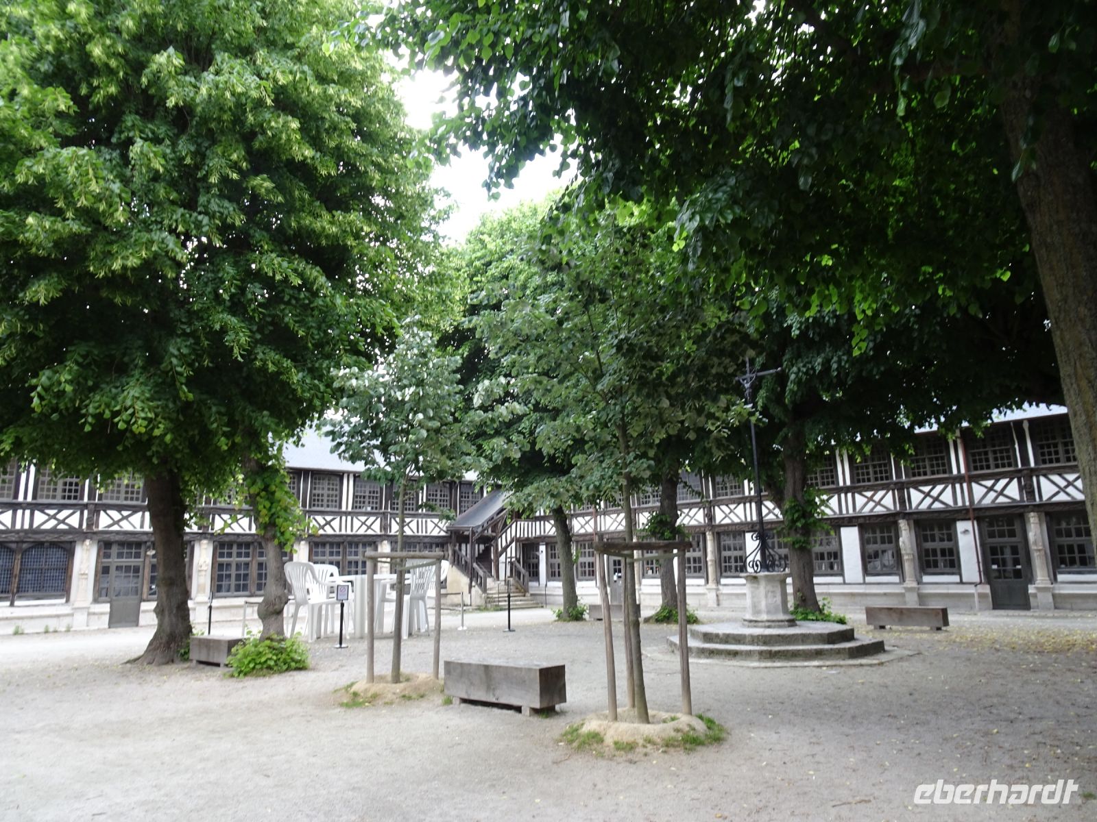 Nach der Besichtigung der Kathedrale spazieren wir weiter durch die Altstadt, vorbei an den schönen Fachwerkhäusern bis zum Altmarkt. Hier wurde Jean dÁrc 1431 zum Tode verurteilt und verbrannt. Weiter geht es in die Rue du Gros Horloge, eine belebte und beliebte Einkaufsstraße. In einem Torbogen über der Straße befindet sich (auf beiden Seiten) eine große astronomische Uhr aus dem Jahre 1389. Die Zifferblätter sind mit 24 Sonnenstrahlen geschmückt. Neben der Uhrzeit werden auch Mondphasen und Wochentage angezeigt.
